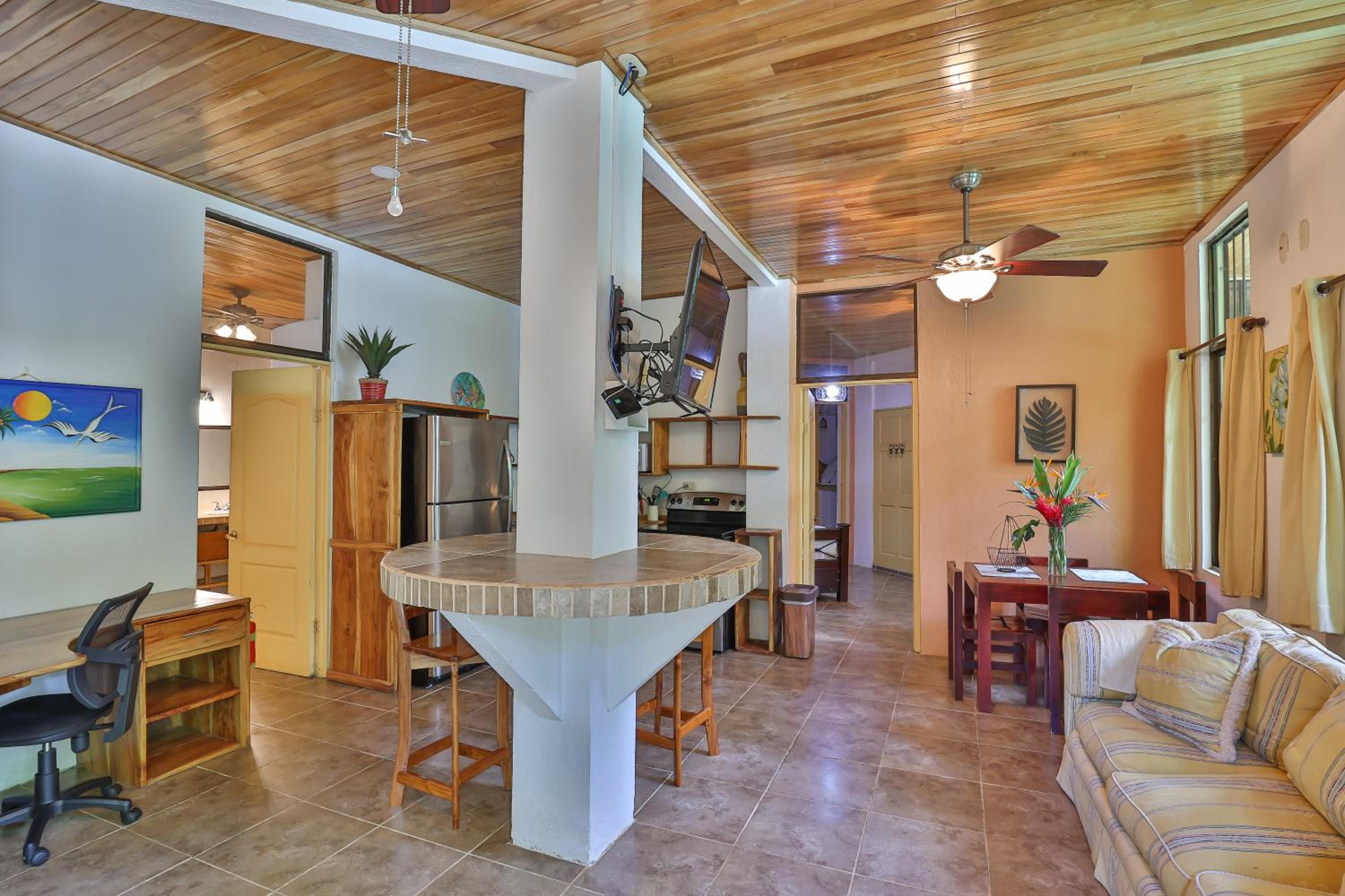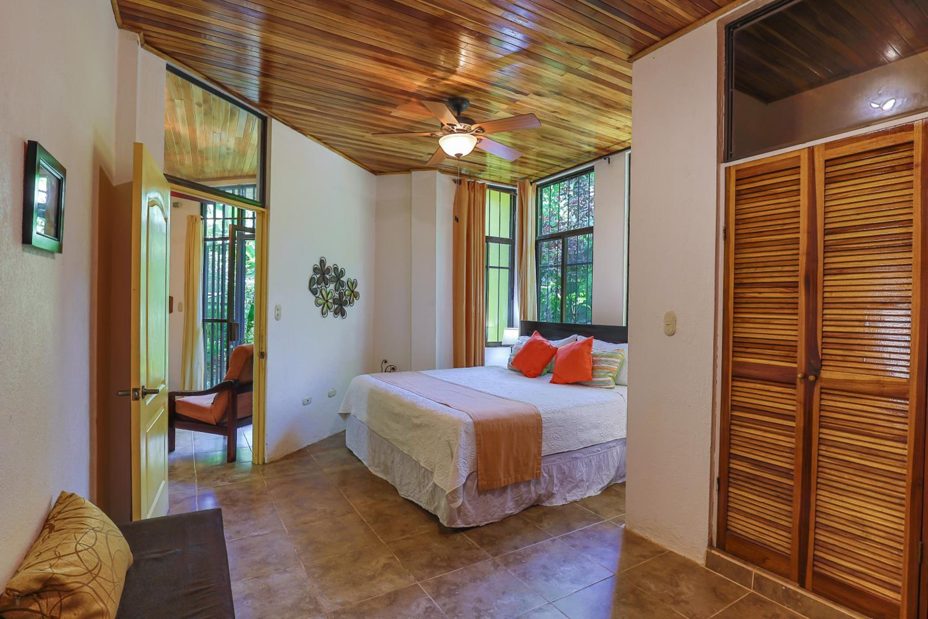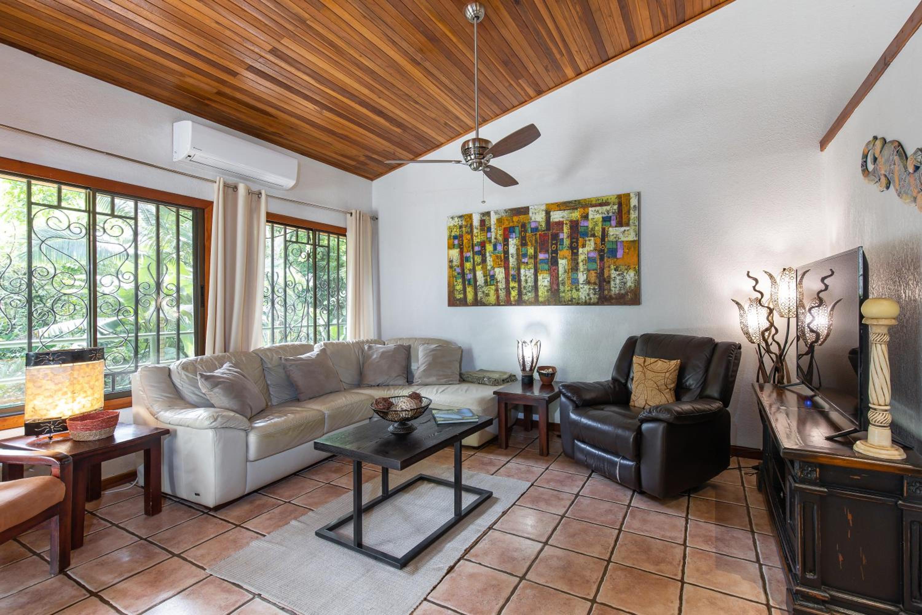 The house is up a quiet road which is nice. It was great for my family with three bedrooms and two bathrooms. It has a beautiful courtyard with a pool and is well kept. We saw some wonderful birds and wildlife from the back patio which was neat for people who aren't used to seeing things like toucans in the wild.