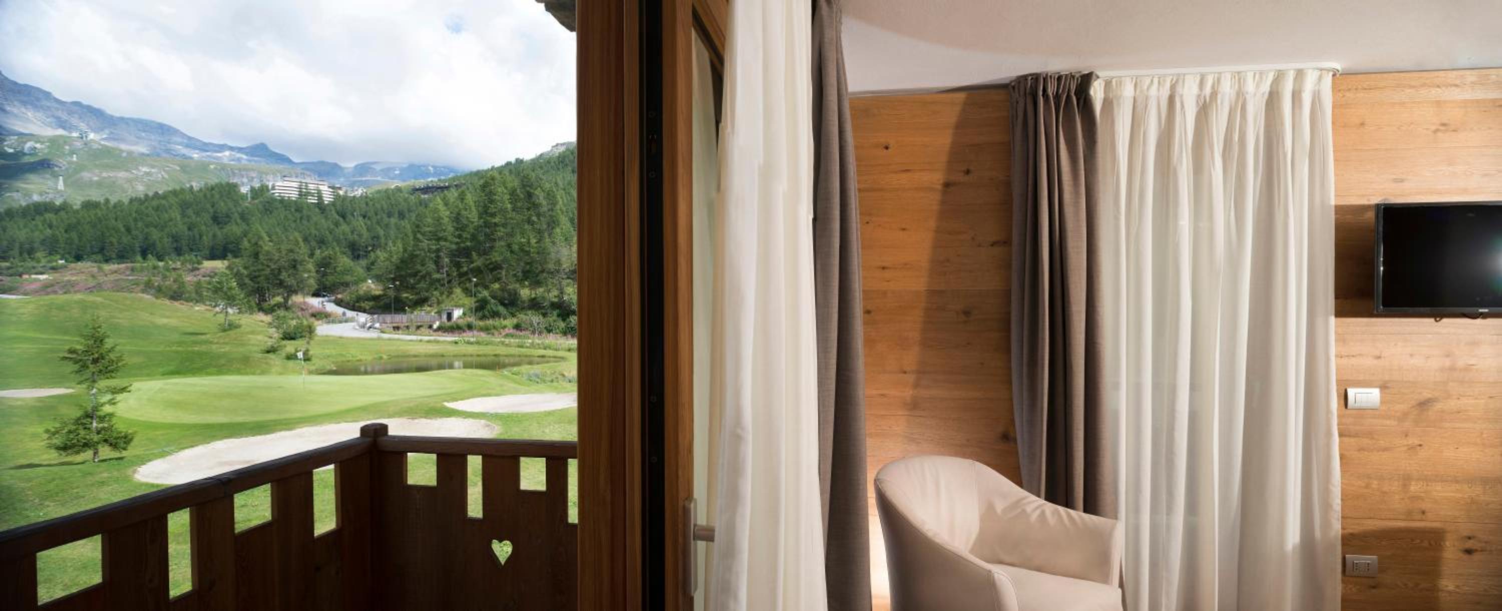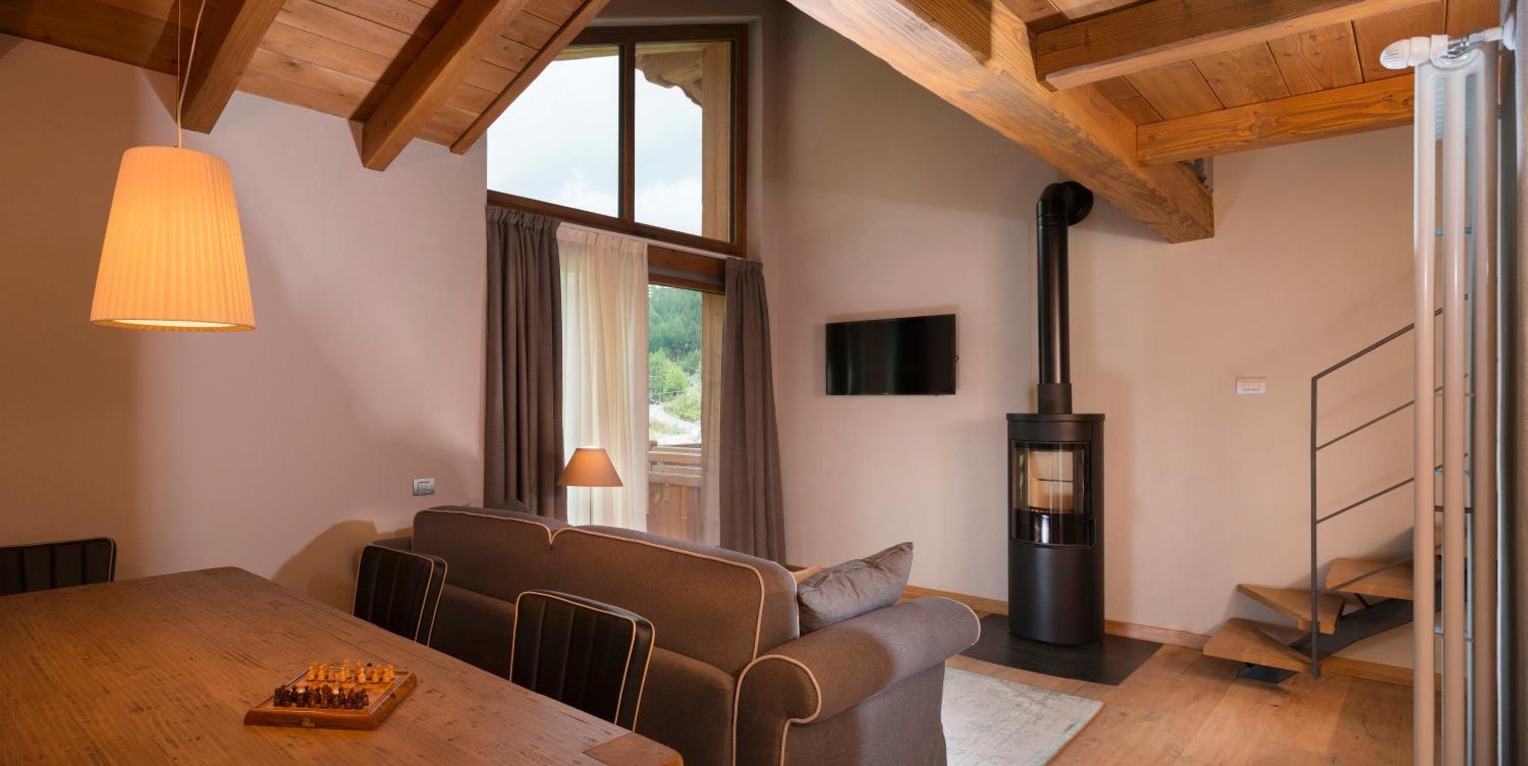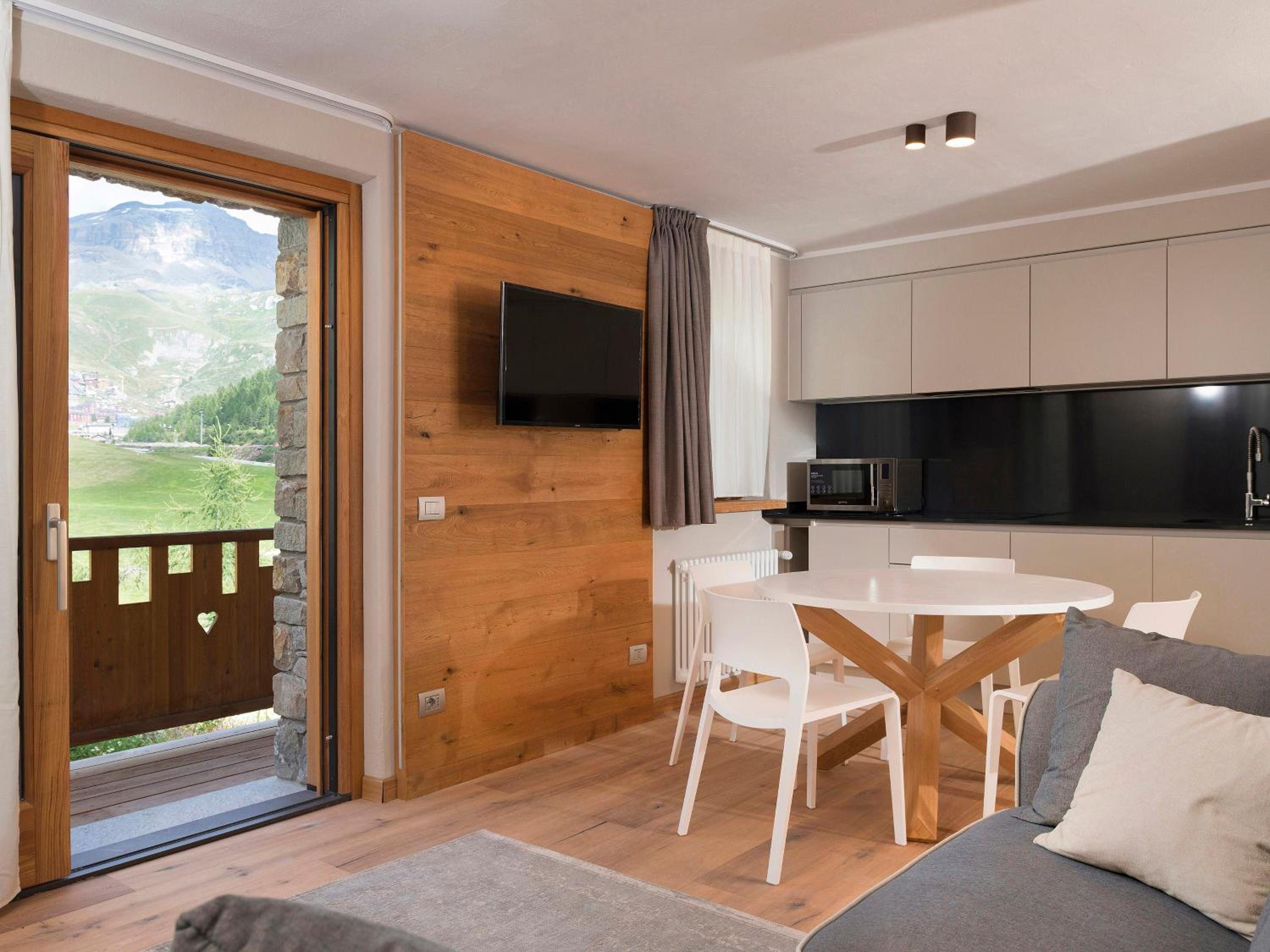 Luxurious Chalet Accommodation: Experience a 3-star stay just 9.2 km from Klein Matterhorn at 3 Chalets Aparthotel in Breuil-Cervinia. Enjoy stunning mountain views and modern amenities such as a fully equipped kitchen, flat-screen TV, and private balcony.