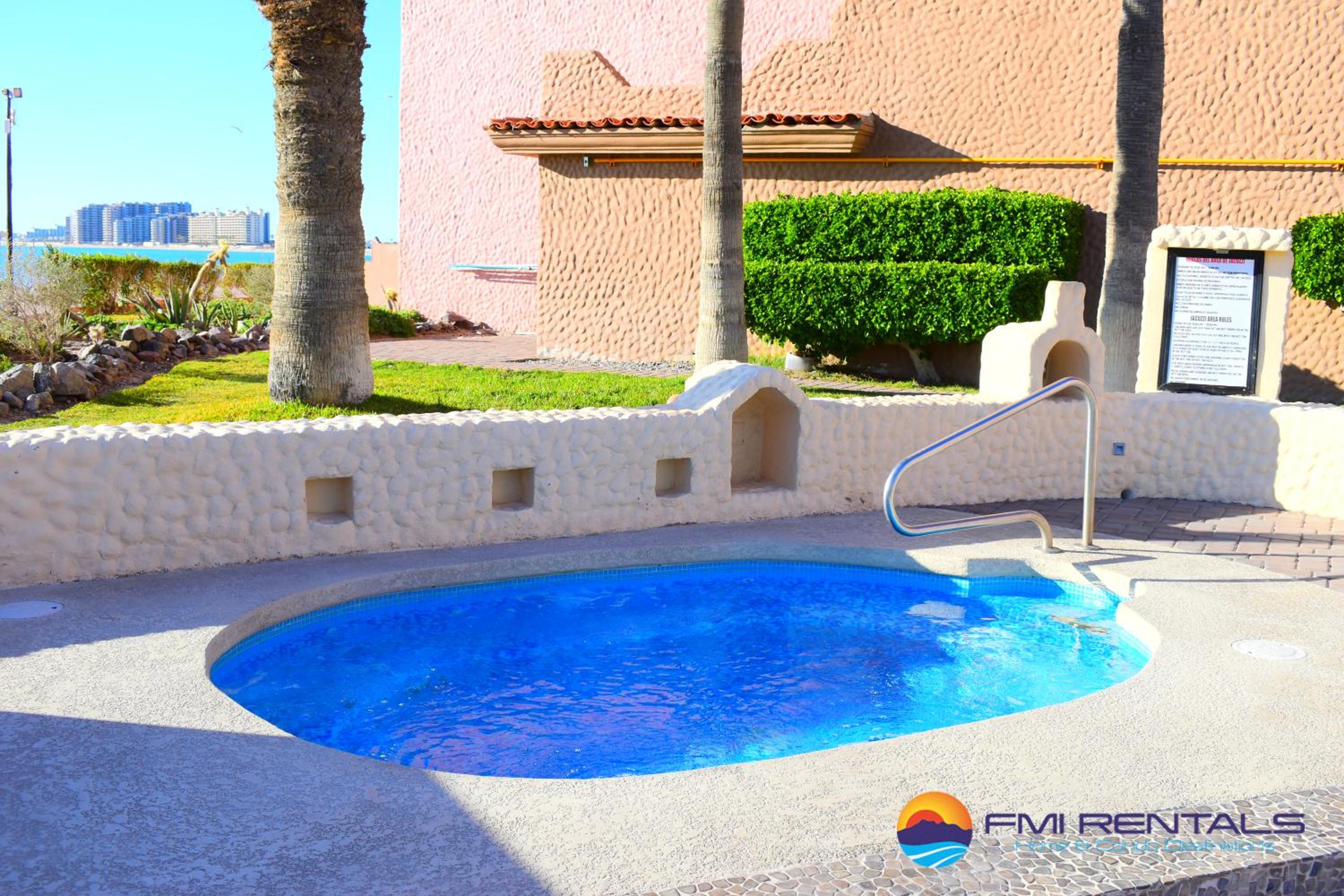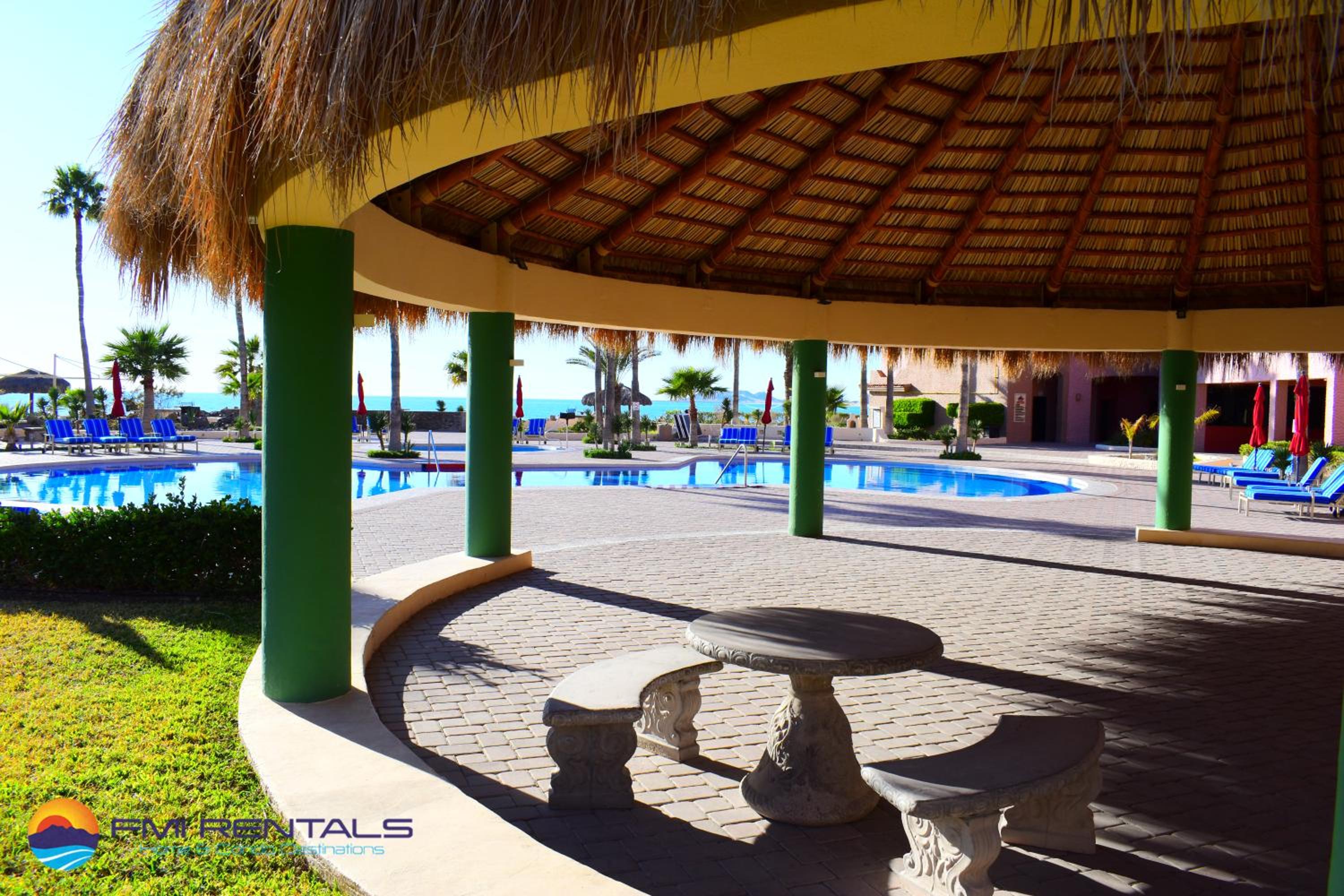 Unwind in Style: Enjoy the outdoor swimming pool, air conditioning, and outdoor fireplace at Marina Pinacate B-403. The spacious 2-bedroom aparthotel boasts a balcony with sea views, perfect for relaxation.