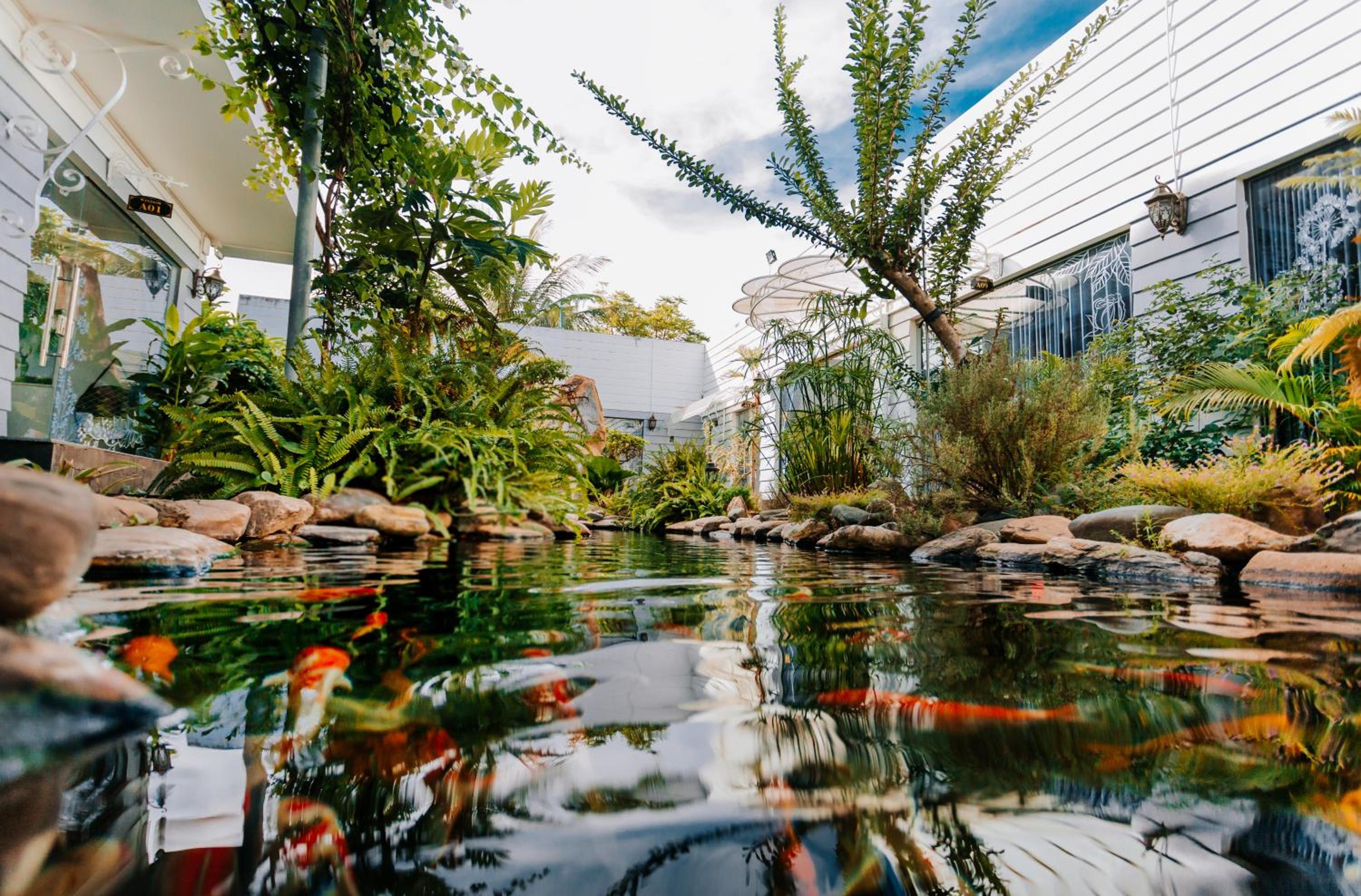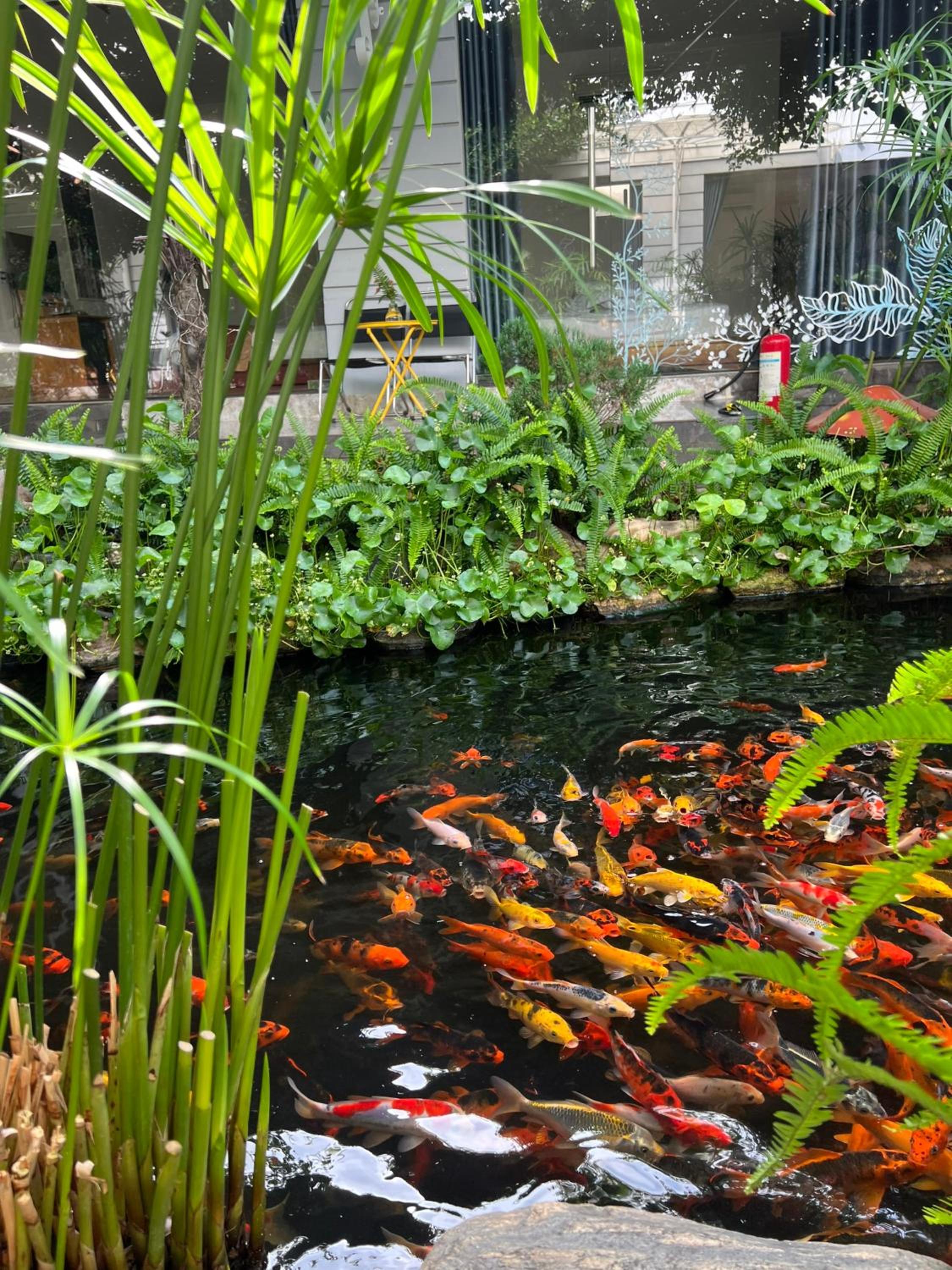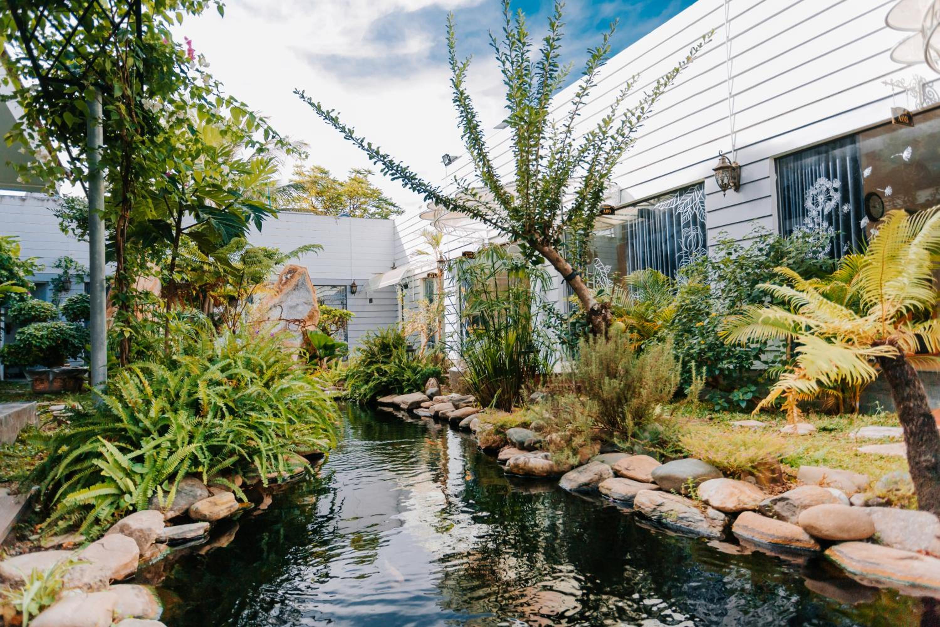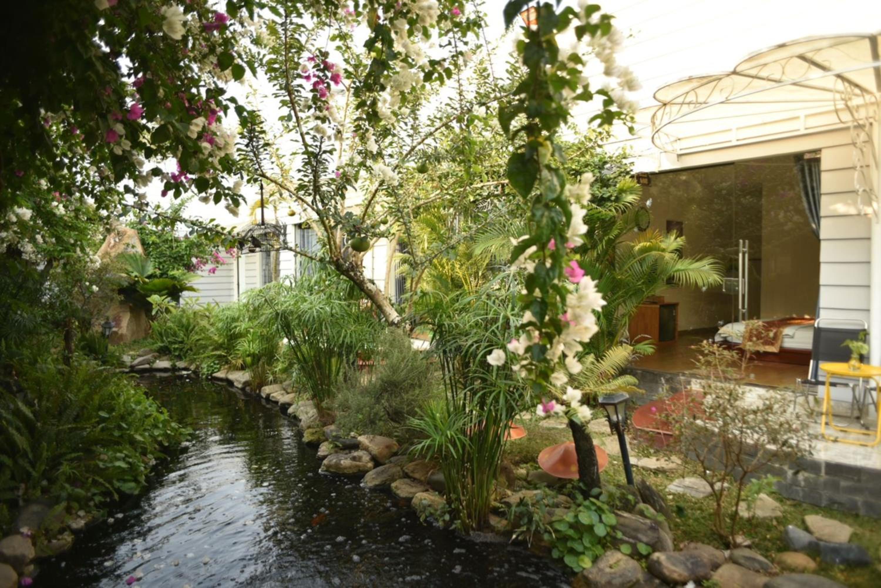 Die Zimmer haben jeweils ein großes Fenster (daher der Name des Homestays) mit Blick auf eine kleine schöne Gartenanlage mit Koi-Teich.