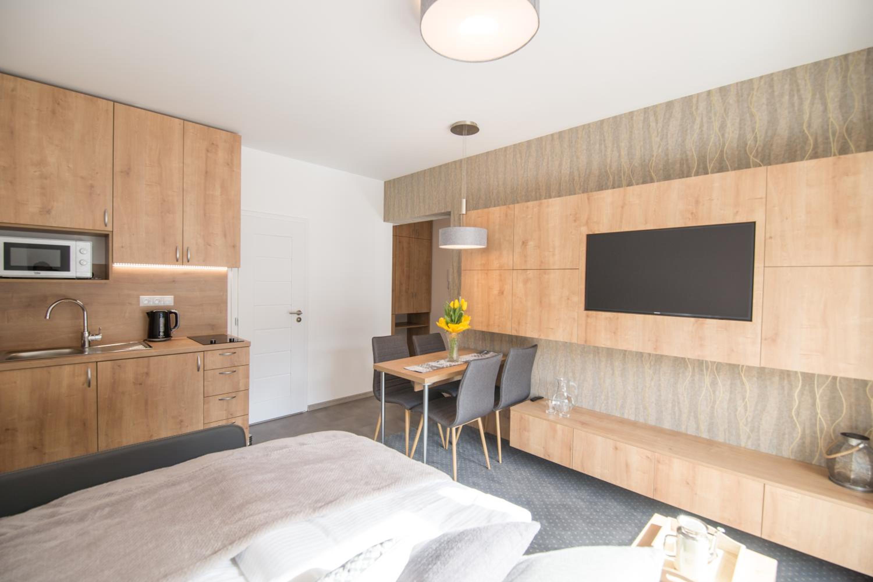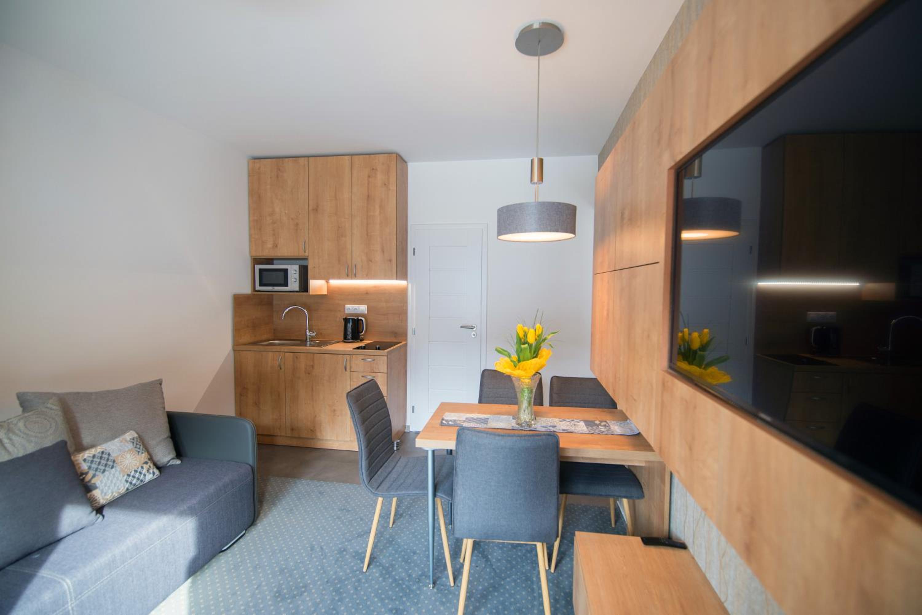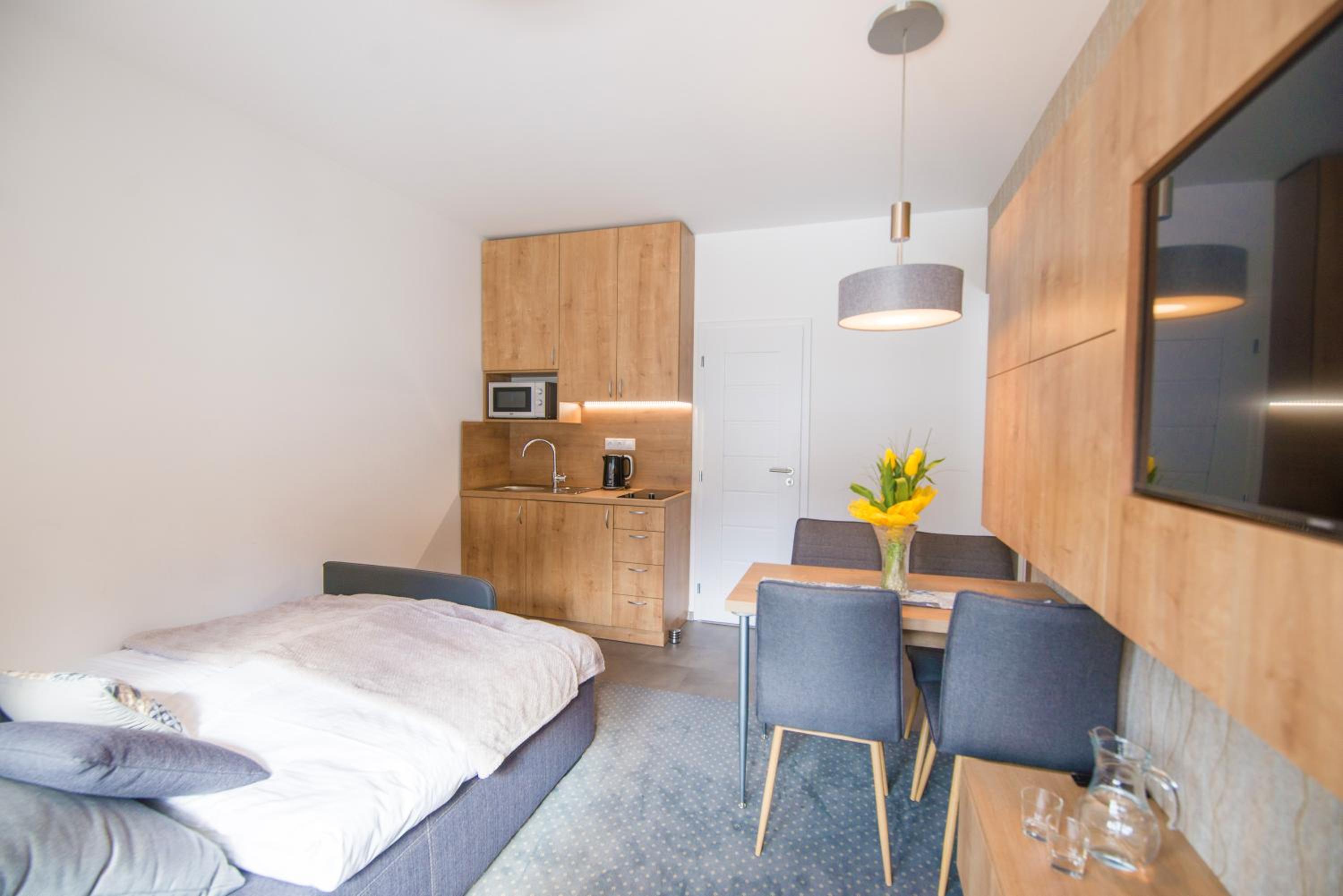 Doskonała lokalizacja tuż przy stoku, idealna na wyjazd narciarski. Bardzo wygodny dostęp do pomieszczenia na narty i buty narciarskie na parterze. Apartament niewielki, ale czysty, przyjemny i dobrze wyposażony, w dobrym stanie, bez oznak zużycia. W pokoju było bardzo ciepło.