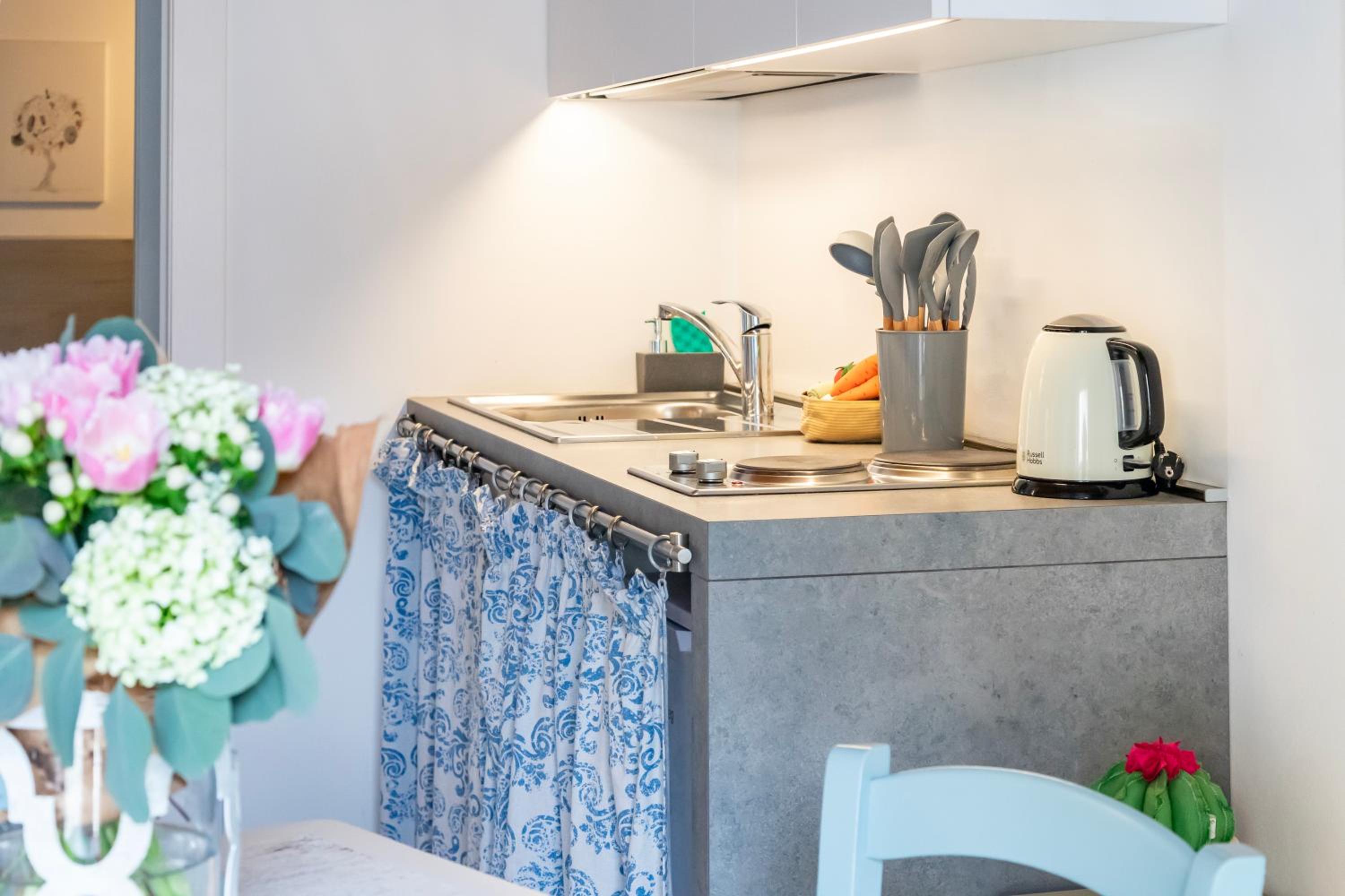Man hat einen, für eine kleine Unterkunft, großen Kühlschrank, zwei Zeranfelder, aber leider keinen Ofen. Ansonsten ist alles da, was man in einer Küche erwartet. Es ist alles ein wenig eng, zumindest in der Wohnung Carbonera.