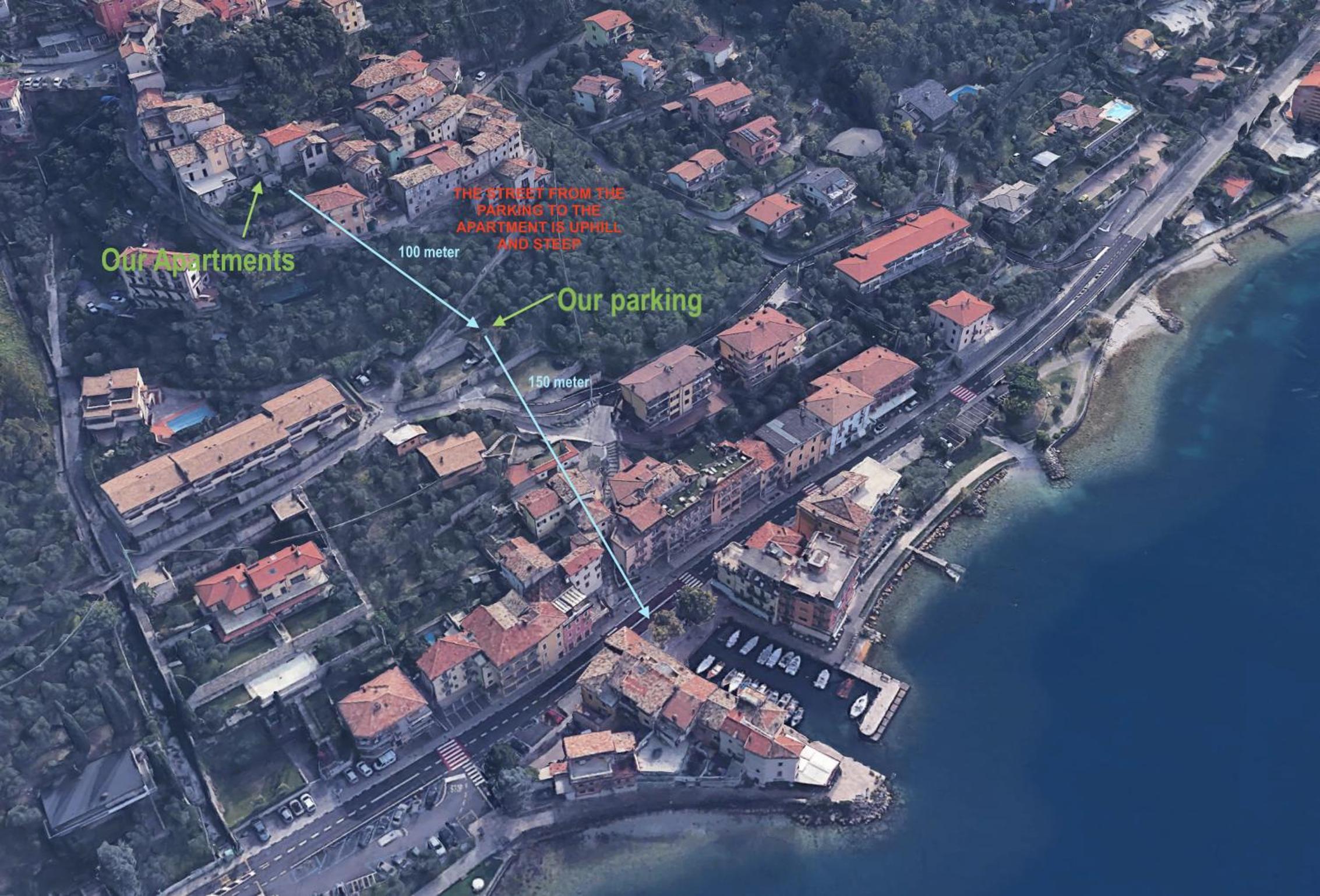 Die Unterkunft liegt nur ca. 10 Gehminuten vom Gardasee entfernt, allerdings ist es ein sehr steiler Aufstieg. Man hat allerdings einen kostenfreien Privatparkplatz mit dem Namen seiner Unterkunft. Bis zur FeWo sind es dann aber noch ca. 150 m (wie gesagt sehr steil). Allerdings wird man im vorhinein sehr gut von den Gastgebern über sämtliche Gegebenheiten informiert, man war also drauf eingestellt.