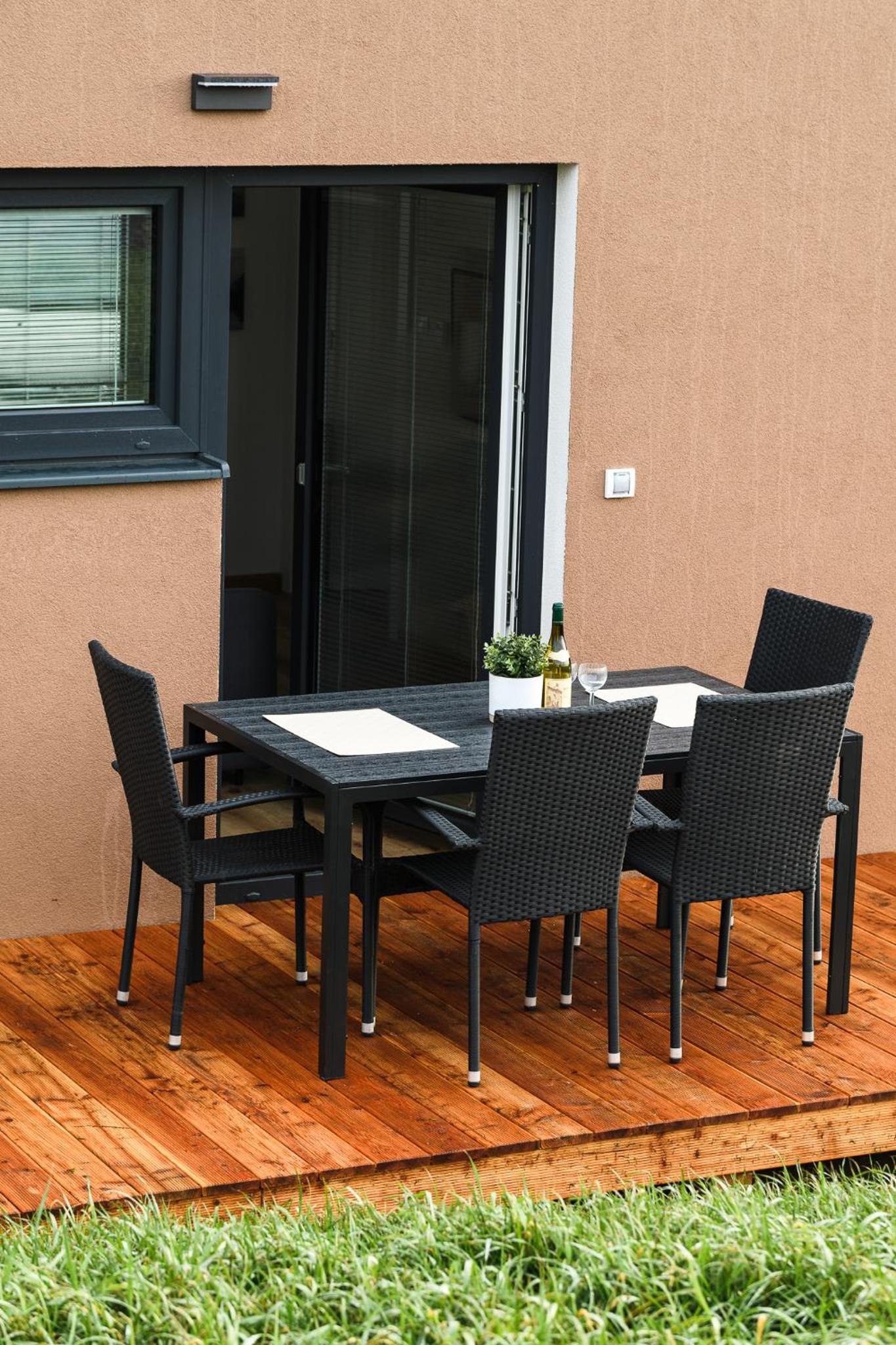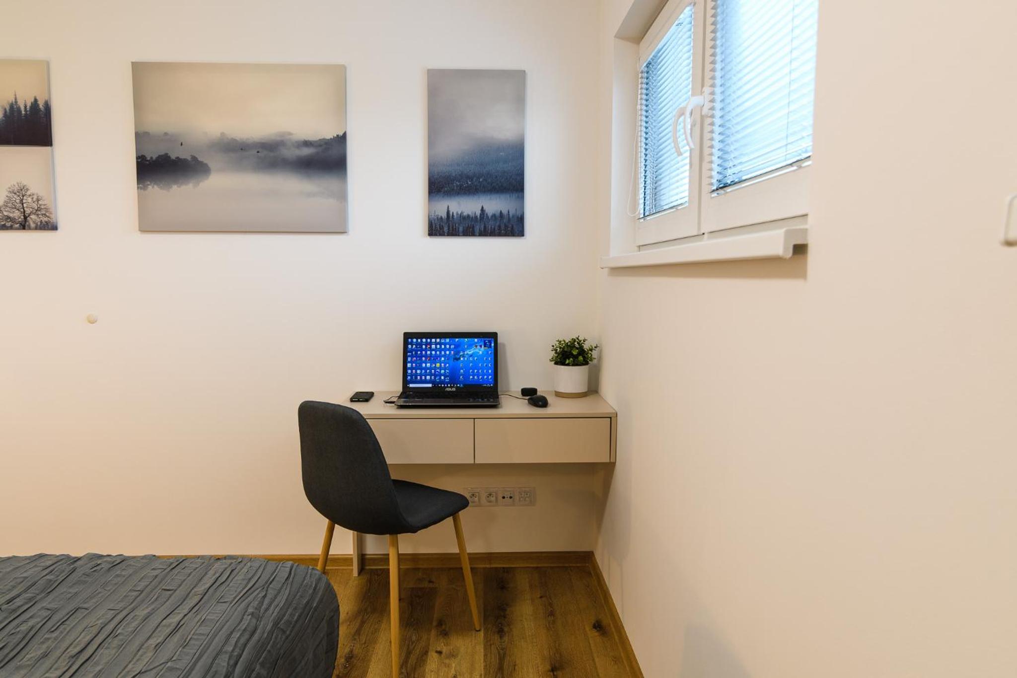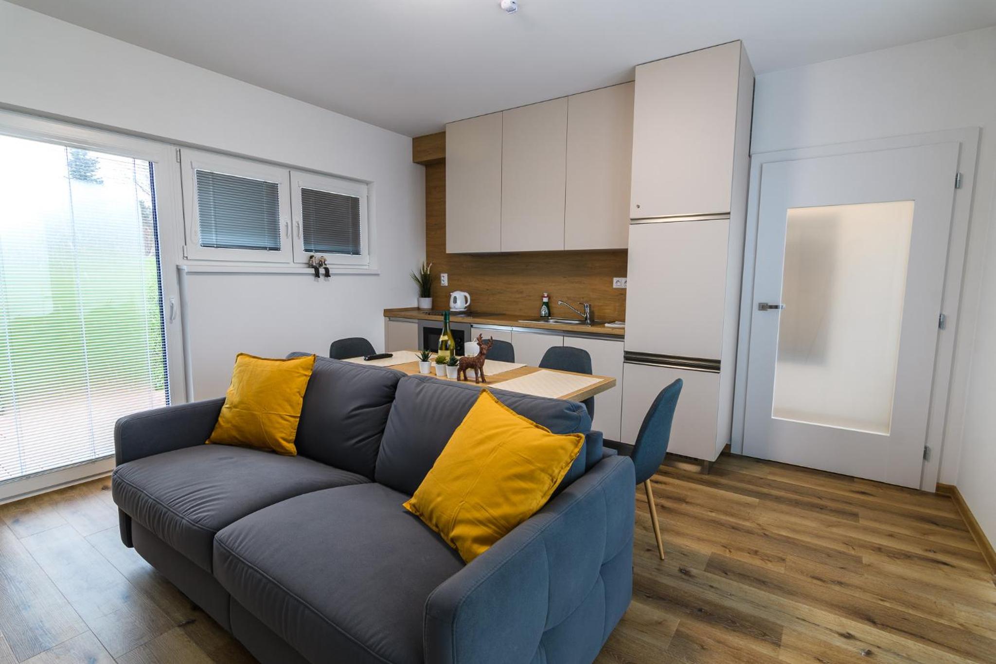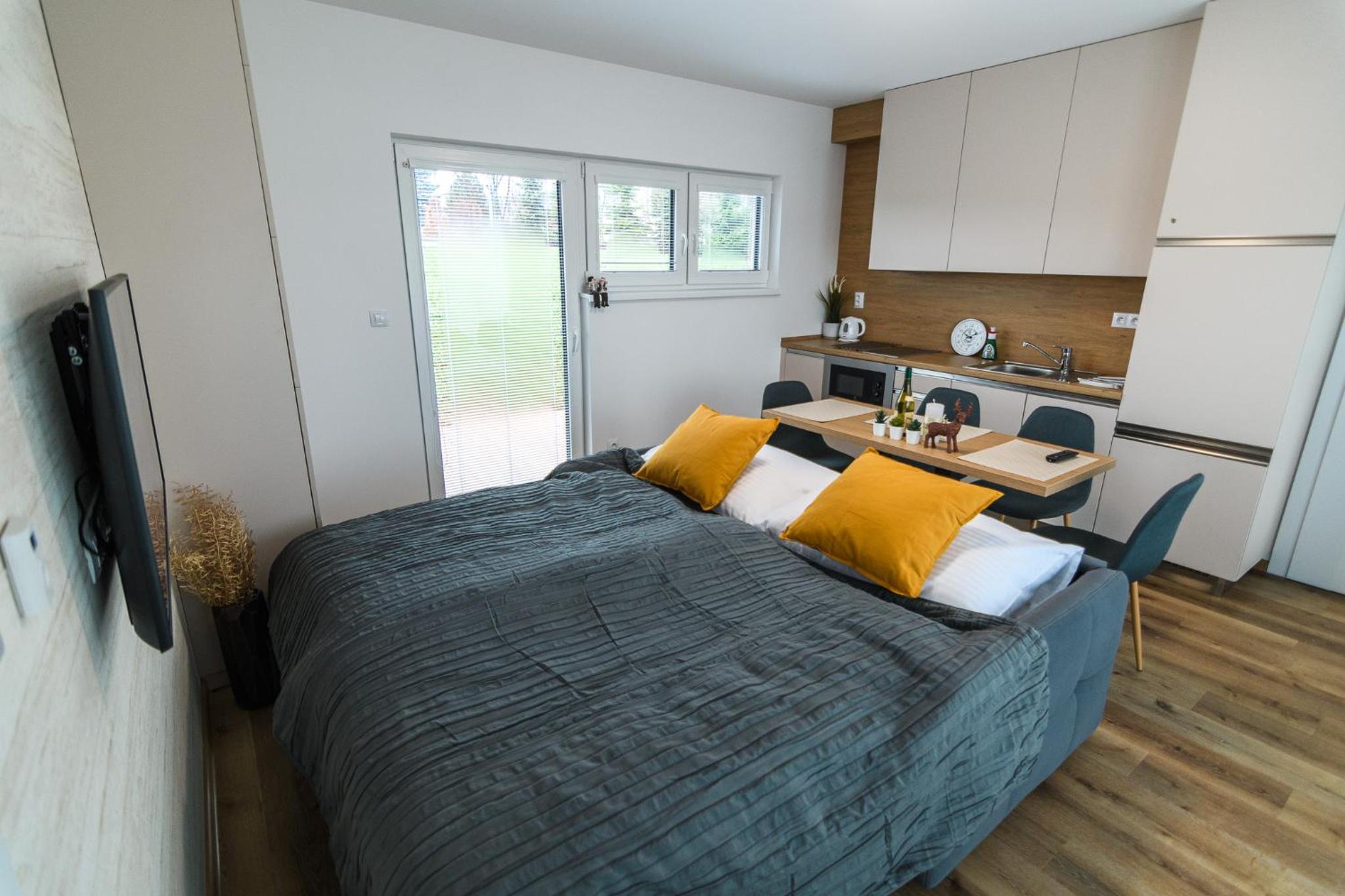 Strávili jsme zde týden. Naprosto parádní ubytování, které nám naprosto vyhovovalo a bylo pro nás dokonalé. Apartmány jsou umístěny v moc hezkých bungalovech. Apartmány se nám moc líbily, je to takový hyge styl. Vše je nové a hezké. Když jsme přijeli, bylo zde krásně zatopeno a teplo. V apartmánu perfektně uklizeno, všude čisto. Dokonce i žaluzie byly dokonale čisté. Je vidět že zde si dávají záležet. Nám se moc líbily okení dveře s možností východu z obýváku přímo před apartmán, krásná dřevěná teráska. Parkování vyhrazené přímo před každým apartmánem. Dostatek úložných prostorů. Kuchyň dostačující, dobře vybavena nádobím. K dispozici chytrá televize a velice rychlé a kvalitní wi-fi. V ložnici k dispozici dvoupostel (přistýlka v obýváku na rozkládatelném gauči). Madrace pěkně tvrdé, pro nás vyhovující, moc pohodlné. Prostorná koupelna s velkým sprchovým koutem. Možnost ubytování se psem. Plně bezkontaktní ubytování, apartmán se otevítá PINem. Před ubytováním poslán manuál k apartmánu, kde je vše vysvětleno. V okolí spousty krásných míst na procházky s kočárkem, a s hafanem. Jak říkám, my jsme zde byli nadšení, a kdykoliv se v Novém Městě na Moravě zase ocitneme, velice rádi se sem vrátíme. A můžeme jenom doporučit.