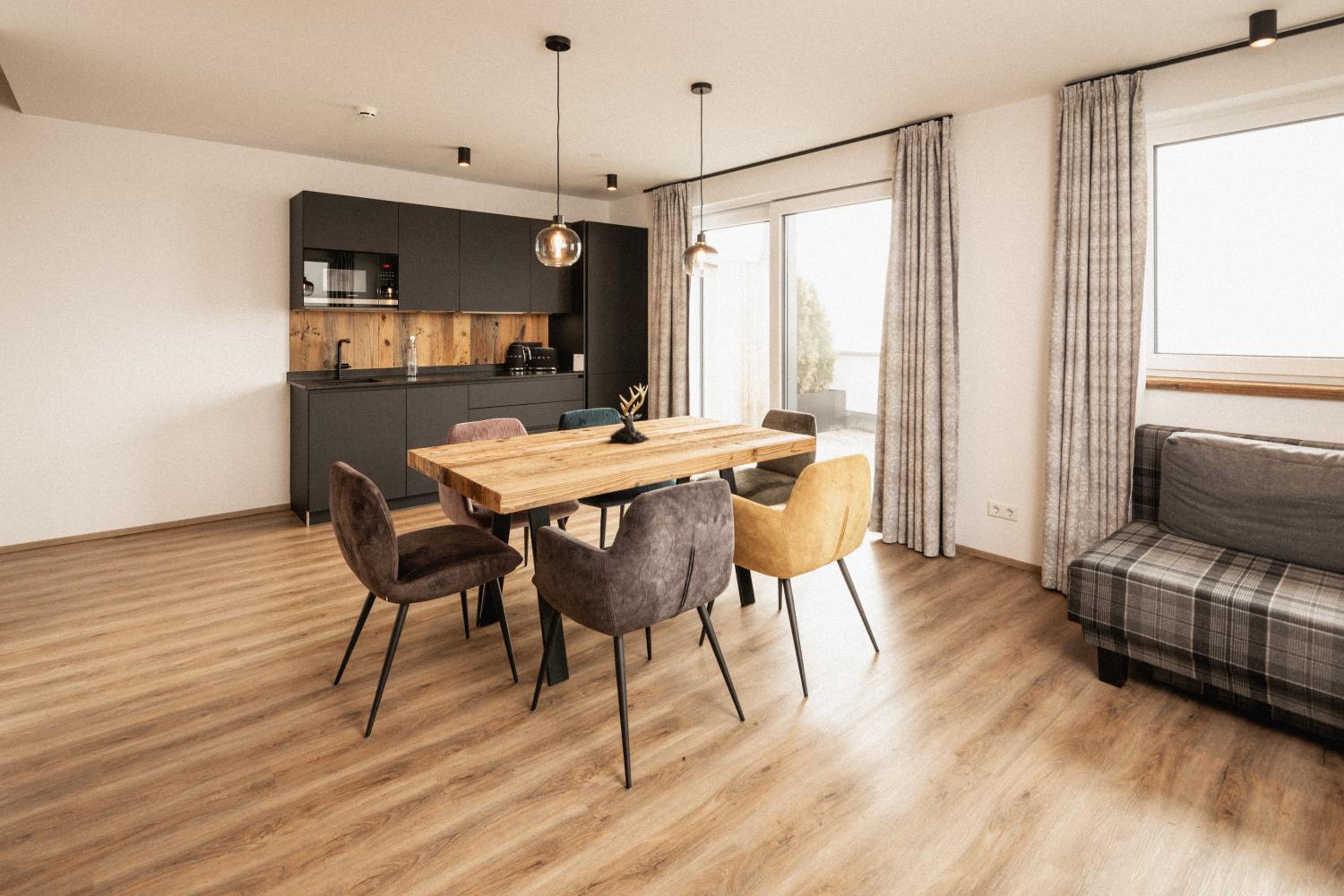 The modern units at Das Liftplatzl are designed for comfort and relaxation, featuring wooden floors, balconies or terraces with stunning mountain views, and fully equipped kitchens or kitchenettes.