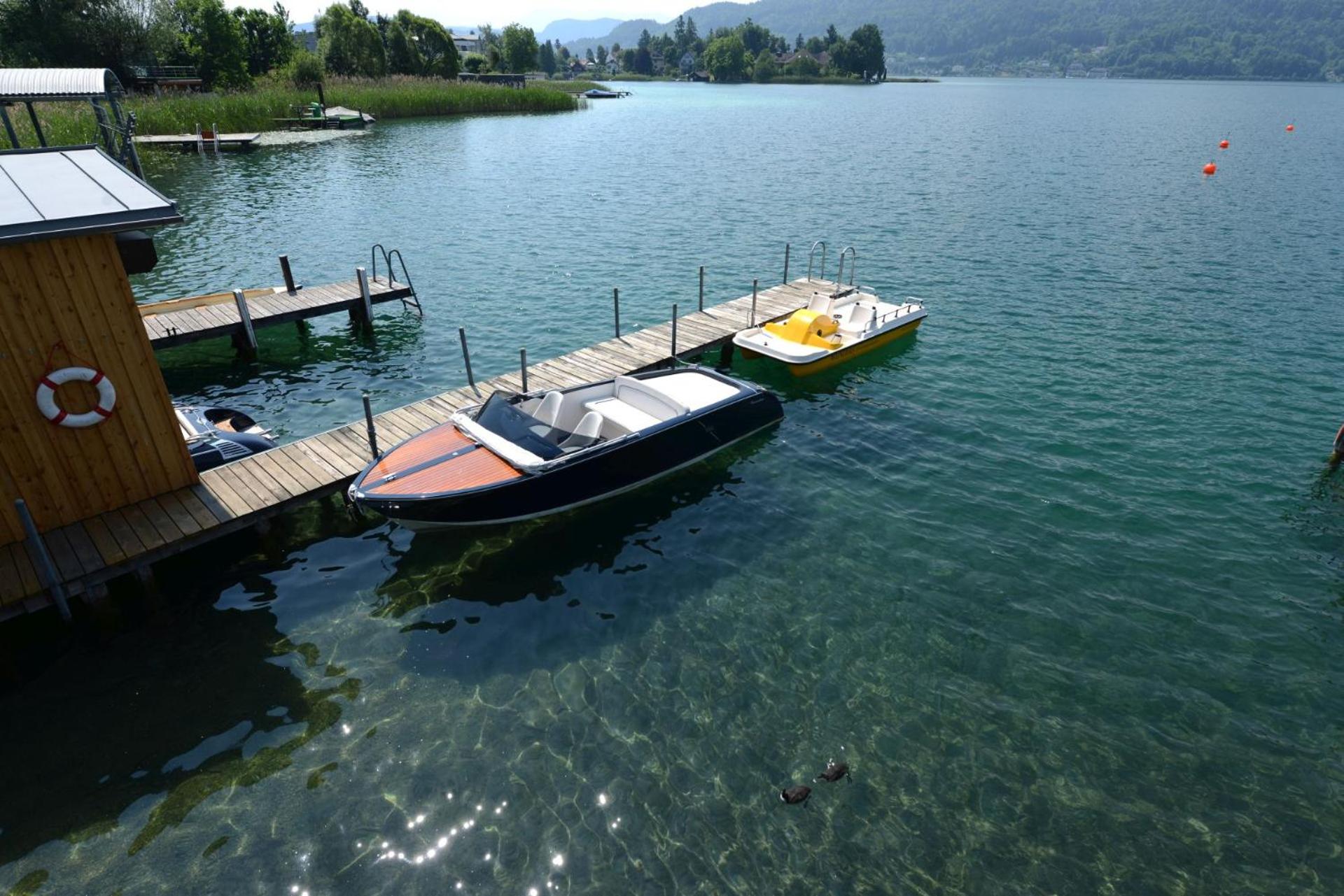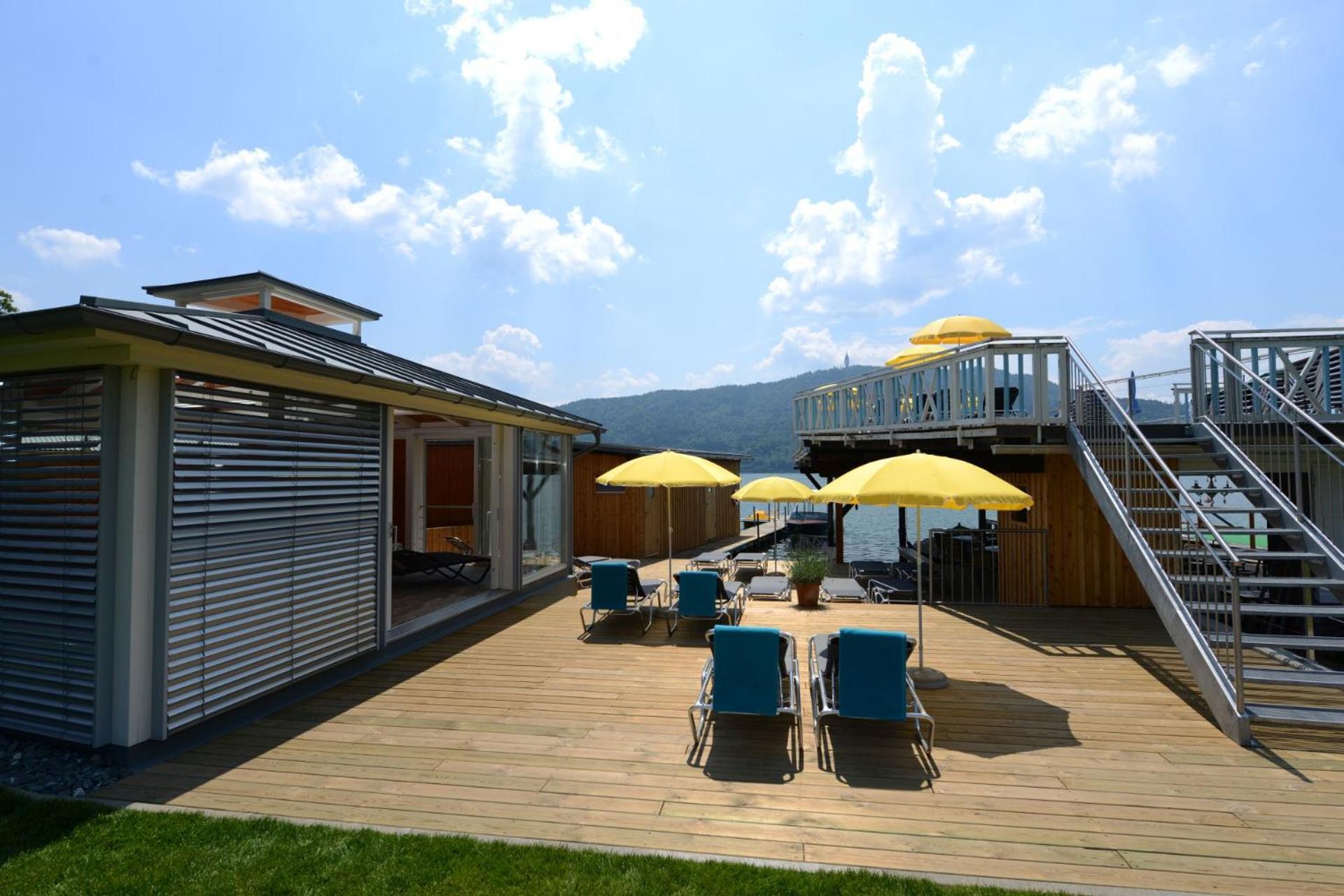 Enjoy exclusive access to a private beach on Lake Wörth, complete with a sunbathing lawn, sunshades, and deckchairs for the ultimate relaxation experience.