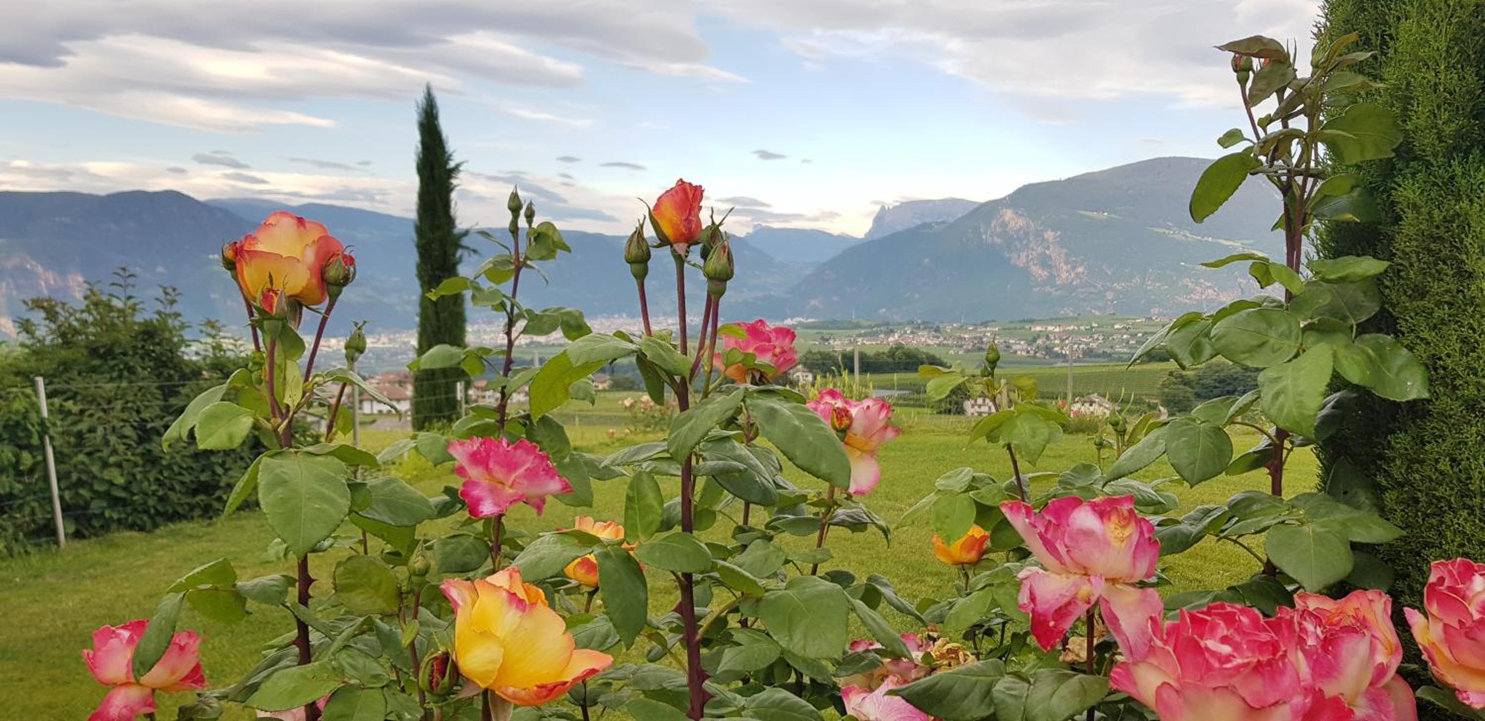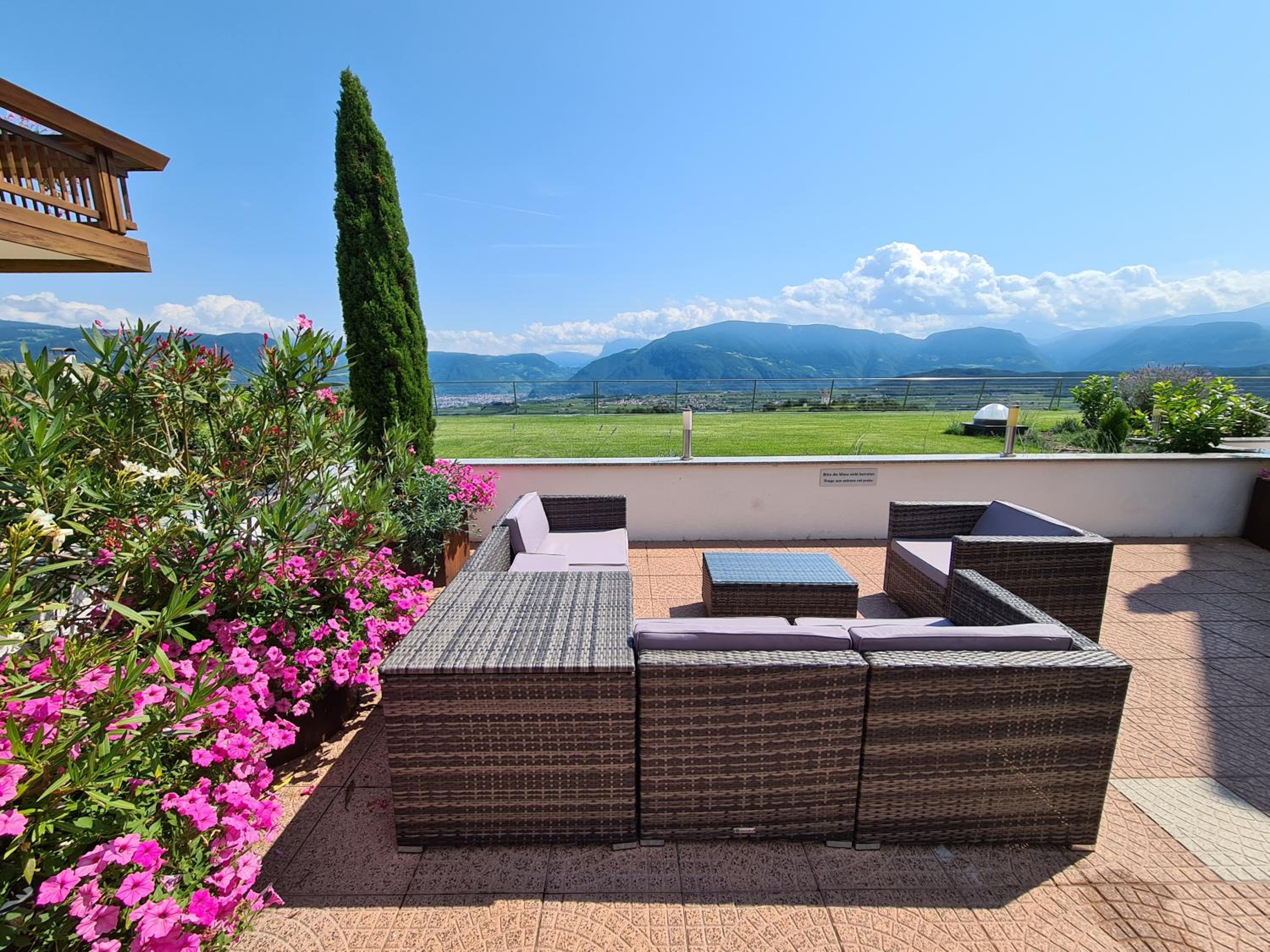 Ferienwohnung. Eigenes Frühstück auf Terrasse mit Sicht auf Pozen und Dolomiten.