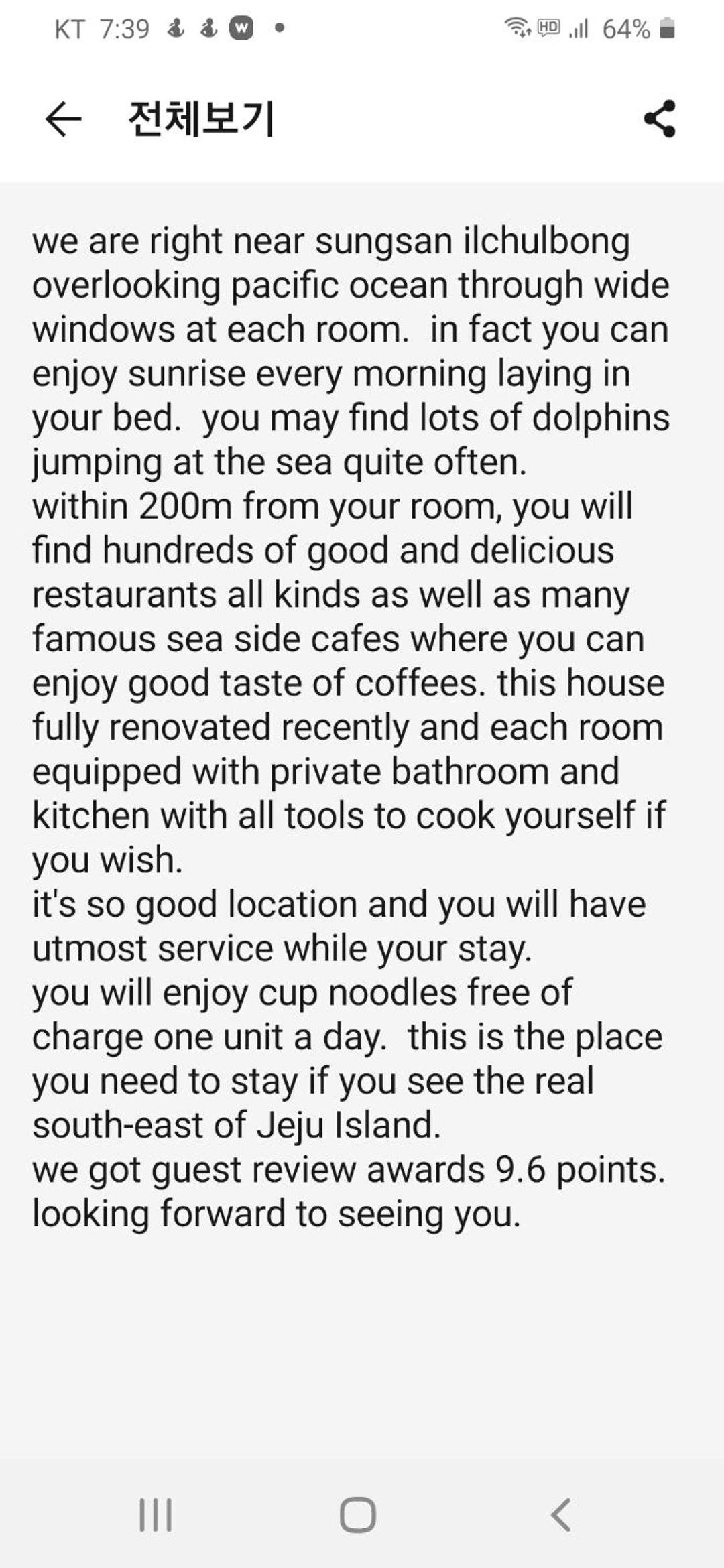 Love the location! We came in late at night so it was a bit tricky finding the property. Woke up early to hike Seongsan ilchulbong to watch sunrise. Little did we know, we can watch it from our room! Didn’t realize until we got back, broad daylight that the backyard of the property has a STUNNING JAW-DROPPING view!!!!! Proper ghost is also excellent! Thank you for sharing your place with us.