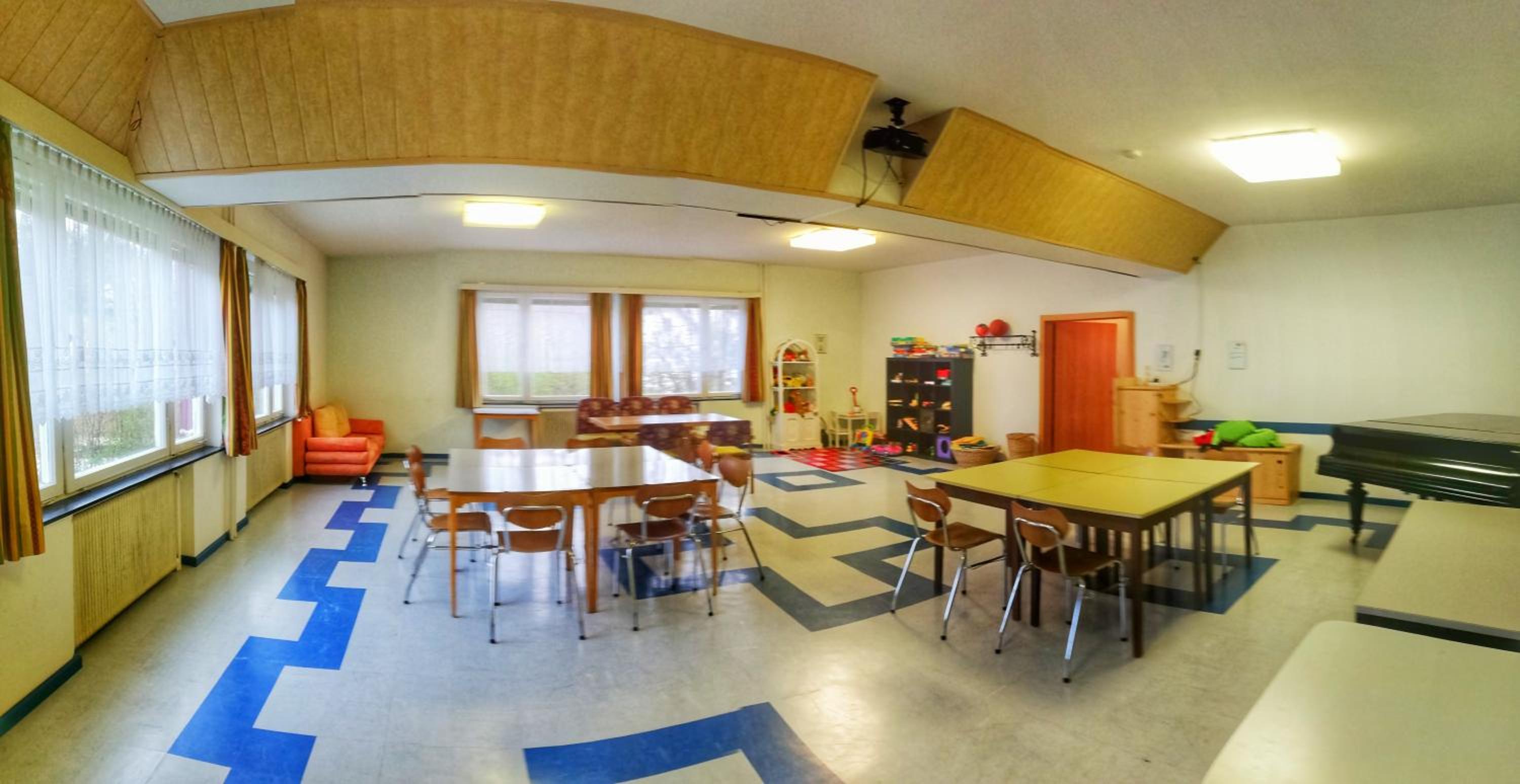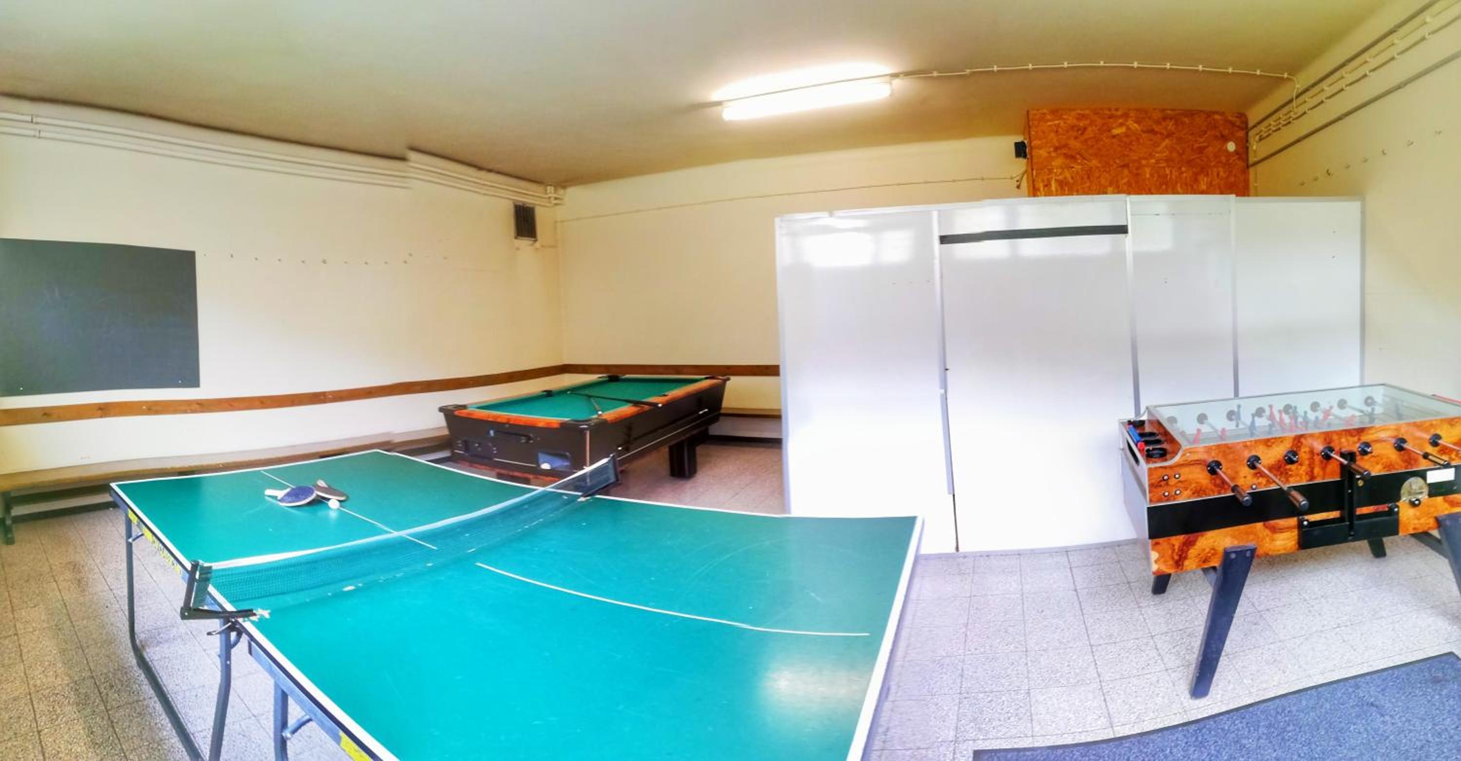 Großer Gemeinschaftsraum mit Spielen und einer liebevoll eingerichteten Spielecke für Kinder.