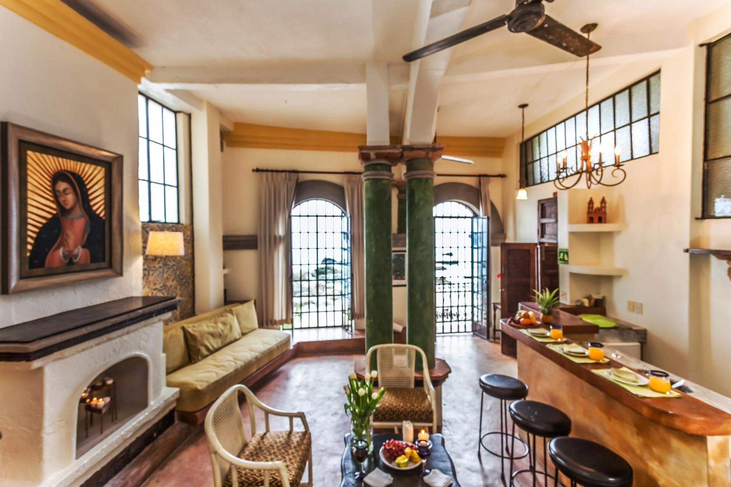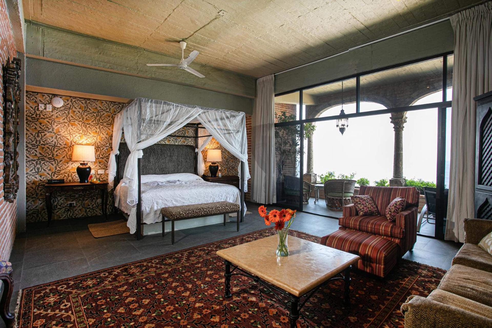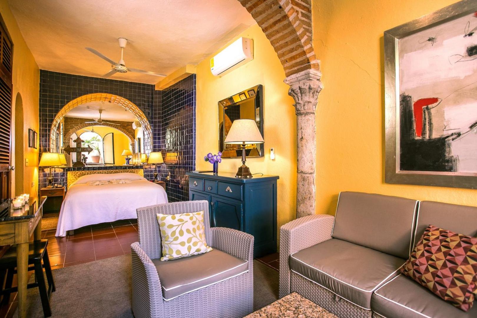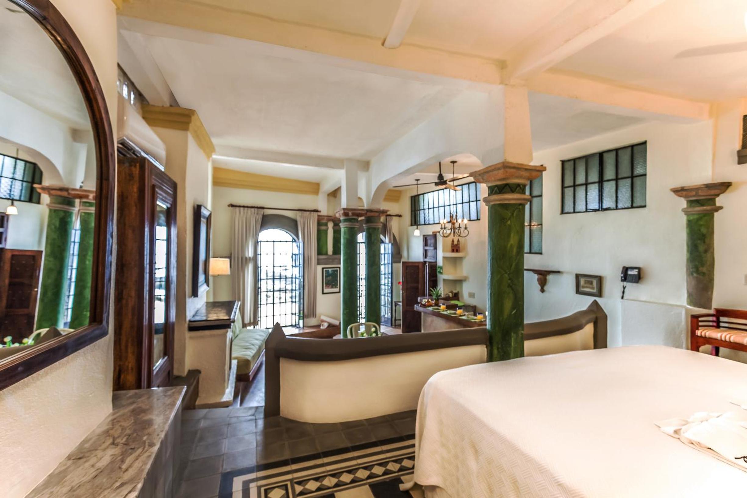 Elegant Suites with Ocean Views: Step into classic Mexican elegance with antique furniture and balconies overlooking the ocean. Enjoy modern amenities like free Wi-Fi, coffee makers, and kitchen facilities in most suites.