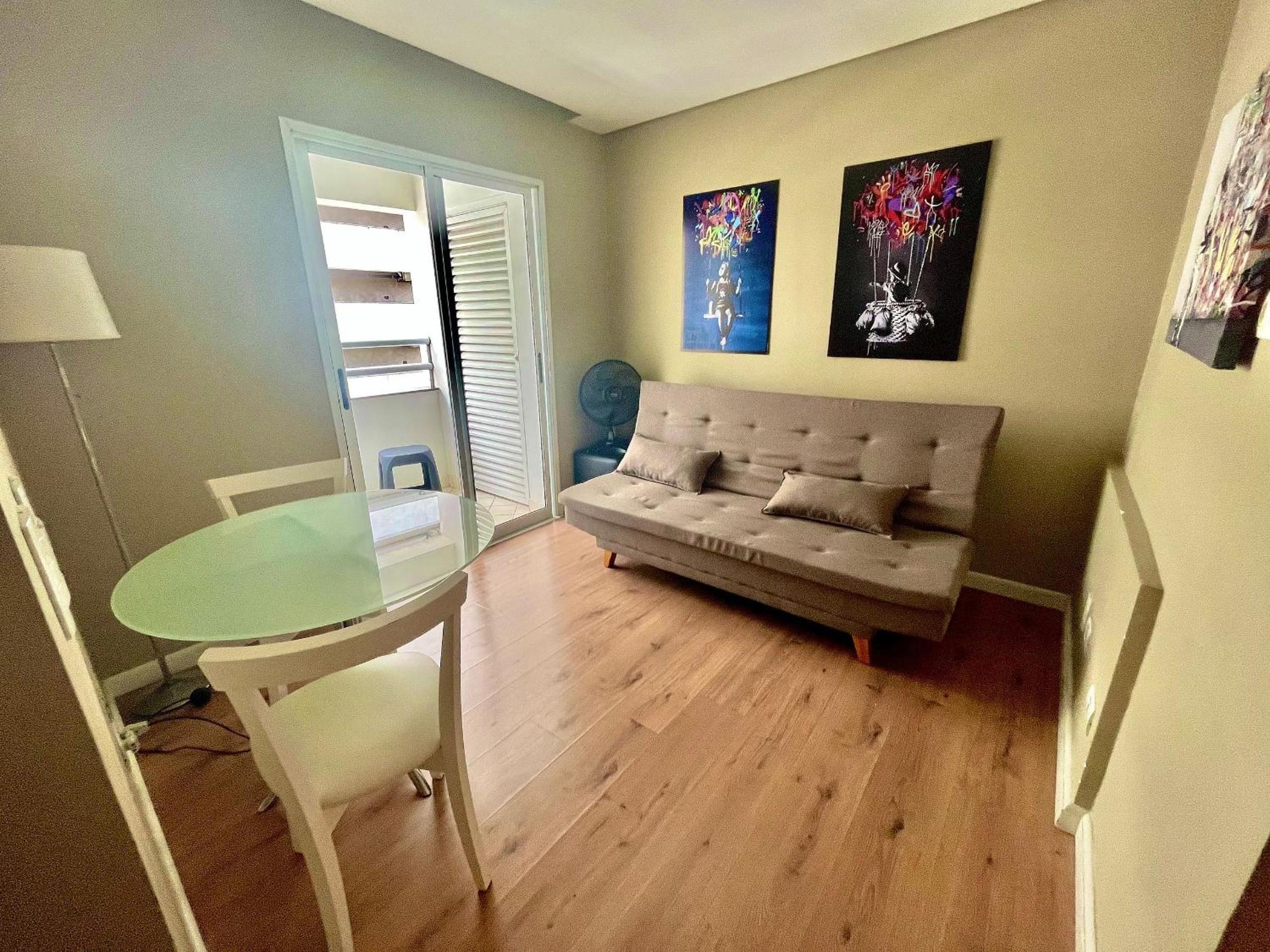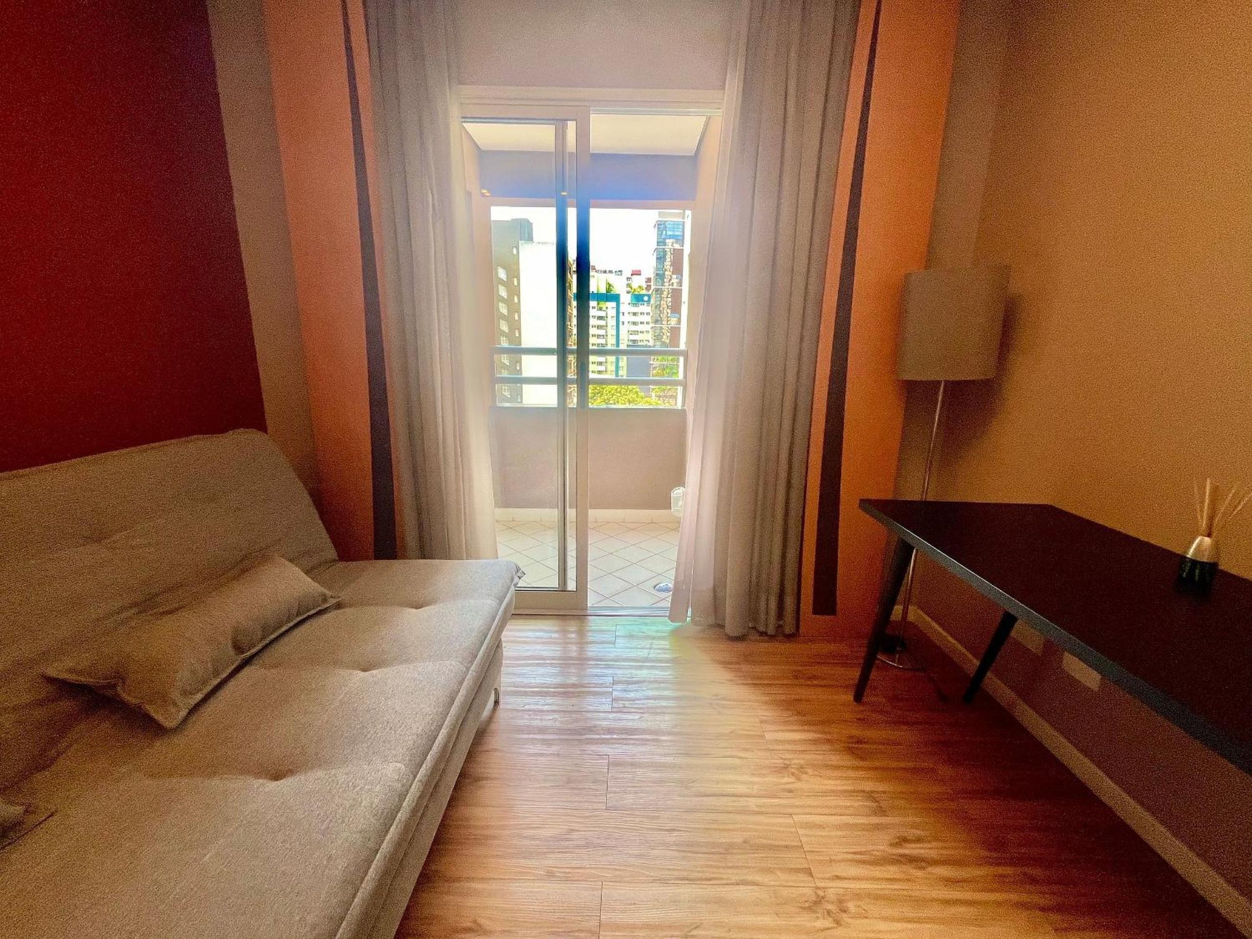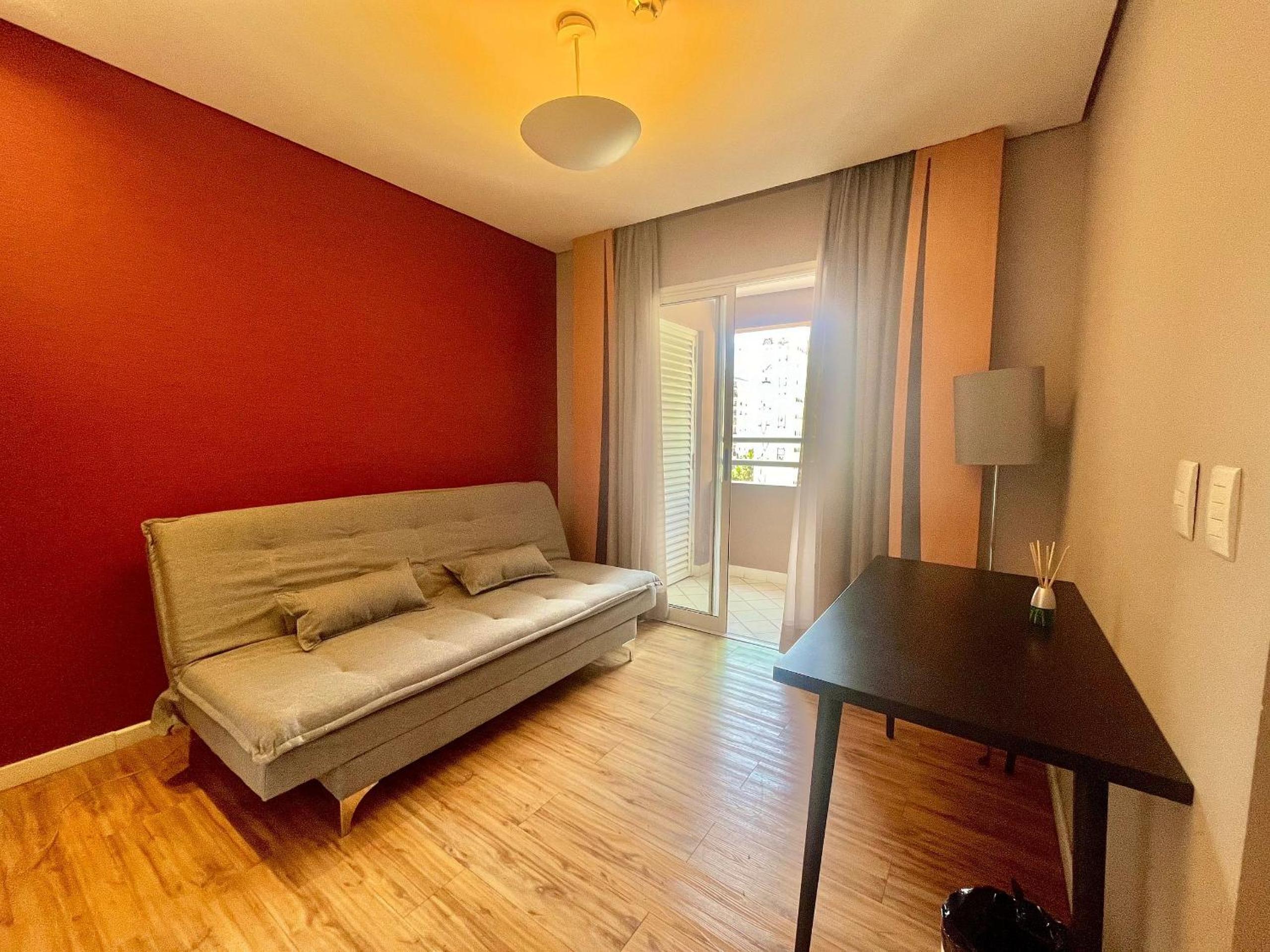 Vaga estreita do estacionamento. O sofá cama não era confortável, ainda bem que a cama era grande e minha filha dormiu na cama de casal.