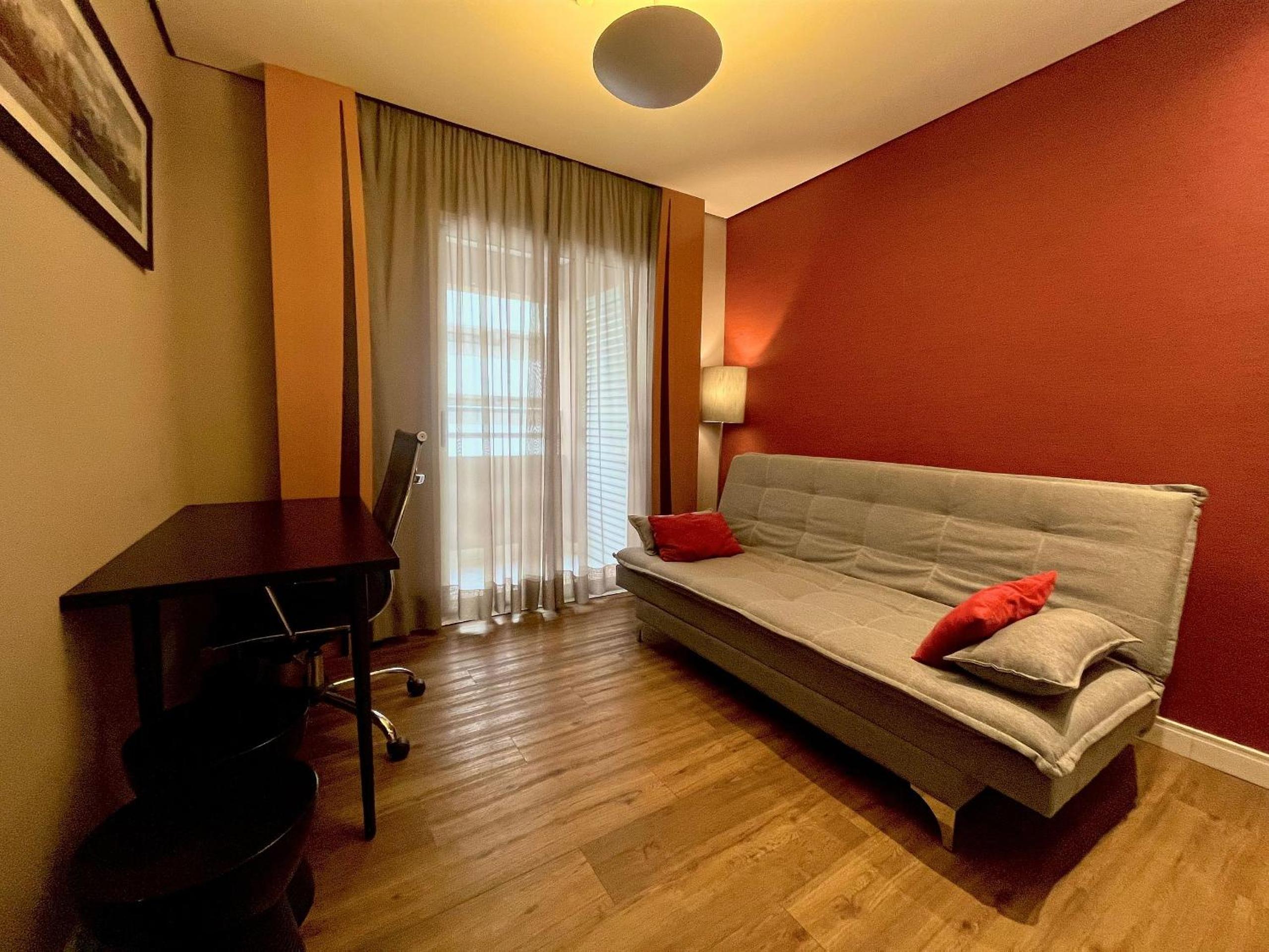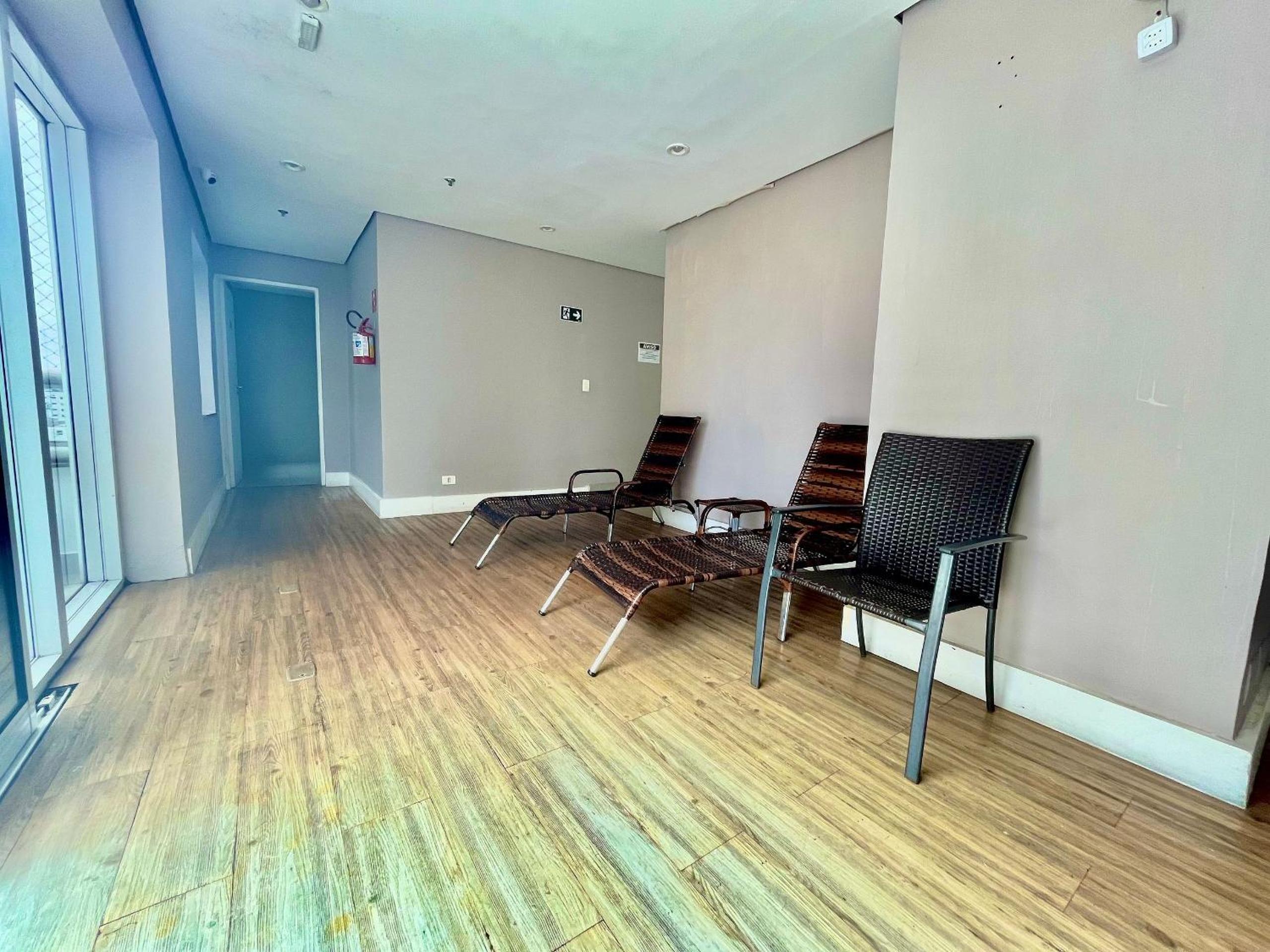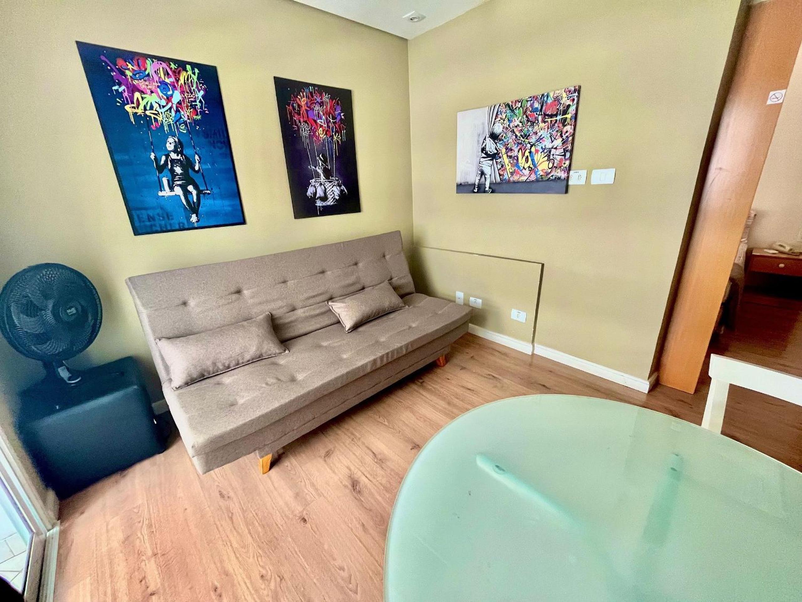 Vaga estreita do estacionamento. O sofá cama não era confortável, ainda bem que a cama era grande e minha filha dormiu na cama de casal.