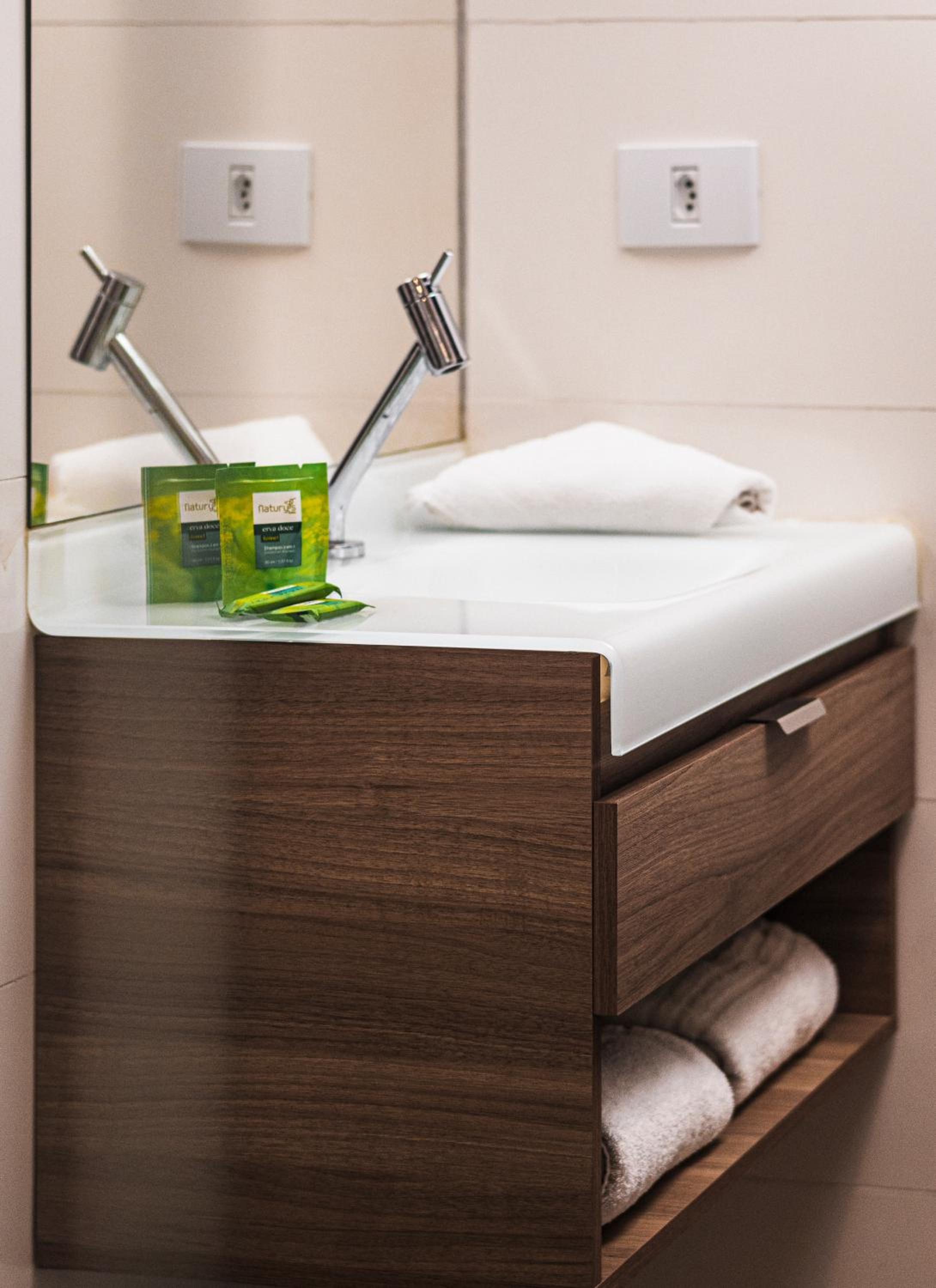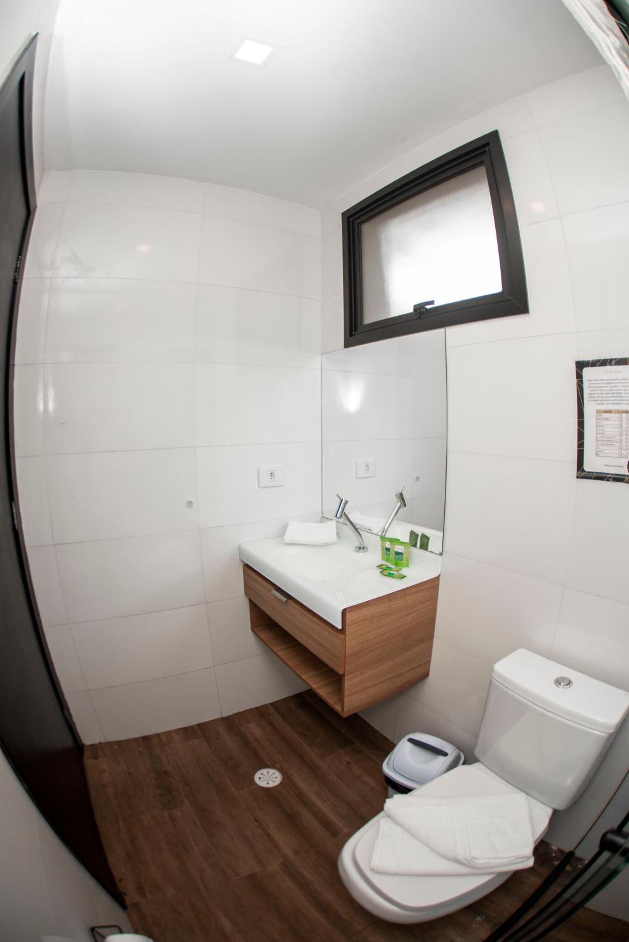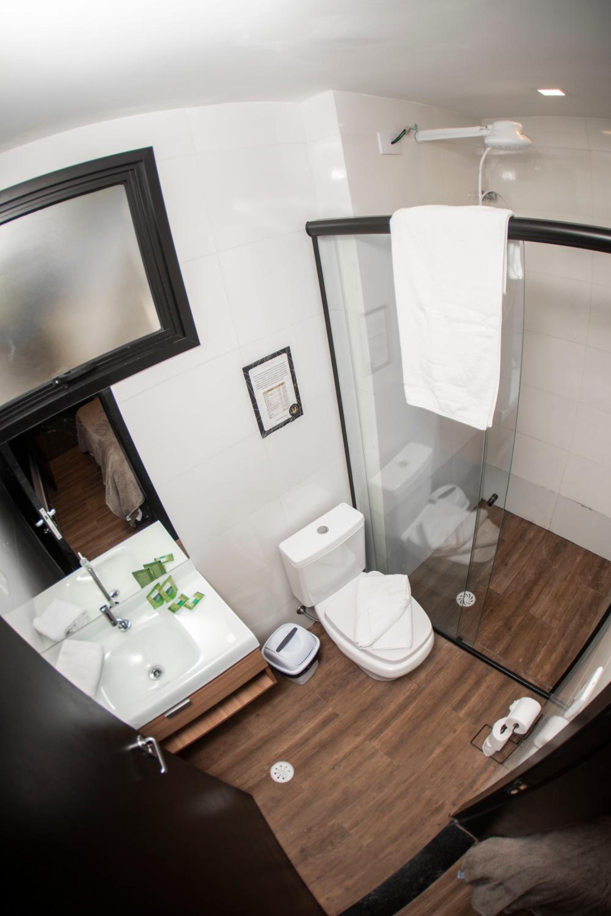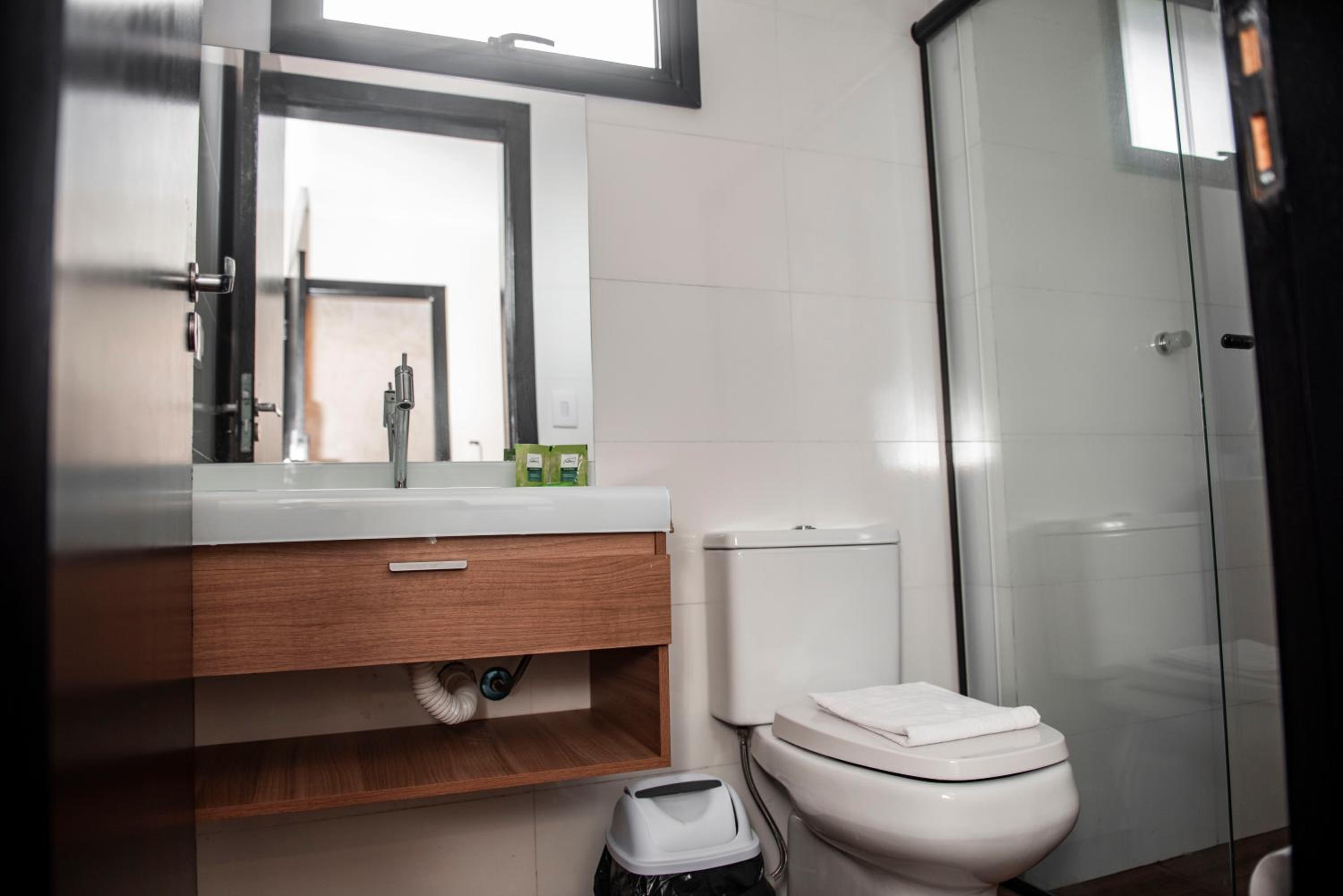 Banheiro largo e confortável, imagens reais ao anúncio, lençol de cama cheirosos e travesseiros bons. Custo benefício ok. Pra quem vai fazer compra no Bras é maravilhoso.