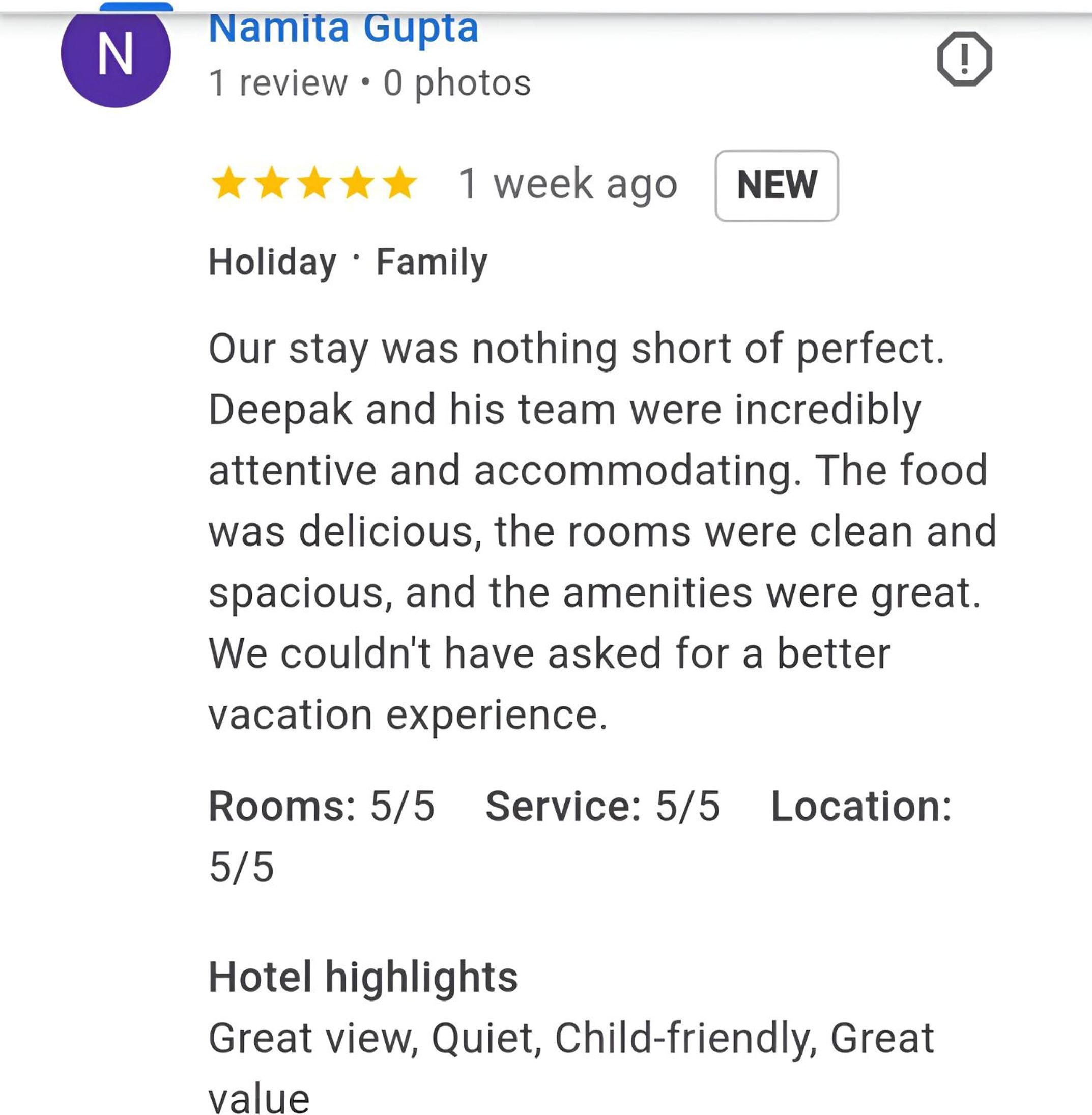 Fantastic hospitality by Rinku and his team, they made the stay extremely comfortable and the food was excellent. The room was spacious.