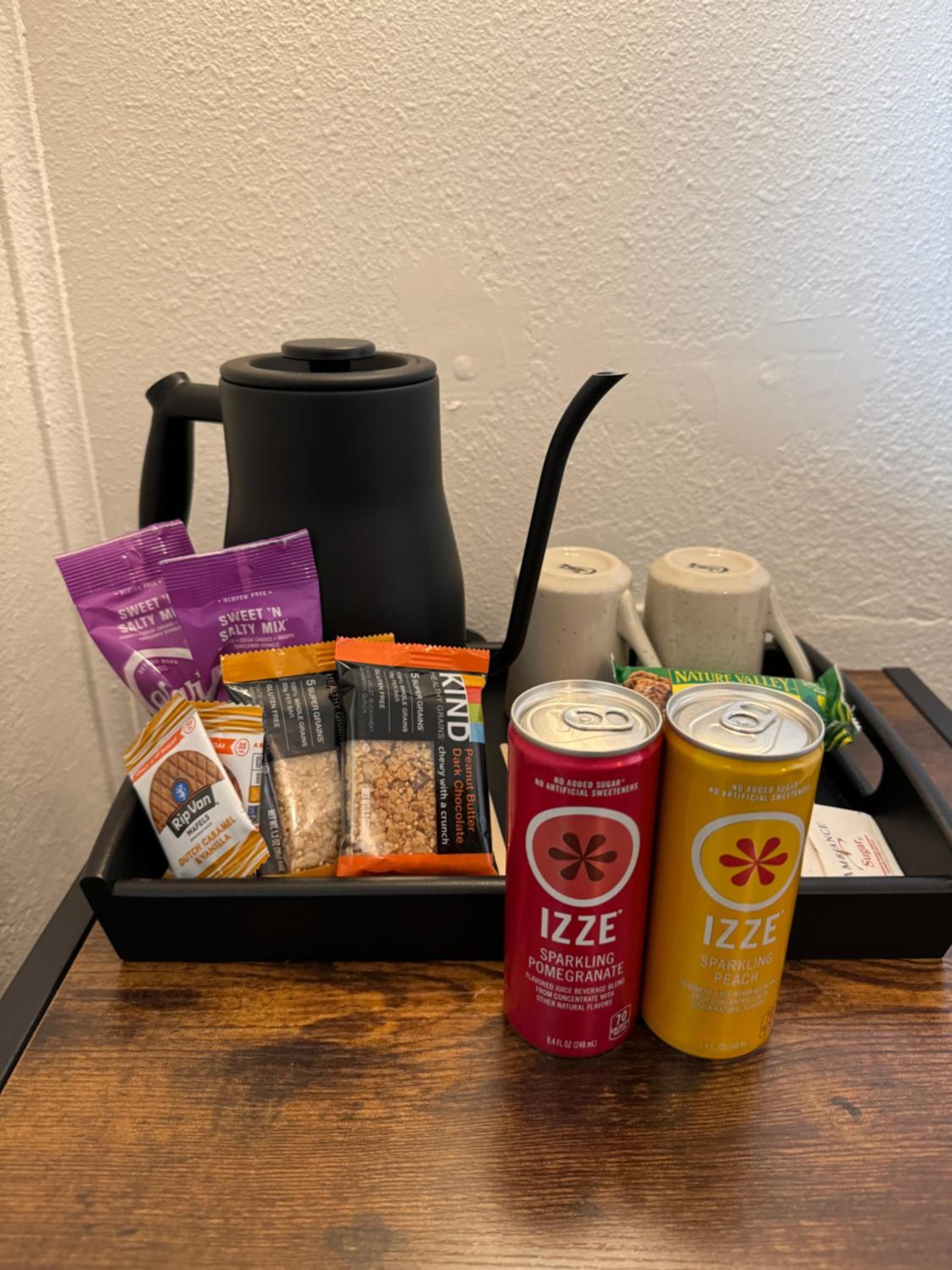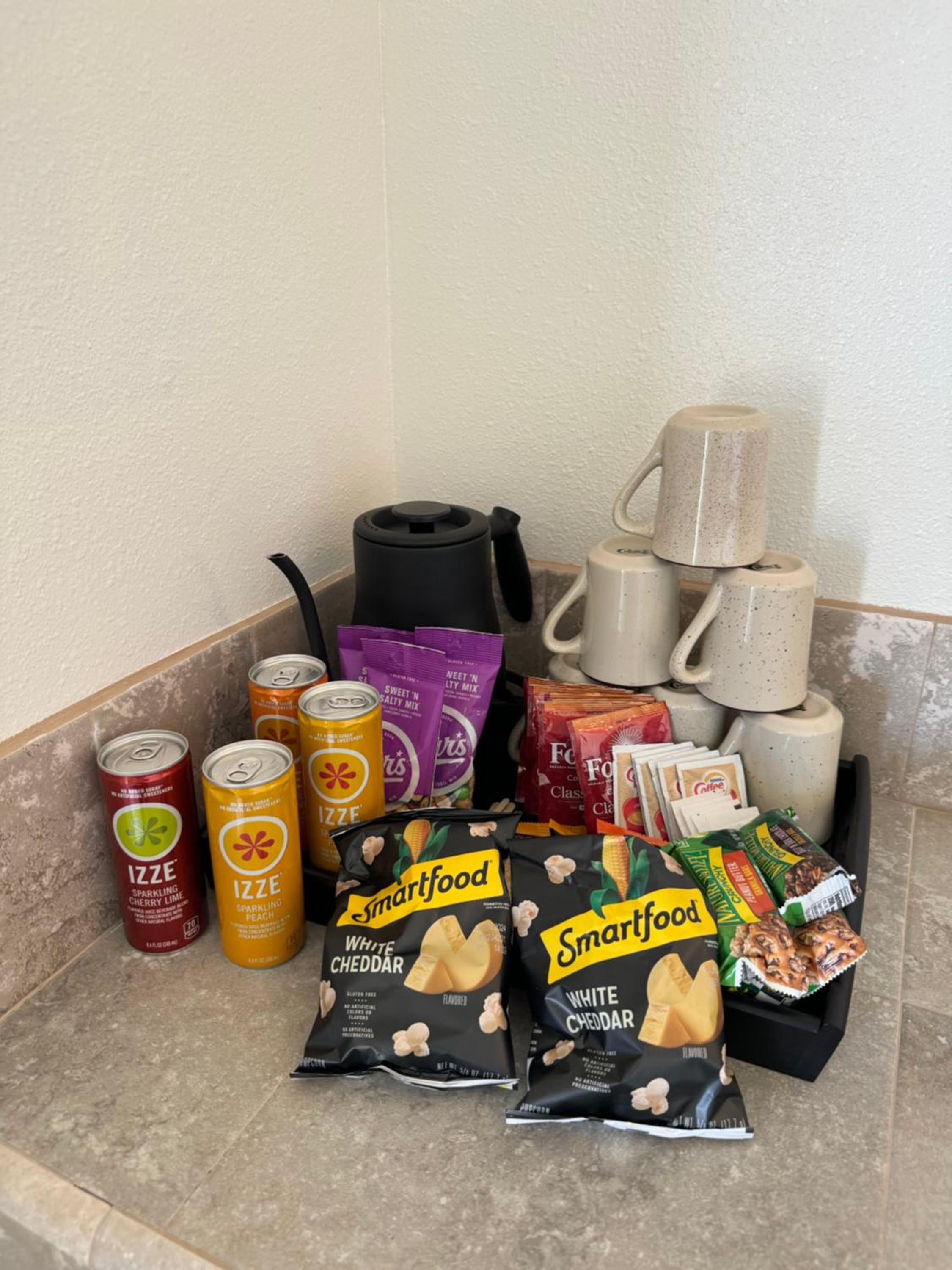 Appreciated the complimentary snacks. There’s no restaurant or store in the area unless you go to the Shell station which I did for dinner.