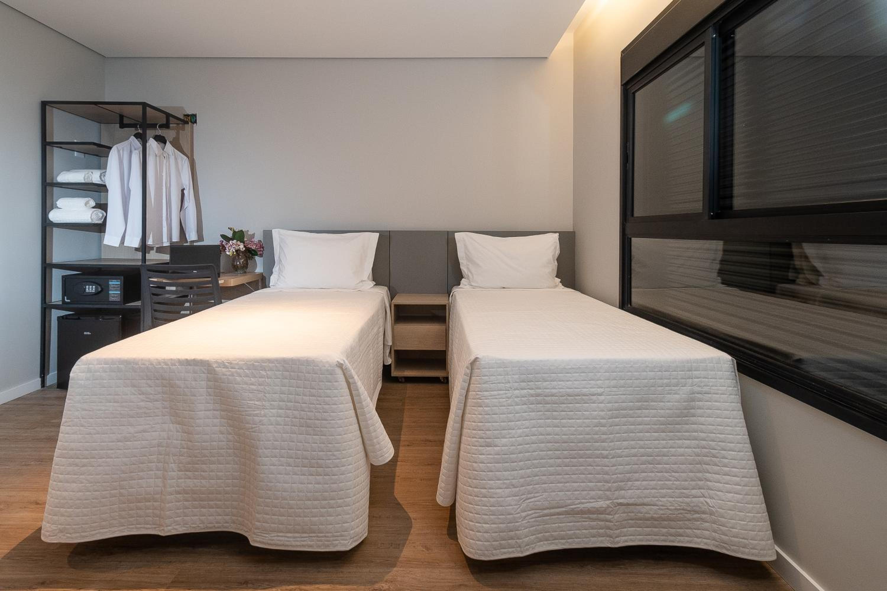 Quartos são bem pequenos. Pouco espaço para locomoção, malas grandes não cabem.