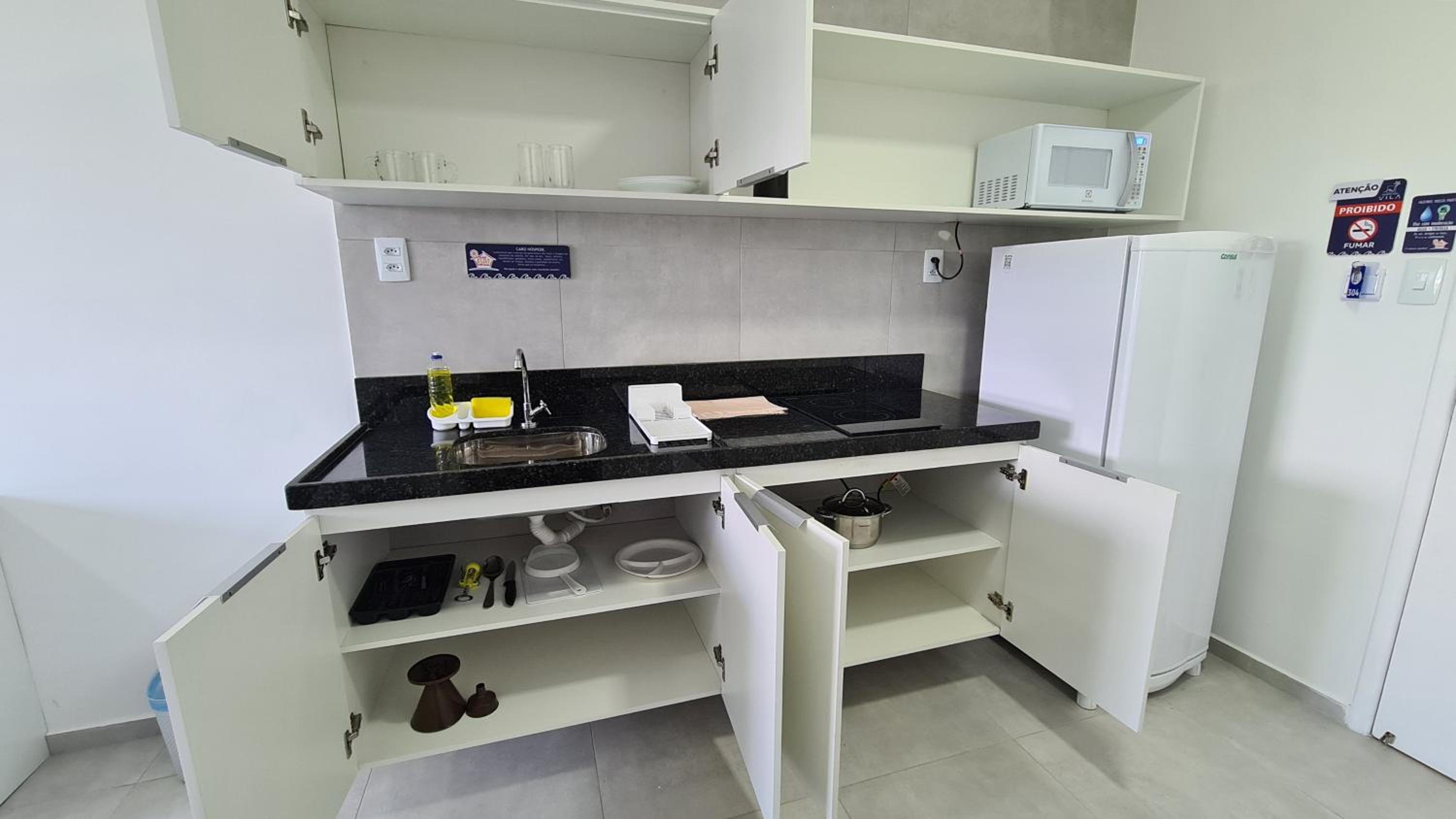 O quarto tem uma pequena cozinha