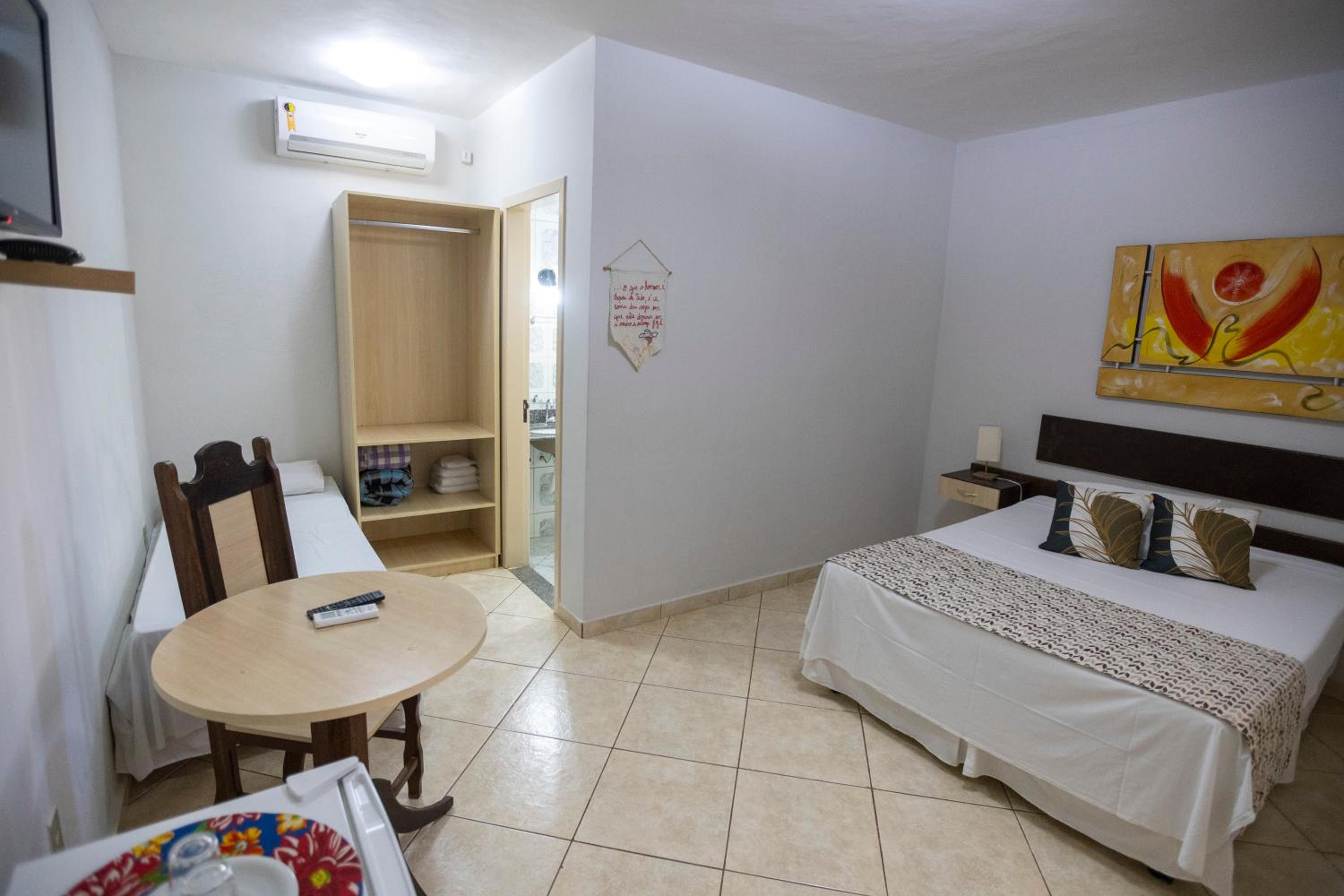 A hospedagem aceita PET, e oferece local e talheres para fazer as refeições.