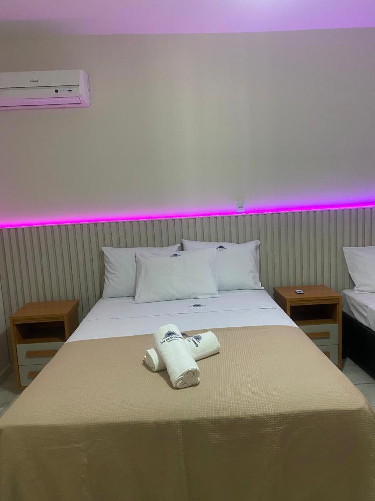 Cama, travesseiros, lençóis, cobre leito e ar condicionado perfeitos.