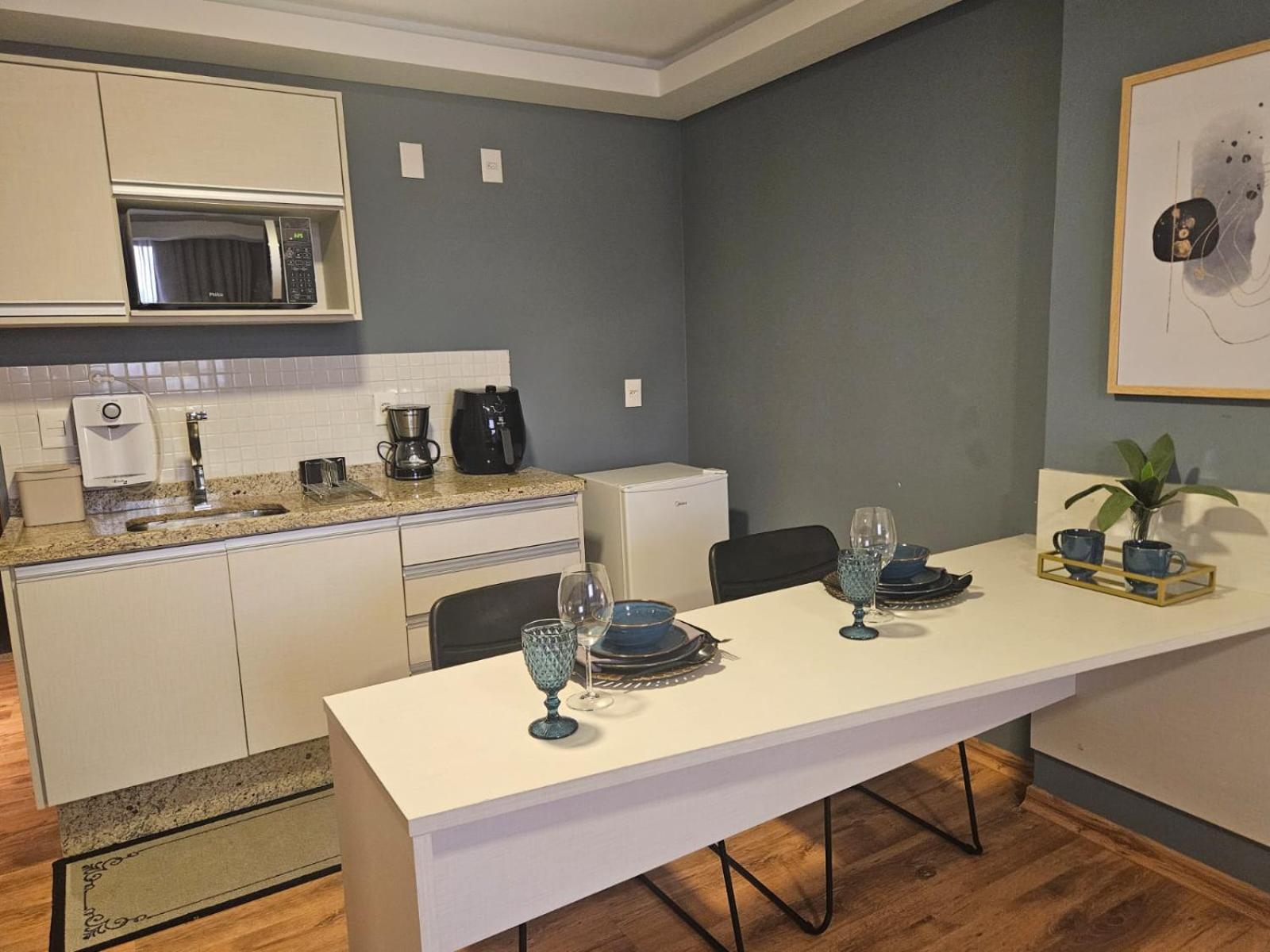 Espaço do apartamento e café da manhã