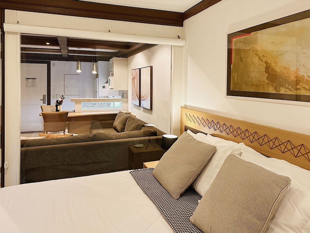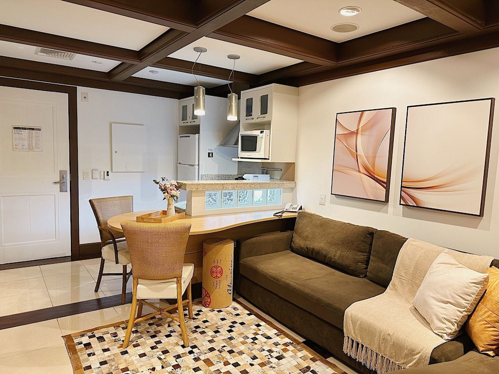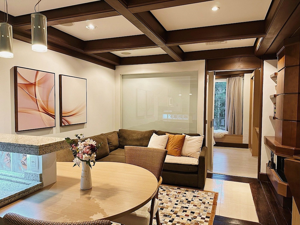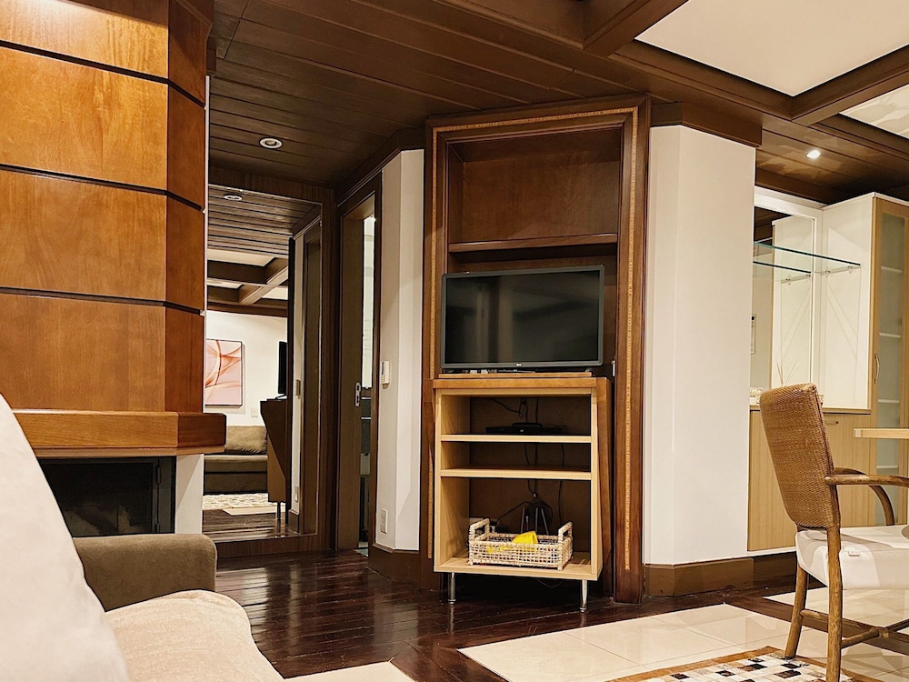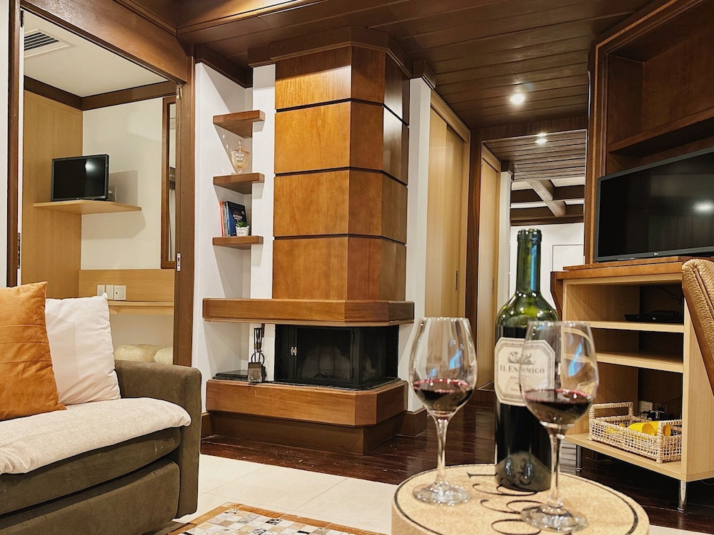 This air-conditioned apartment boasts a fireplace, indoor private spa tub, and private balcony, offering utmost comfort and relaxation.