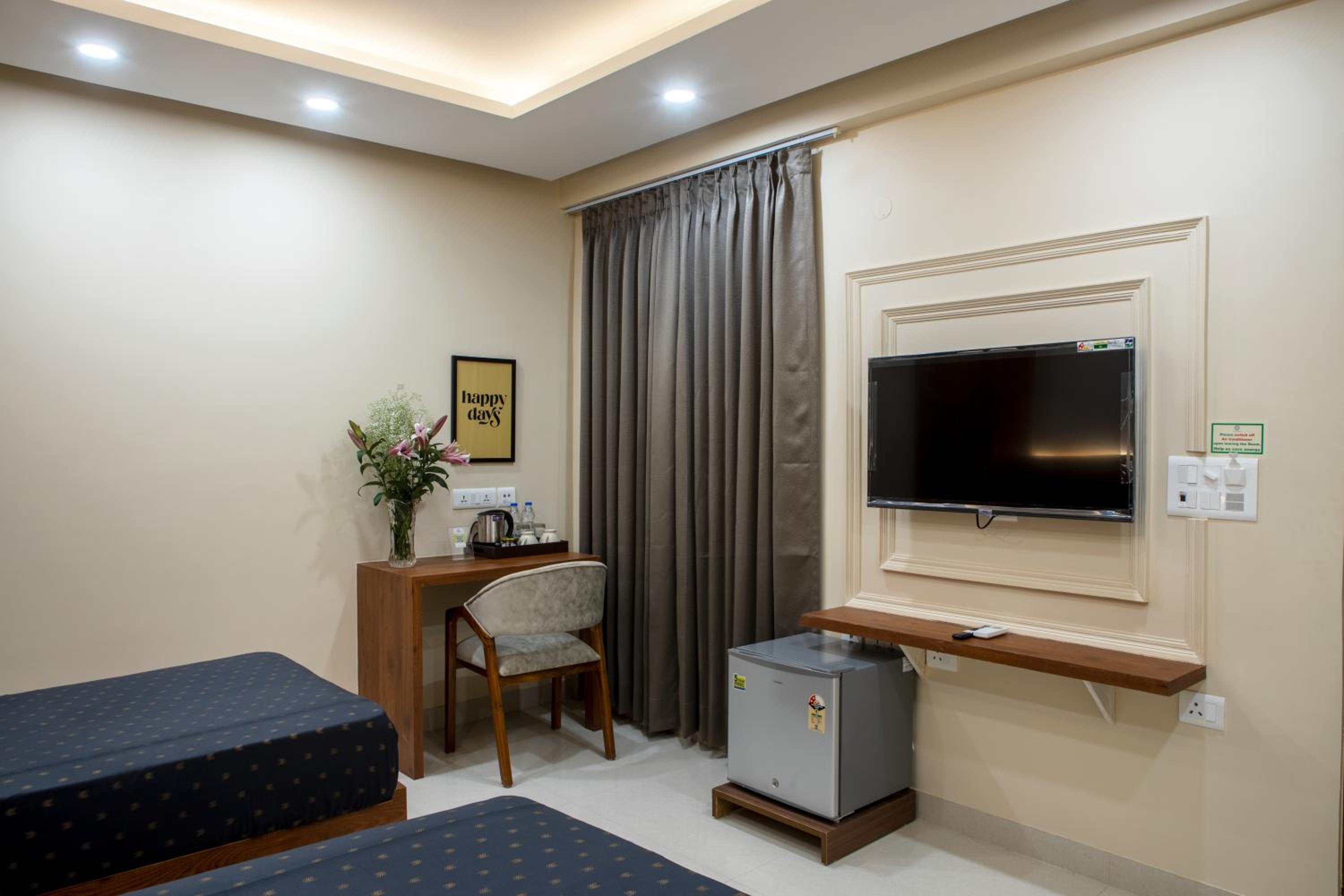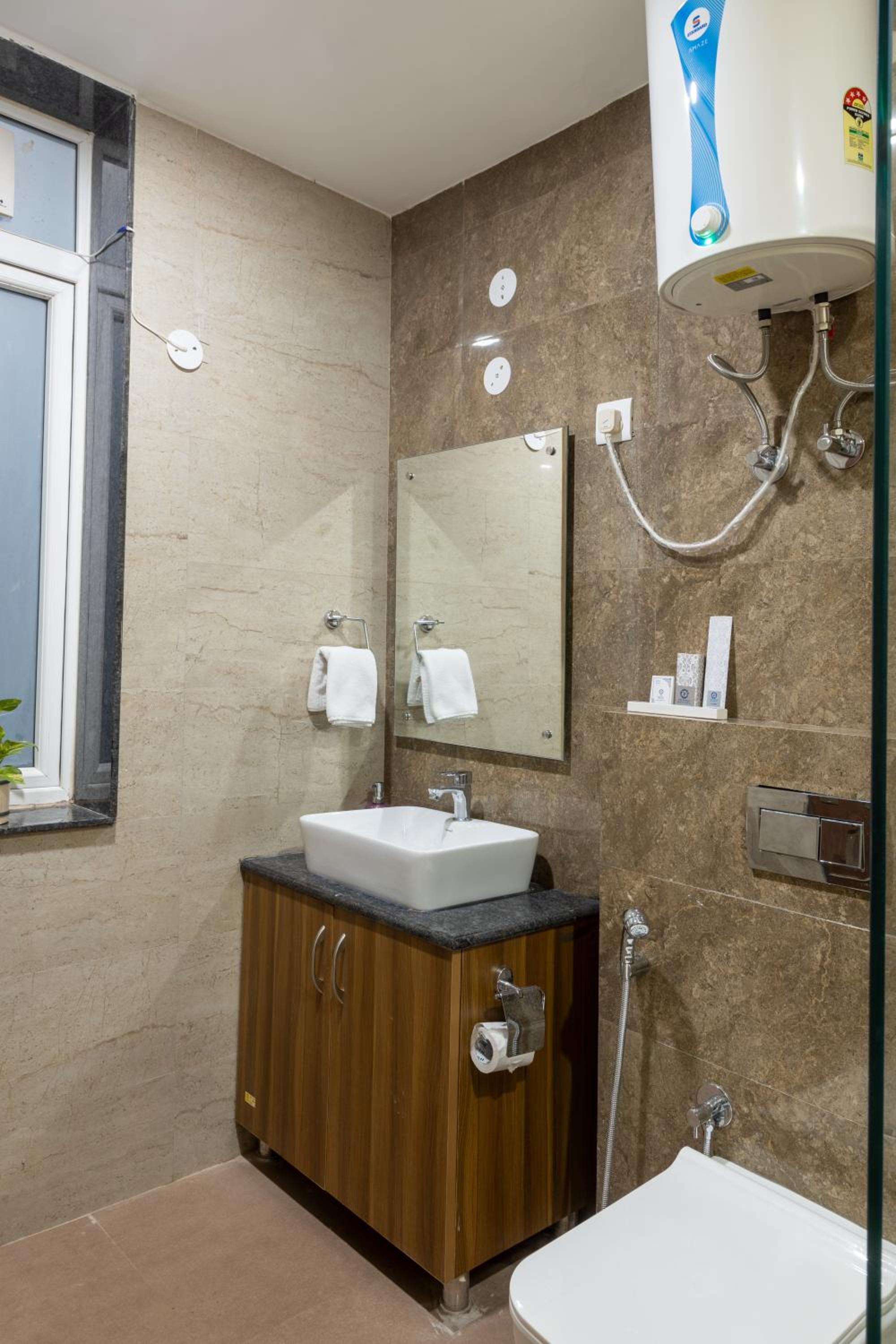 Close to Delhi airport, quiet room. New hotel, new furniture. Air condition with heating which really helped in winter. Nice and helpful staff, solved all our issues and helped a lot. Indian food for breakfast, but we were able to order omelette and there were flakes so this was good. Really great experience, would certainly go there again.