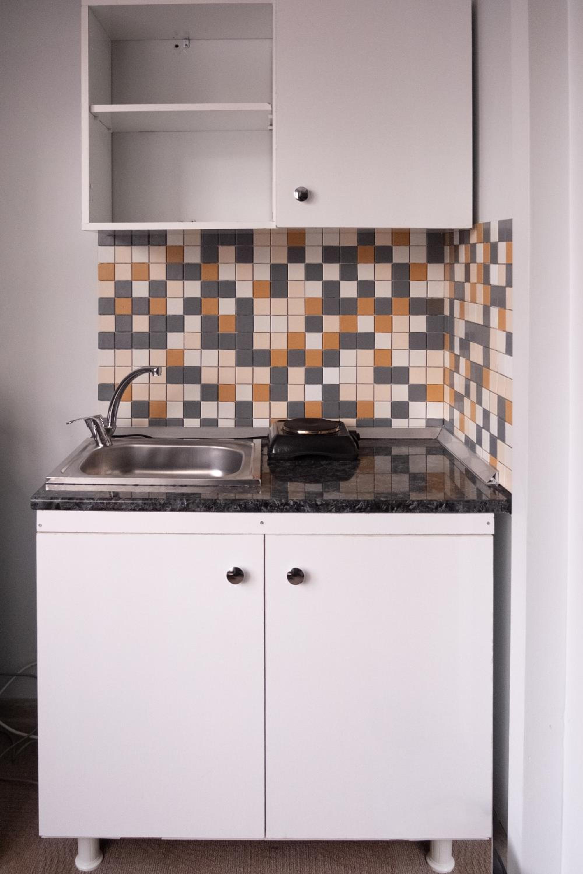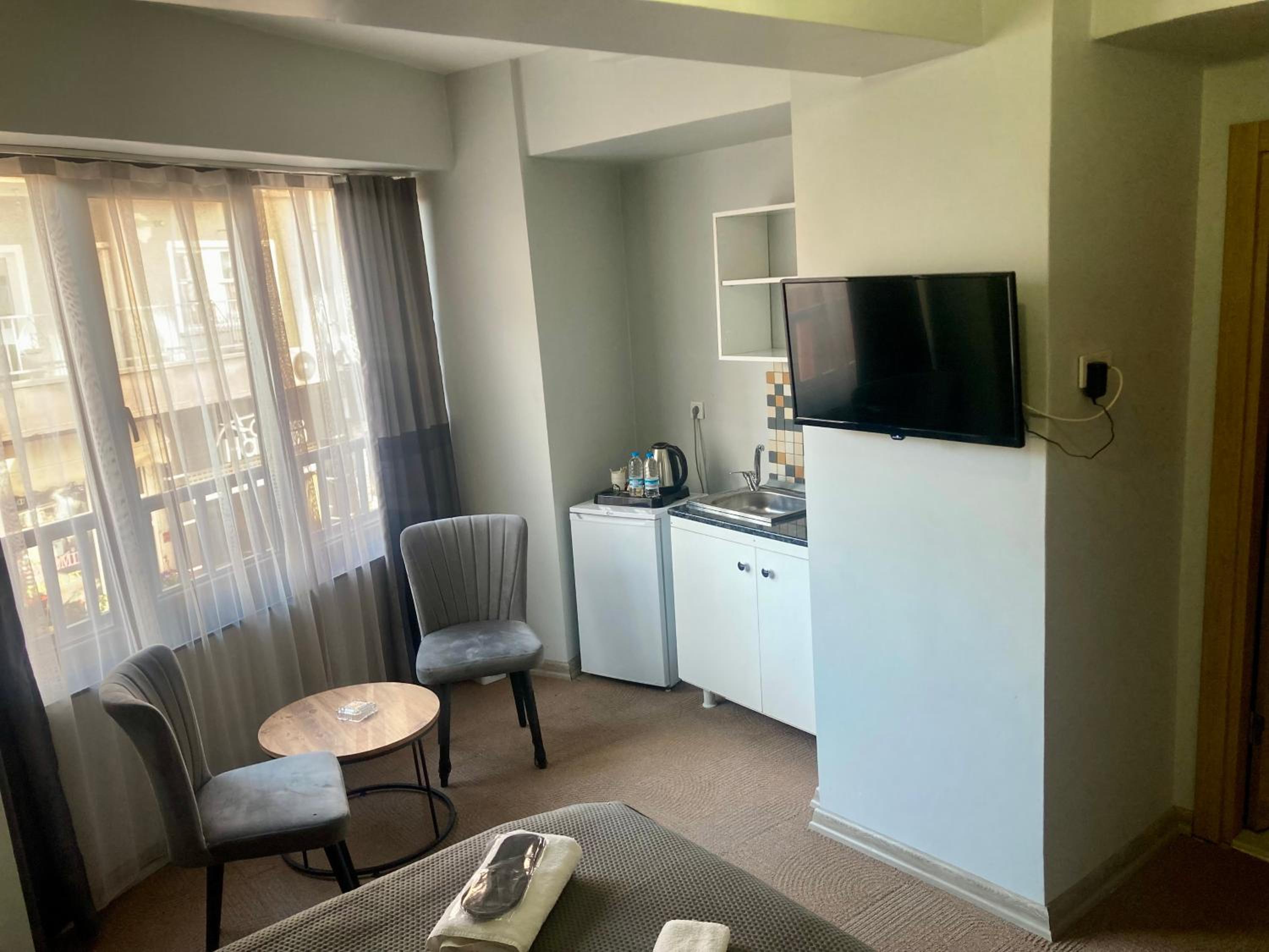 Oda ferahtı kitchenet yoktu kettle ve buzdolabı vardı oturma kısmında masa olmasıda iyiydi banyo yeterliydi lavabo ufaktı memnun kaldık