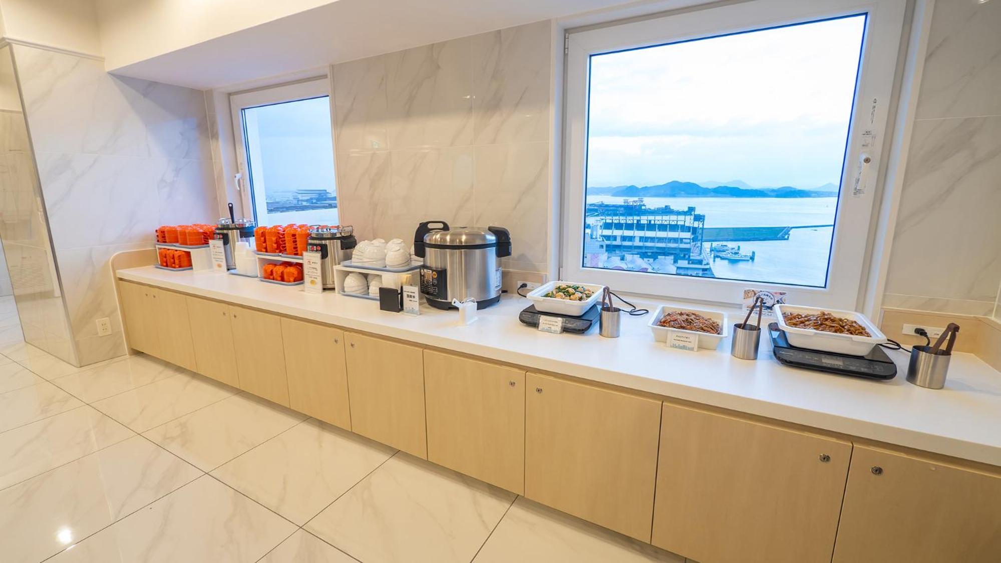 無料の朝食は品数は多くないながらも、小倉名物の焼きうどんがある。