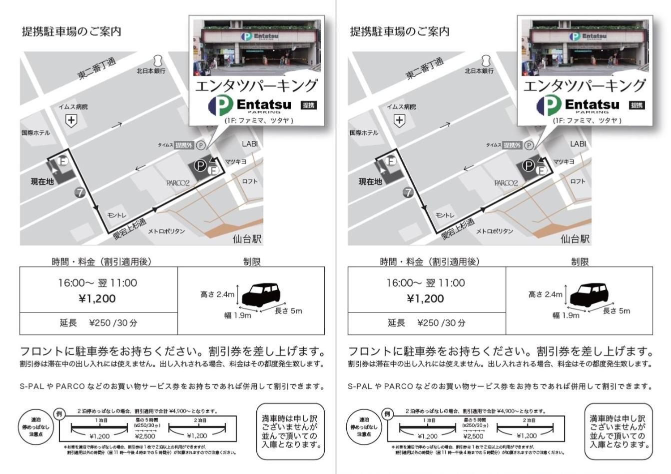 提携駐車場のタイムズ仙台駅屋上は屋上に上る際の道が狭いので、事故にお気をつけください。また、あまり遅くに行くと、近隣の施設が閉まっており、屋上からエレベーターで降りた際にどこから地上に出られるかわかりませんでしたので、時間に余裕を持って到着されることをおすすめします。