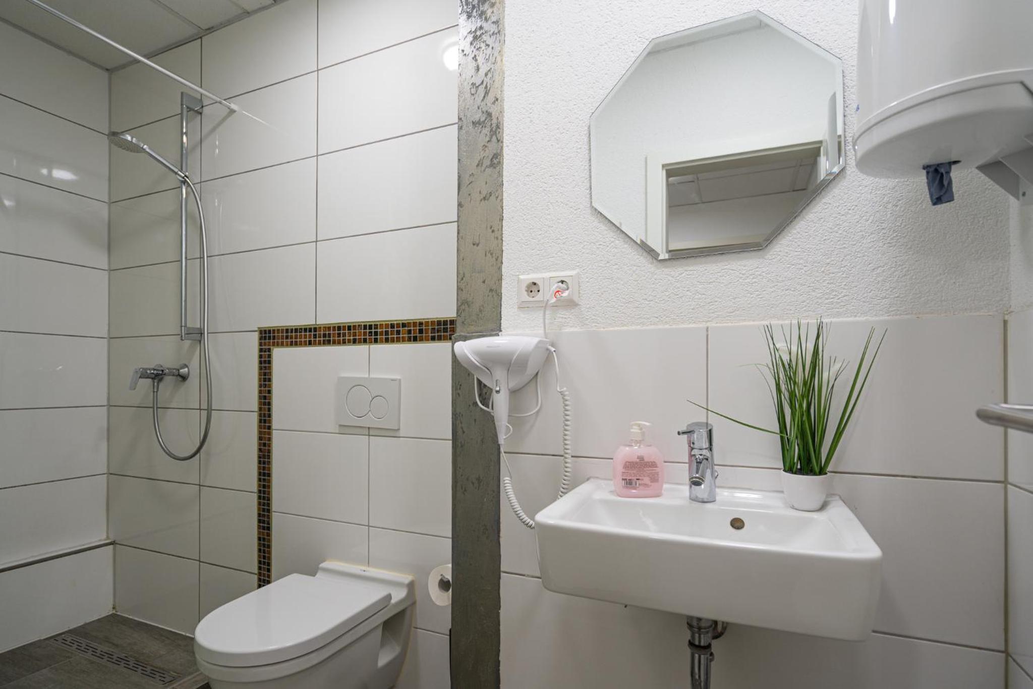 Die Küche haben wir uns mit wildfremden Menschen geteilt - unsere selbst mitgebrachten Lebensmittel wurden während unserer Abwesenheit von anderen einfach mitbenutzt. Schwer zu sagen von wem, denn es waren jedesmal andere Gäste in der WG. Lüften ist schwer möglich, da Passanten am Gehweg direkt ins Zimmer hineinsehen können. Kleinigkeiten wie WC-Papierhalterung und WC-Deckel warwn locker und verrutschten dauernd. Die Duschen waren ekelig und wohl länger nicht mehr geputzt worden....
