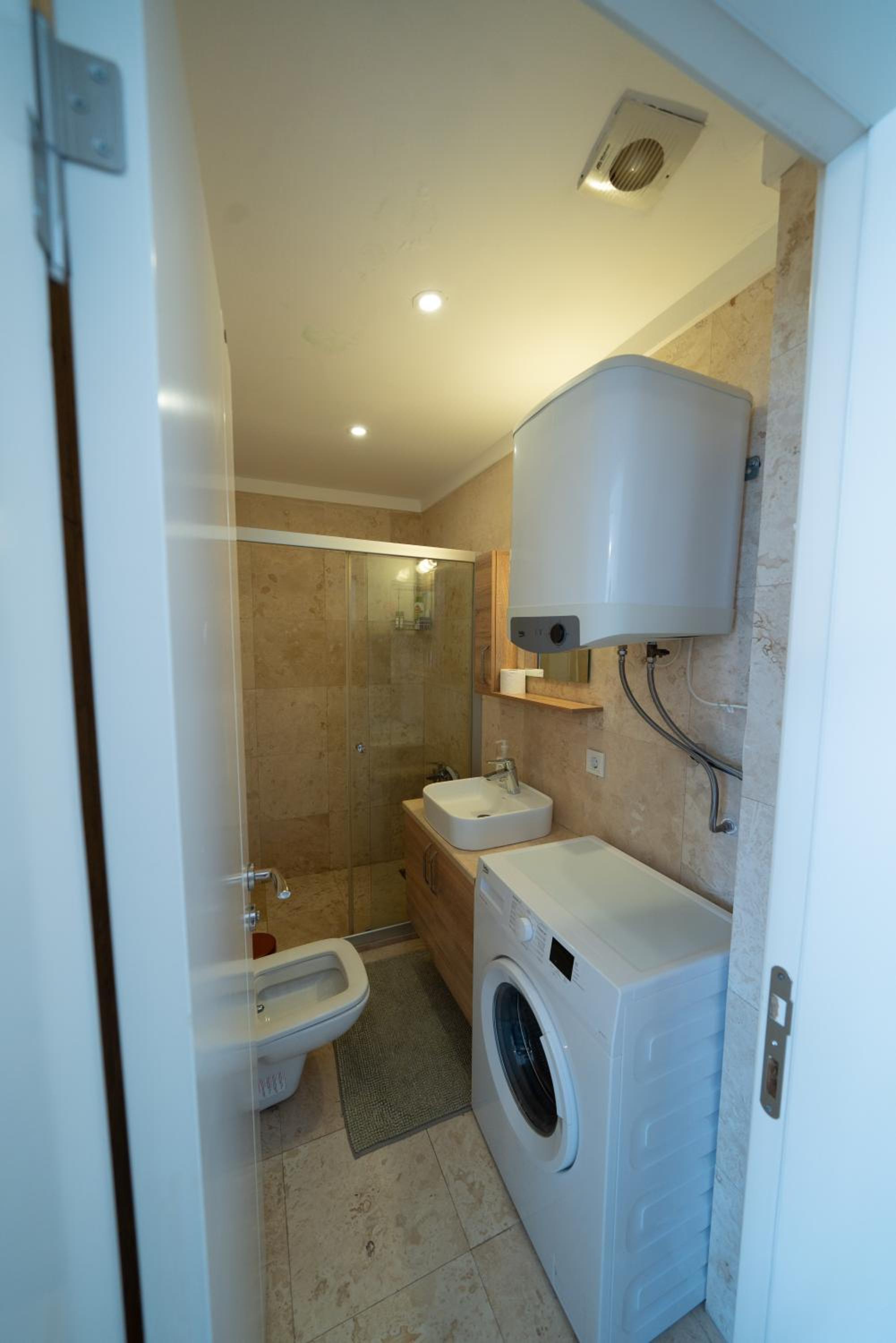 Er had wat meer servies mogen zijn, de waterstraal van de kraan is vrij zwak, het warme water was tijdens het douchen van de tweede persoon redelijk snel koud. En om bij het appartement e komen moest je een hoge heuvel op lopen.