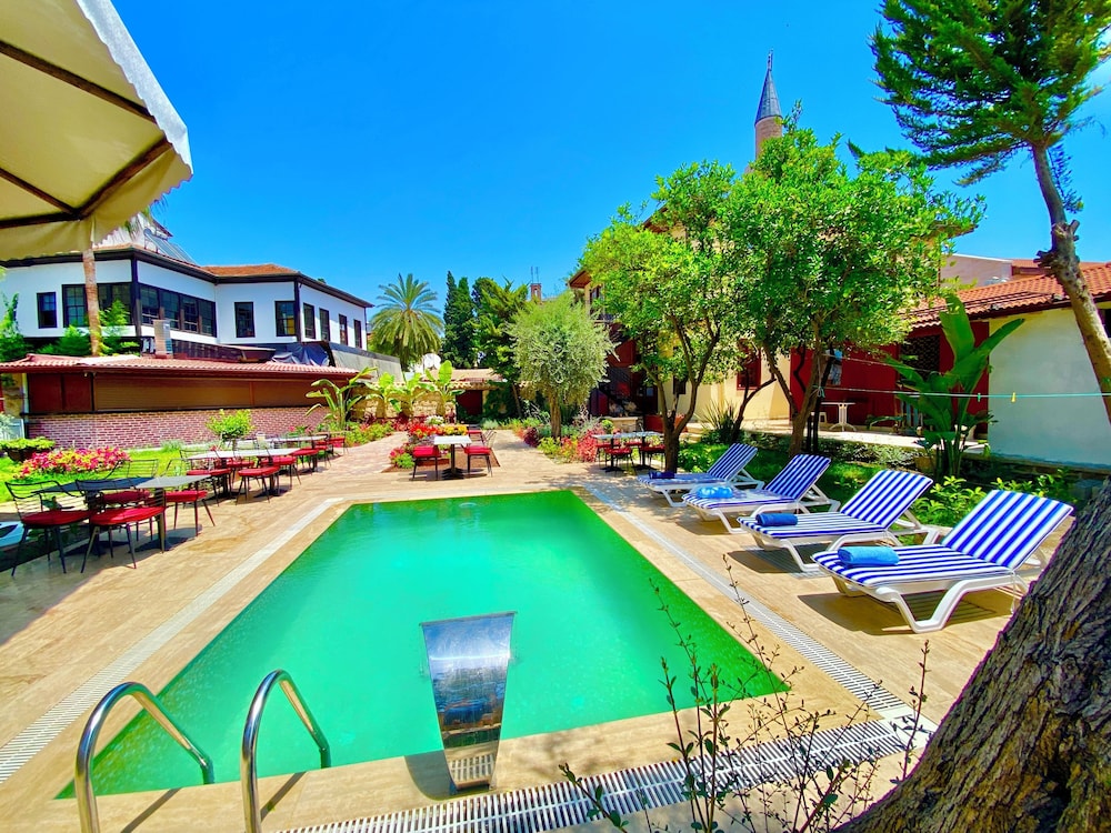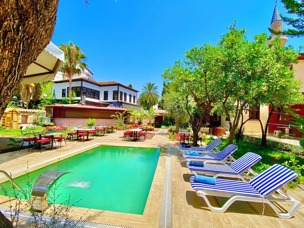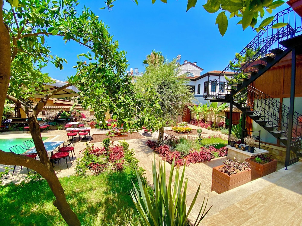 Konumu şehir merkezine çok yakın,Kaleiçi ayaklarinizin alttinda,haddiran kapısı hemen üç dakika,restorantlara yakin,eğlence mekanları hemen yanınızda,otel havuzlu,ama ben mevsiminde gitmedigim için kullanamadim,bahçesi harika,portakal ağaçları dolu,yemsesil palmiyeler,mis gibi turucgil kokuyor heryer,otel cok temiz,ferah,huzurlu,ben çok rahat ettim,çarşaflar satenden,saç kurutma,ketil,kahvesi çay her şey ince ayrıntısına kadar düşünülmüş,balkonu şehir eğlence mekanını görüyor,oturup izlemek çok zevkli,4gun kaldım,keski bir 4gunum daha olsaydı,doyamadım,çok memnunum,çalışanlara tekrar sizin araciliginizla buradan teşekkür ederim.