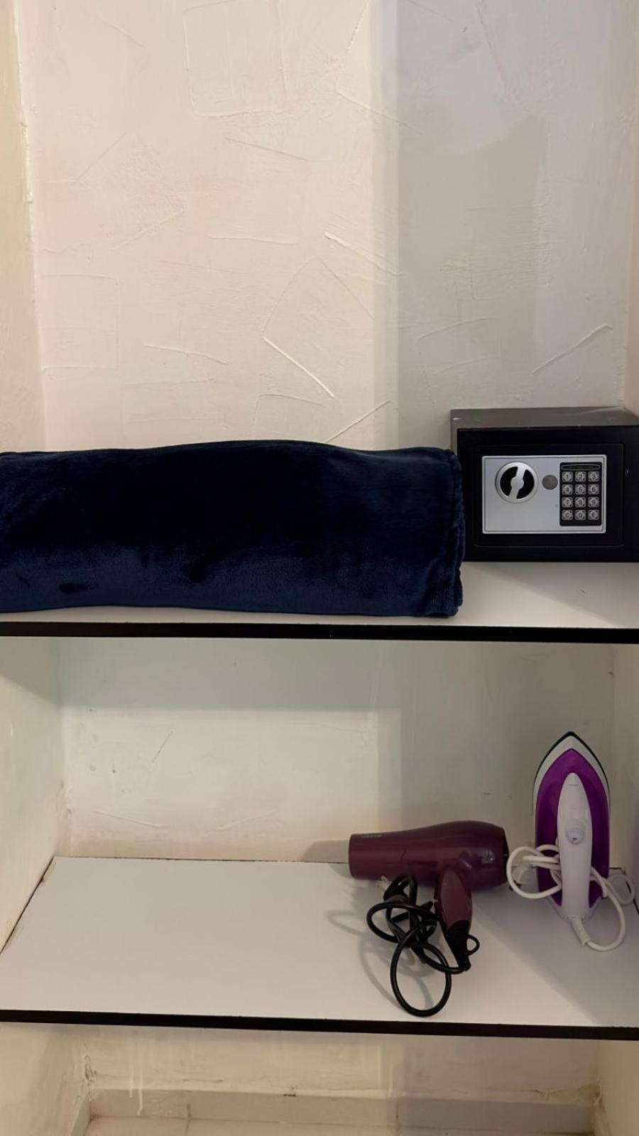 Note. There was adequate shelving but no place to hang clothes. An iron, ironing board and hair dryer were a nice touch.