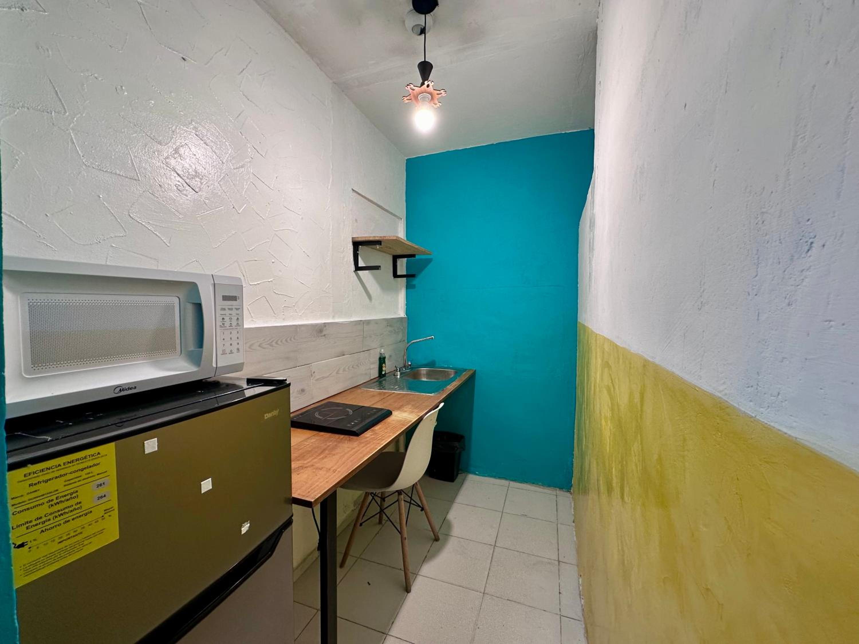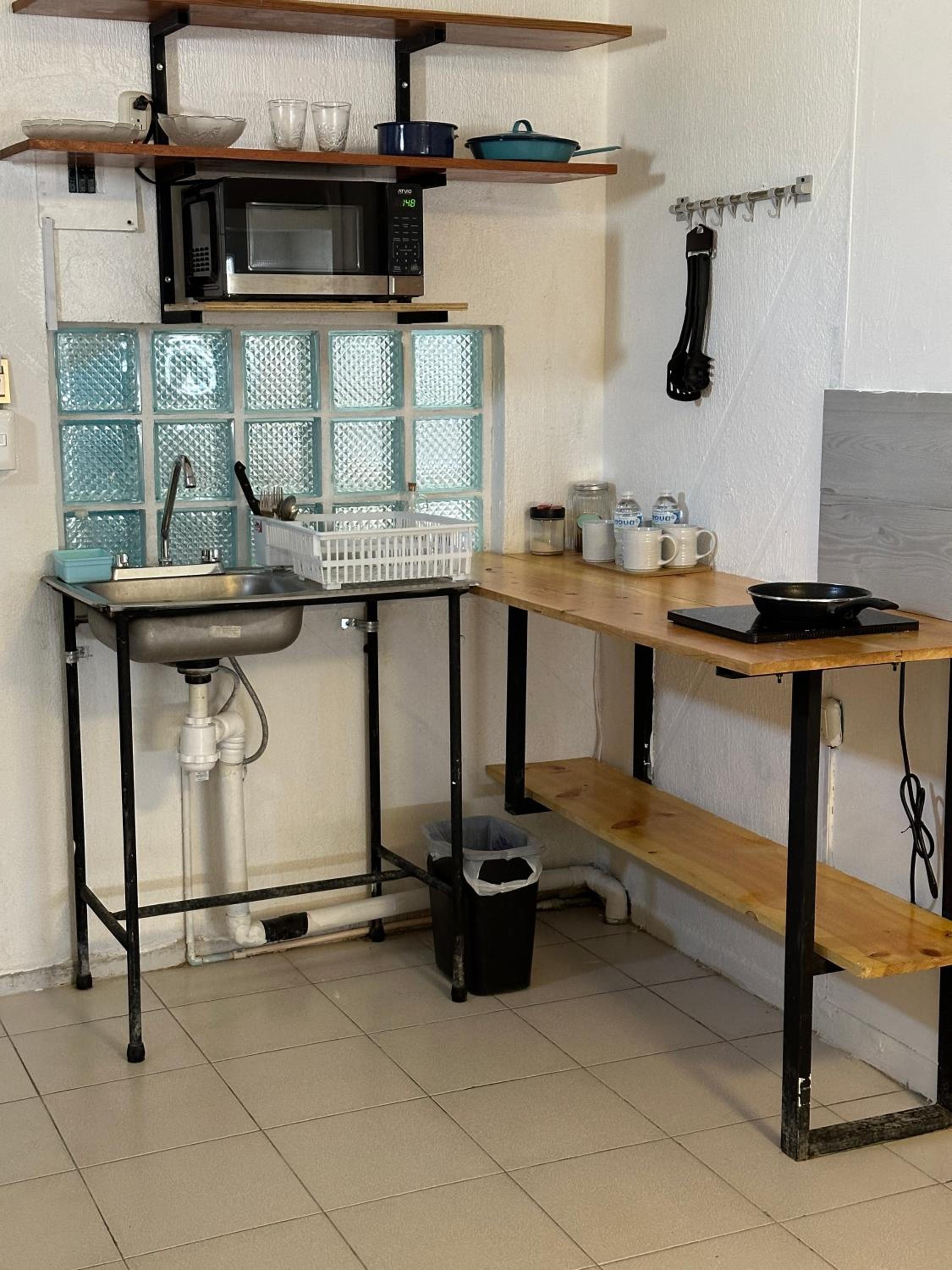 inadequately equipped kitchenette, just one fry pan and a one burner induction stove. No coffeemaker. Water ran out @ 7 AM while I was standing in the shower, covered in soap. Was still out 14 hours later when I returned.