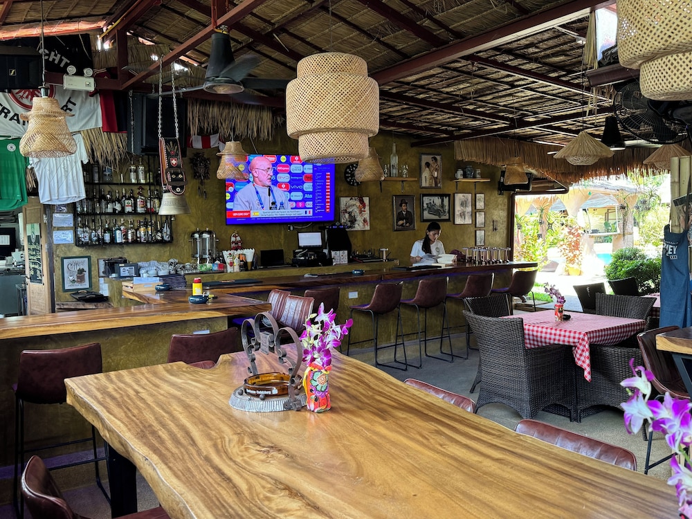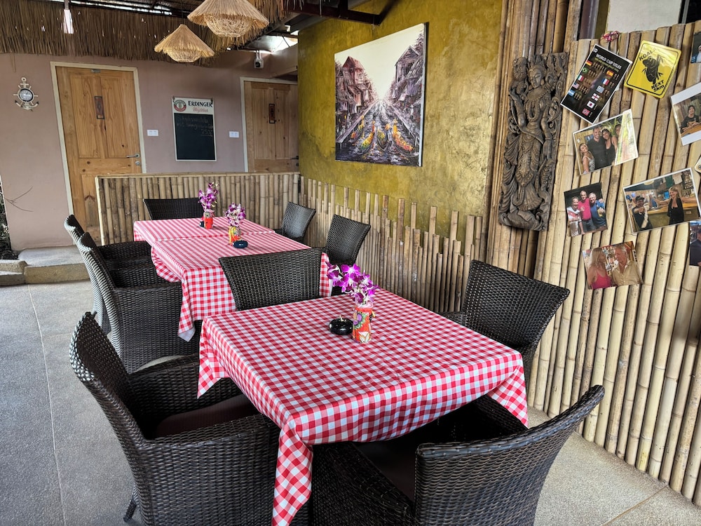 hotel just off main road, about 10mins walk to centre/beach. Decent rooms, good value with quiet fridge, safe & great shower but bathroom smelt of drains often & towels rail missing.....some tlc needed. Staff were nice.Our room was right next to the bar & many other rooms also in clear earshot....bar was very noisy with people until late& then loud music started again at 8am so not very peaceful.. When we arrived it was a buddha day meaning all bars were closed (restaurants sold alcohol in 'coffee cups') consequently bar at this hotel packed at 4pm. We were quickly shown to our room but little information given (eg time restaurant open for breakfast) & didnt feel very welcome more interuption to drinkers. We also had a storage box for ice/empty bottles right next to our patio door (& do very close to our bed) with bottles clanging till very late 1st night & early next morning....this was moved when i asked but should never have been there in first place