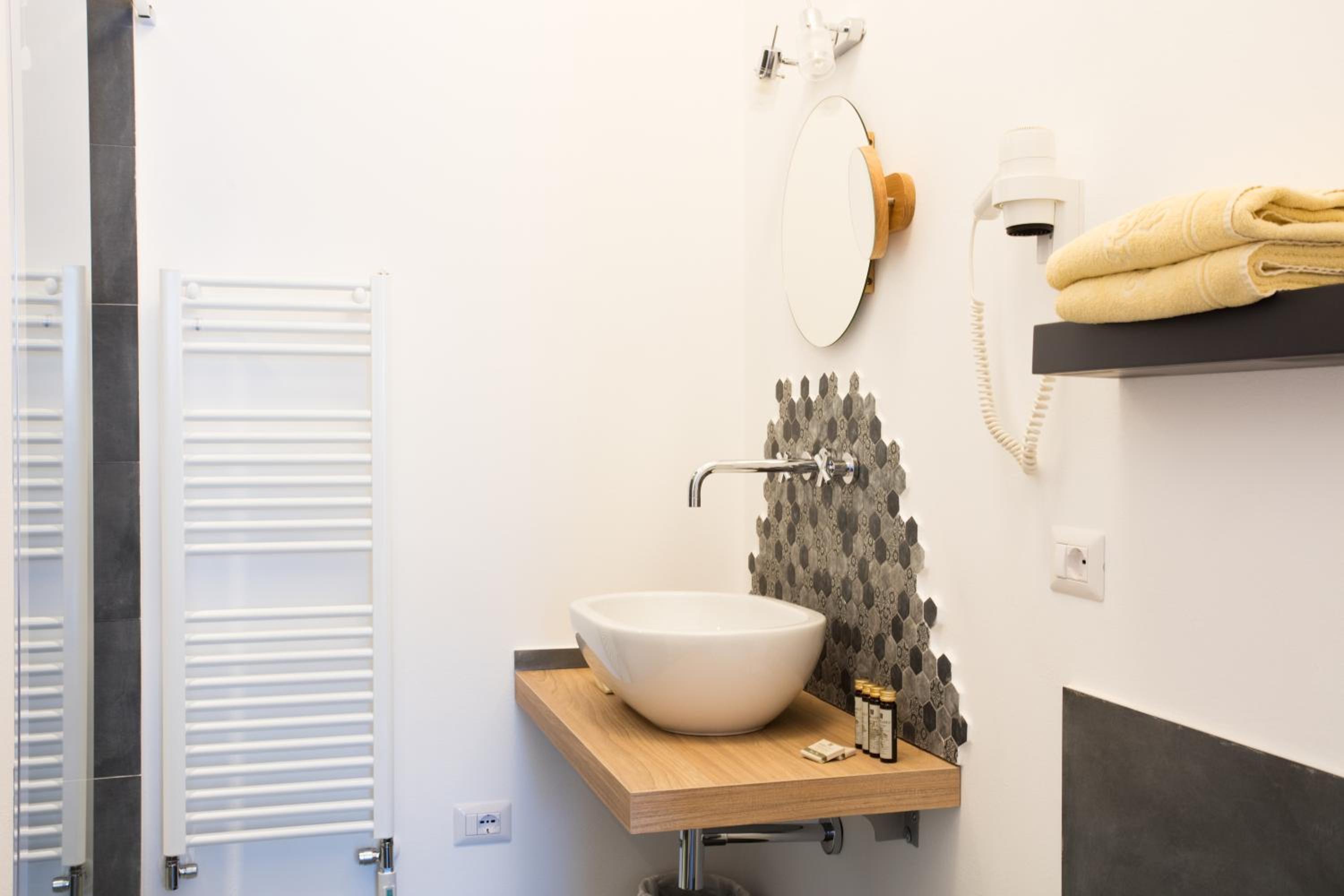 I can see this family-run hotel is trying to take itself upmarket and add new services, such as a wellness offer, but I think the price point is a bit high at the moment as the transformation is not yet complete. For reference, we had just come from a beautiful Tuscany city where we had a modern suite with a balcony and separate sitting room. No pool, but it was half the price. The decor and some of the furniture of our room felt dated. There were teddies in boxes on the wall, and some amateurish art. There is now a picture of this room on the web, but if I had seen it before I wouldn't have booked. We had two balconies but one looked over the car park. The other was high sided and when seated, there was no view.