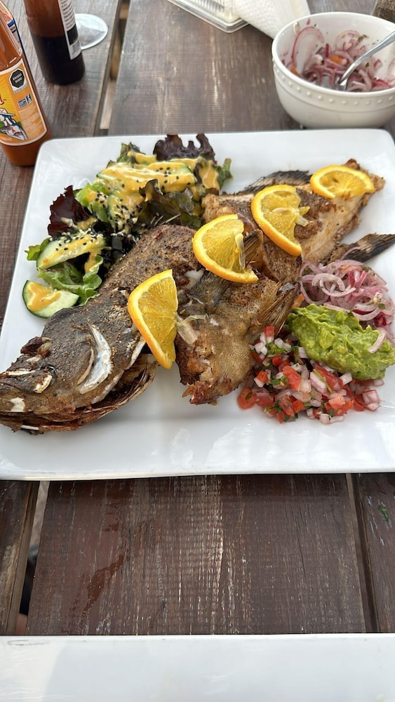 Was very disappointed. The office was locked and we got let into our Villa by the bar staff. The bedrooms were clean but the rooftop patio and area around the villa not clean. We had to clean the furniture of dirt before we used it. Some of the chairs were torn in unsafe to use the pull out couch had a huge rip in the upholstery and what was viewed was not great. Full kitchen but no dishes or cutlery. A hot tub that was empty except for filthy pools of residual water. An absolute disgrace for 5500 pesos per night or 438$ Canadian. And I have pictures!