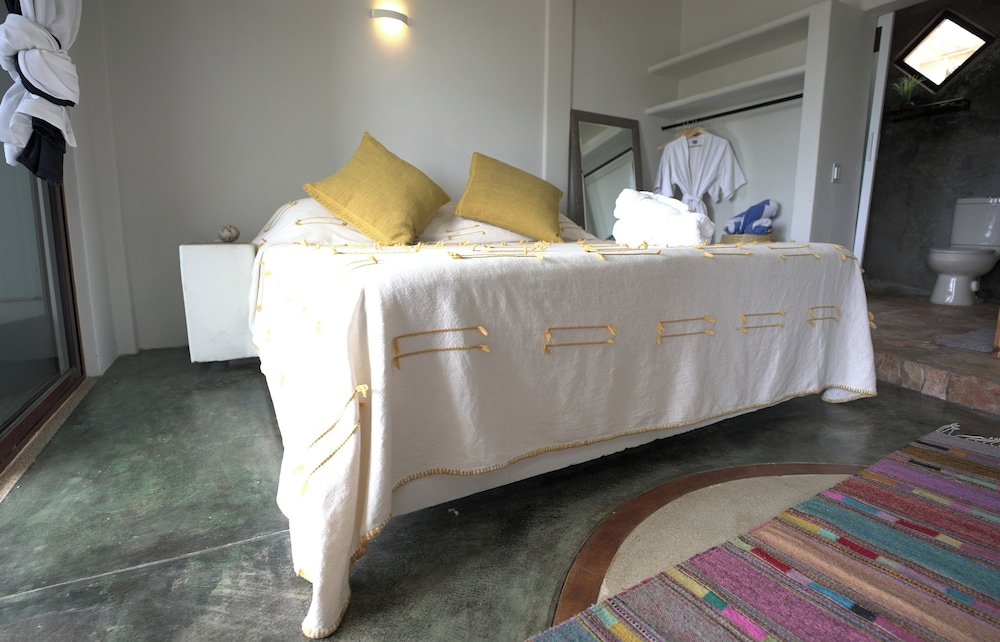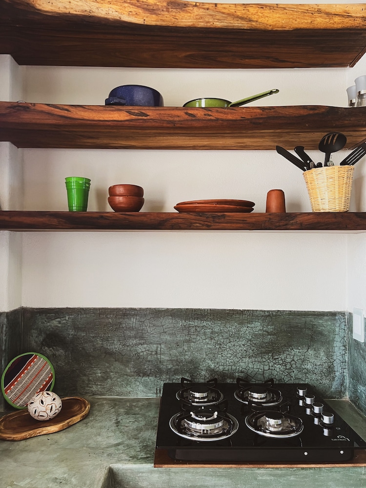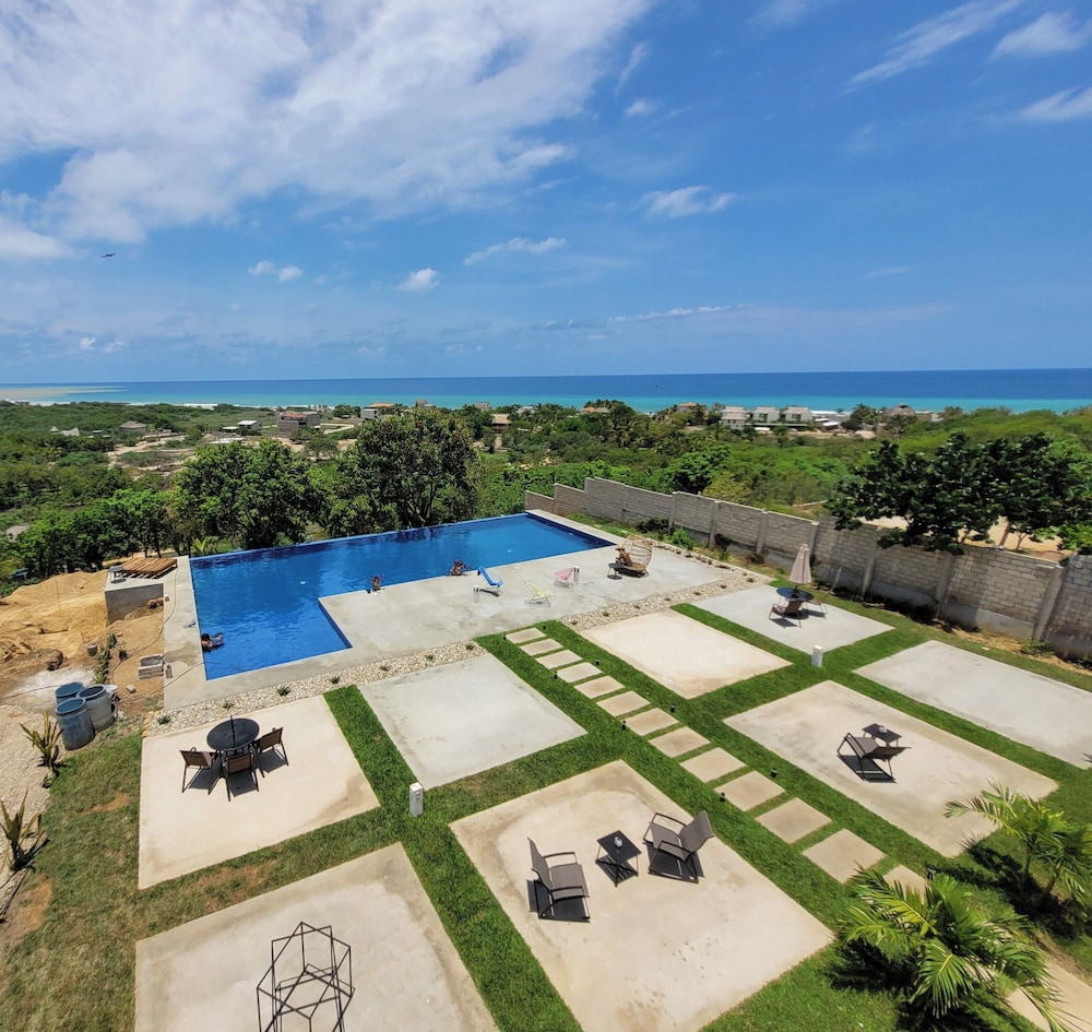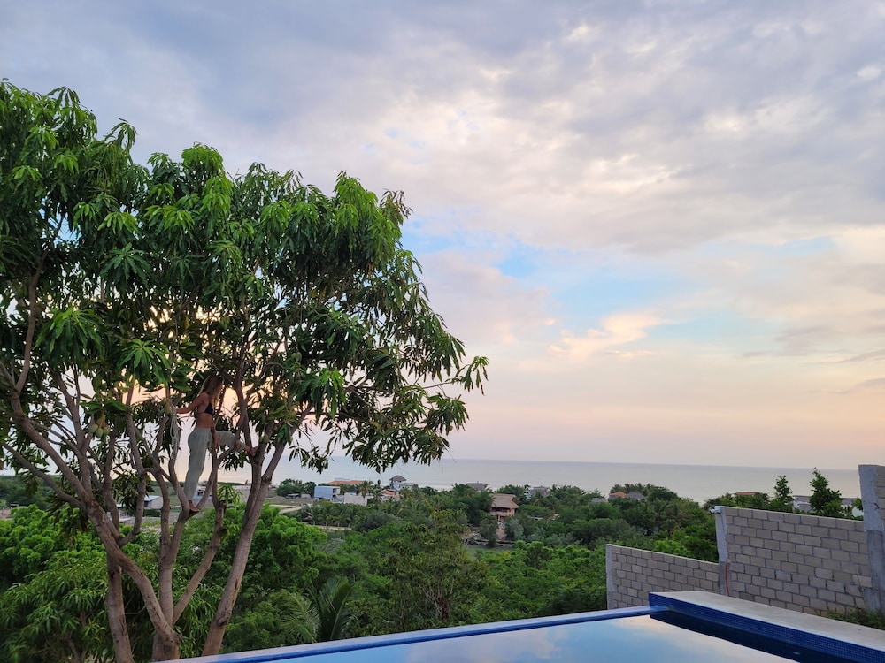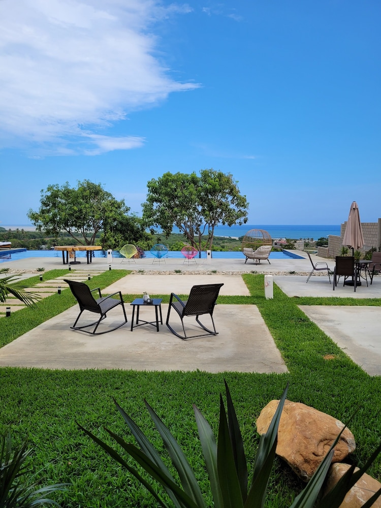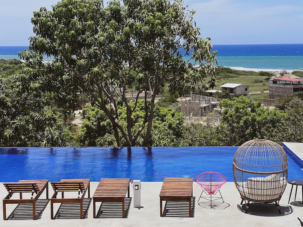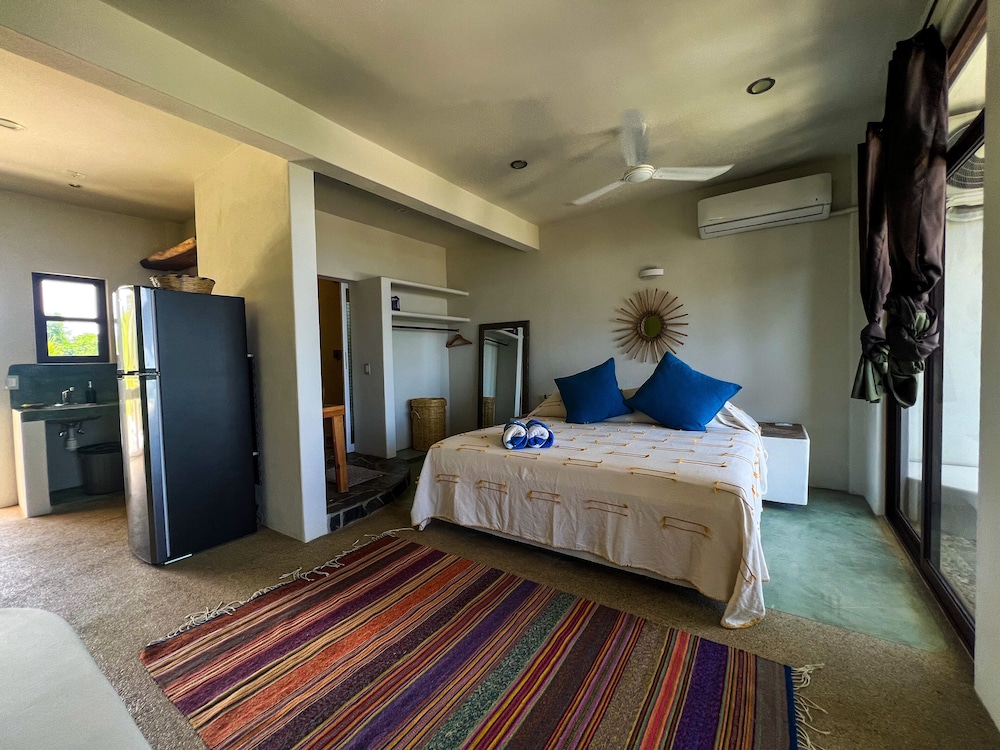 Tucked away with incredible ocean and nature views, but still close enough to dip into the action if you want. A beautiful walk to the beach through the tropical vegetation takes you to a quiet and expansive beach. Punta Zicatela is a quick drive away or 30 min walk. This place is perfect if you want some peace and not have a bunch of party animals next door. With only 8 self contained studios ( with huge king beds and a terrace) and a gorgeous pool, if chilling and relaxing is your thing, then this is your place,