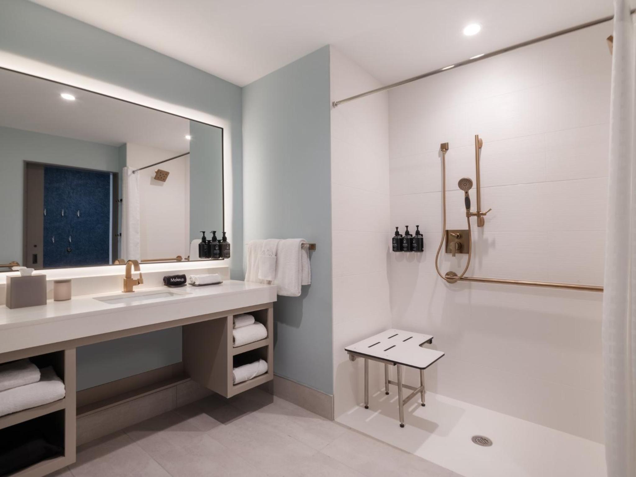Very large spacious rooms. Bathroom facilities are clean and aesthetic. The happy hour patio was a bonus as was the expensive breakfast options I love indigo hotels and this one is one of the better.