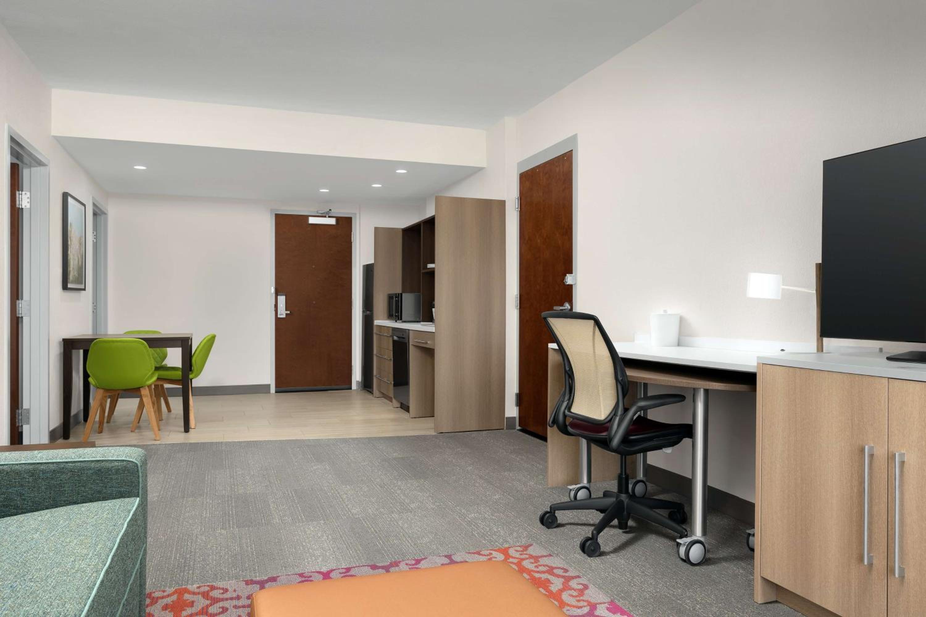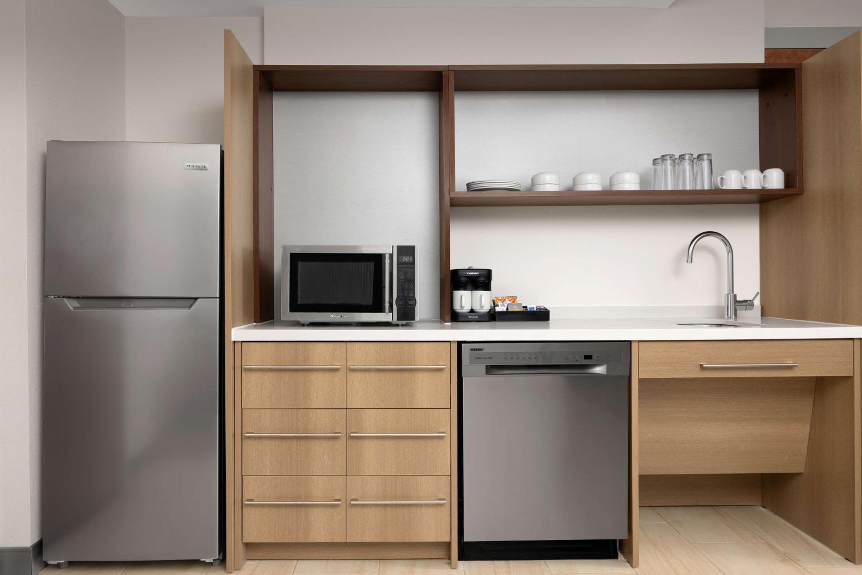 Friendly staff. Easy check in and check out. Very clean. Room very comfortable with lots of storage and kitchen equipment. Full size fridge. No cooktop. Dishwasher and garbage disposal in sink. Iron and ironing board. Two cup coffee pod coffee maker in room. Variety of hot caffeinated tea bags available downstairs. Free cookies. Free bottled water at check in and check out. Convenient onsite parking. Convenient location for Carolina Theater and restaurants near Duke. Lots of breakfast options. Hot and cold foods. Even cut fresh fruit available.
