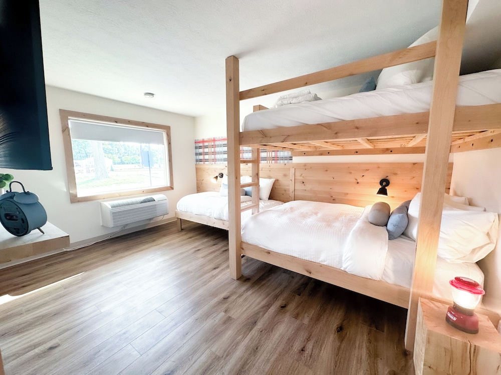 Stayed in the family cabin for 8. Beds were very comfortable, slept great. 2 full bathroom were perfect for 2 families. Price was just right. Room js basic but good for a night or 2 when you’re at the park all day. The chairs show some wear and probably need to be replaced bc of staining on the light color upholstery. There was a hair clump in the shower when we arrived that was obviously not ours, but wasn’t a huge deal for us, we didn’t use the shower bc we were there for 10 hr total. Walls are thin and the train runs all night. Wasn’t a problem for us, we use white noise app on our phones to sleep normally. Room 50 is its own building so you only hear ur family through the thin walls. We will definitely be back since the value for the good night sleep in a comfy bed are worth it.