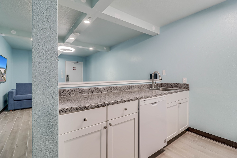 The room smelled very strong with mopping solution. The restroom door didn't have a lock. It would have been nice to have access to a broom to sweep away sand we tracked in. I was very surprised to be woken up by a team pressure-washing the sidewalk and sides of the building at 8:30 a.m., including our door and window. They lingered for hours.