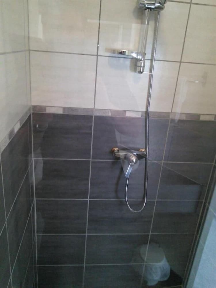 Chambre très agréable avec une déco sobre, côté cour (n°2) ; pas immense mais propre et confortable. Douche à l'italienne, WC séparés, bouilloire thé-café.