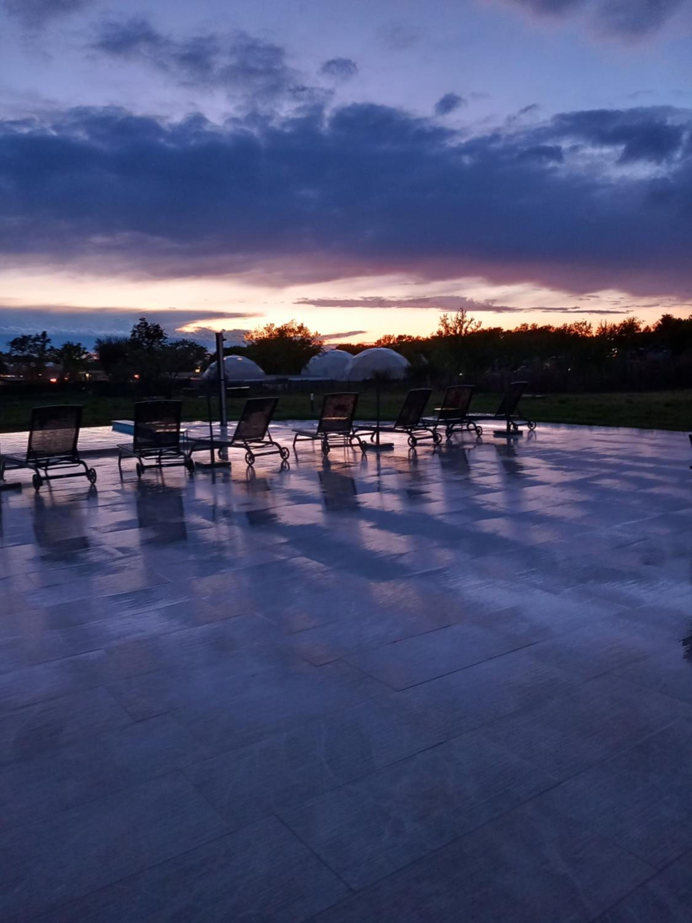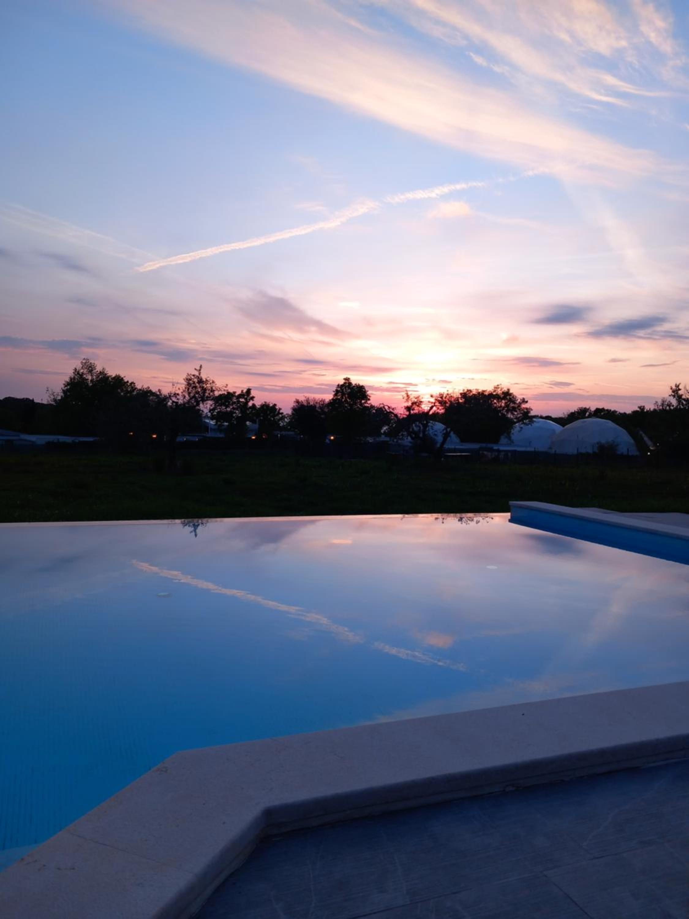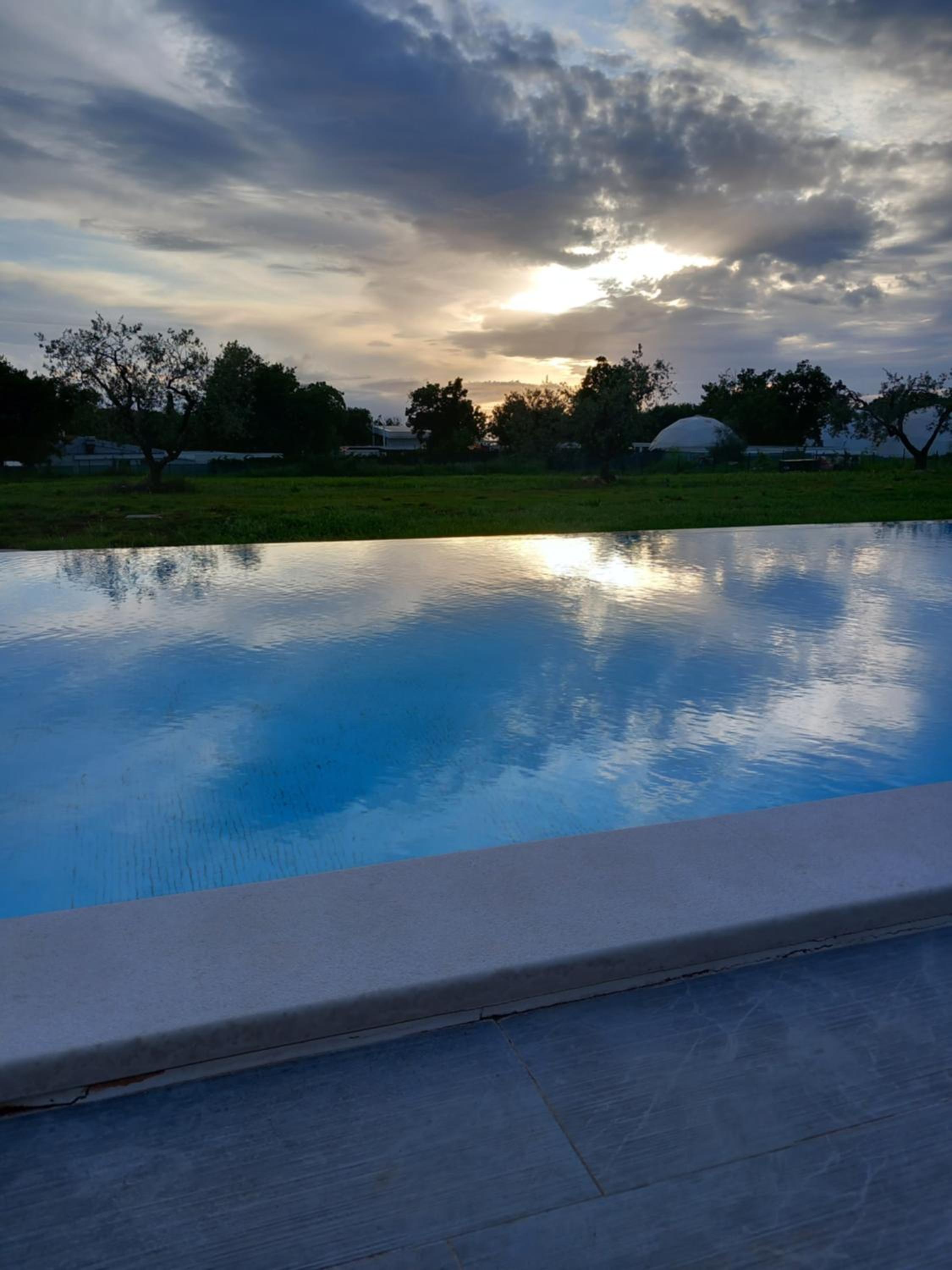 8 parasols aan het zwembad. 6 van de 8 zijn kapot.