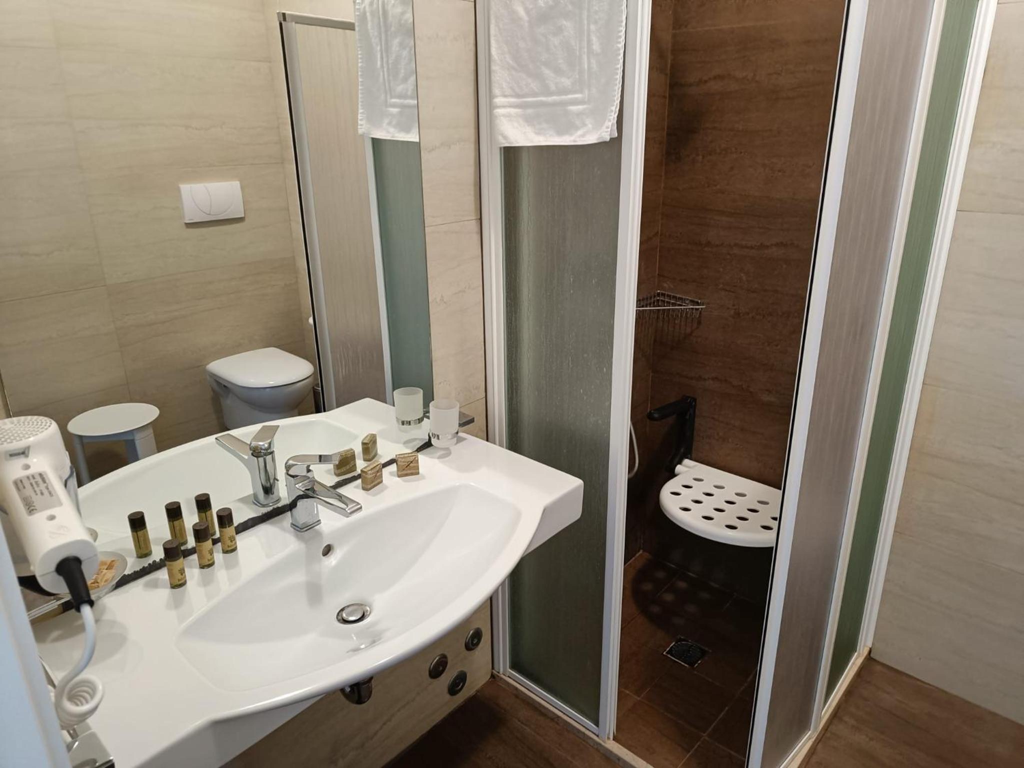 NIET parkeren in de garage van het hotel. Het is stijl en super glad. Het restaurant was gesloten, dus we kregen ontbijt op de kamer. Leek wel kamperen. De kwaliteit van het ontbijt was ook zeer bedenkelijk. Nog nooit zo’n slechte koffie gedronken in Italië. Een espresso in een mok 🤦🏻,… Hotel zou zeezicht hebben EN zicht op het zwembad. Met veel moeite konden we idd de zee zien. Helaas niet 4 sterren waardig.