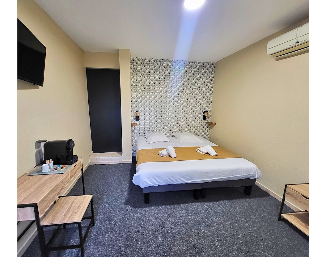 Inadmissible. Nous avons payé 204€ pour une nuit pour une chambre qui n’était pas du tout comme les photos. Ensuite des insectes dans la chambre. Le profit de douche ne tenait pas, posé sur le côté. Je n’ai pas pris toutes les photos mais j’aurais du. À l’entrée de l’herbe partout même pas nettoyer. Aucune lumière pour accédez à la chambre la nuit qui éteint derrière le restaurant comme si c’était des chambres pour les serveurs… honteux. Le bac à douche qui n’existe pas. À voir.. sur le battu comme ça. Nous ne pouvions pas poser nos affaires et serviettes, même pas un pose serviettes. Des wc qui coulent.. j’en passe je suis déçue et trouve ça inadmissible de se doucher et dormir dans cette chambre. De la moisissure aussi. Je pense que le patron est plus sur son restaurant et délaisse complètement l’hôtel.