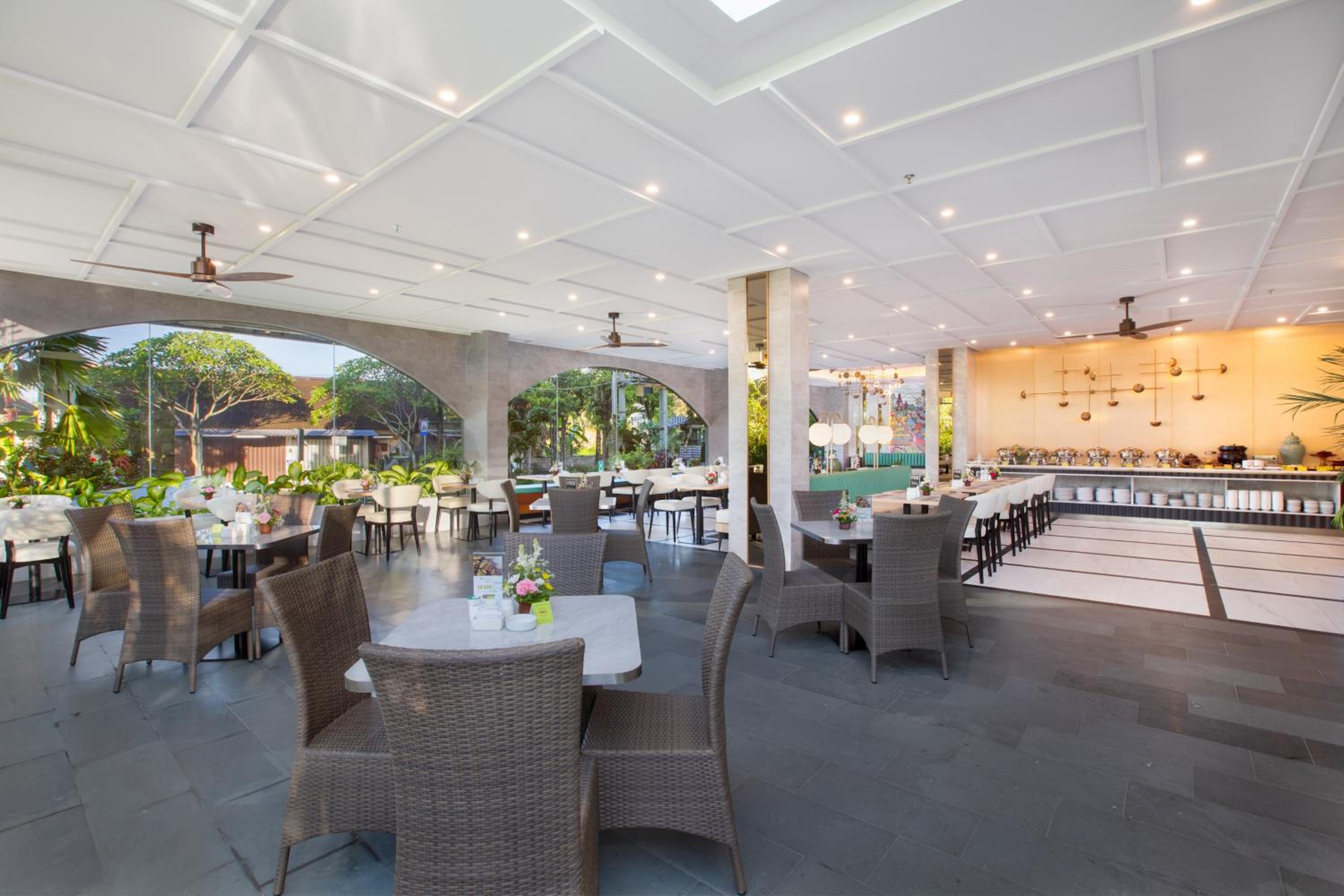 Guests can unwind by the outdoor swimming pool, surrounded by lush gardens and a tranquil terrace. The hotel also boasts a bar and a restaurant serving delicious American cuisine, perfect for enjoying a relaxing meal or refreshing drink.