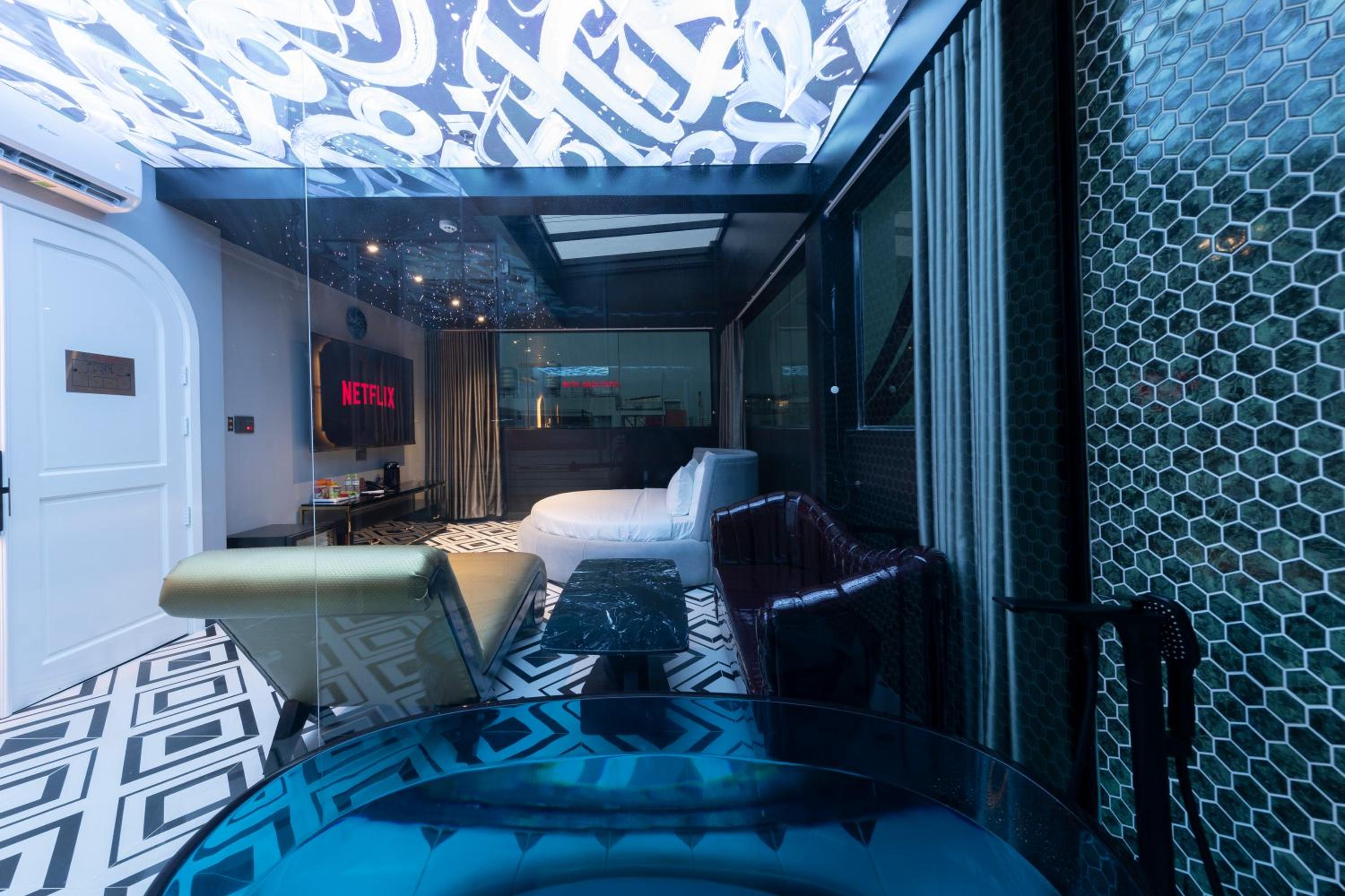 The interior design of the hotel was refreshing and far beyond the generally boring and sterile hotel rooms on offer generally. The room reflected an approach to fulfilment of a away from home feel that promoted a playful and enjoyable stay. Our room was equipped with a bathtub and shower with fitting that were carefully integrated into the comfortable general feel of the bathroom. Our room included a huge new cinematic screen with all the features imaginable and added to the homely feeling of being away. Many have commented on the soundproofing of the rooms but this was not at all apparent during our stay. Highly recommend this hotel which is located just 15 minuets from the main airport