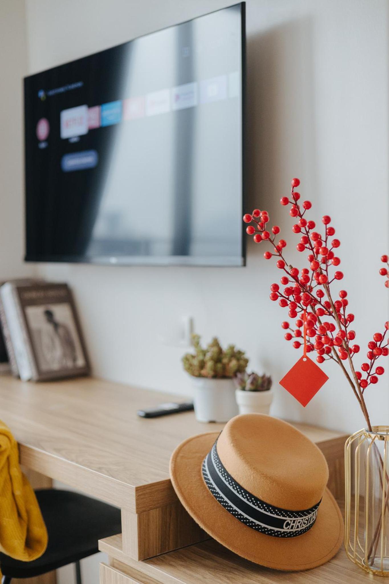 また、食事用のテーブルと作業机2つもあり、椅子も3脚。ベッドも大きい。テレビもストリーミング系みれます。