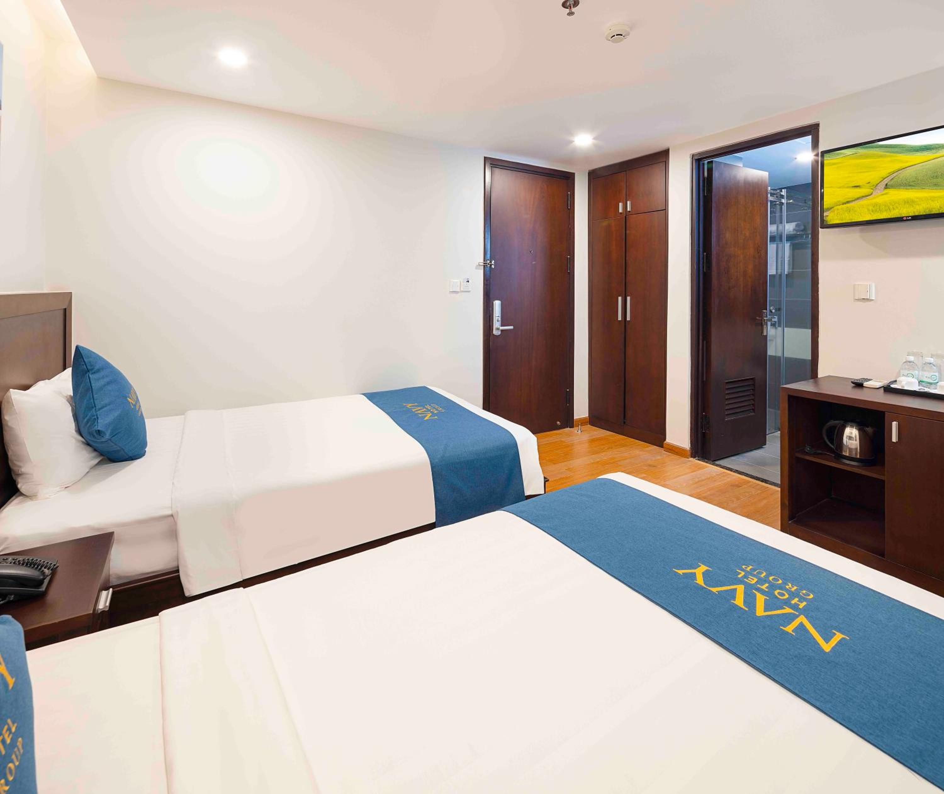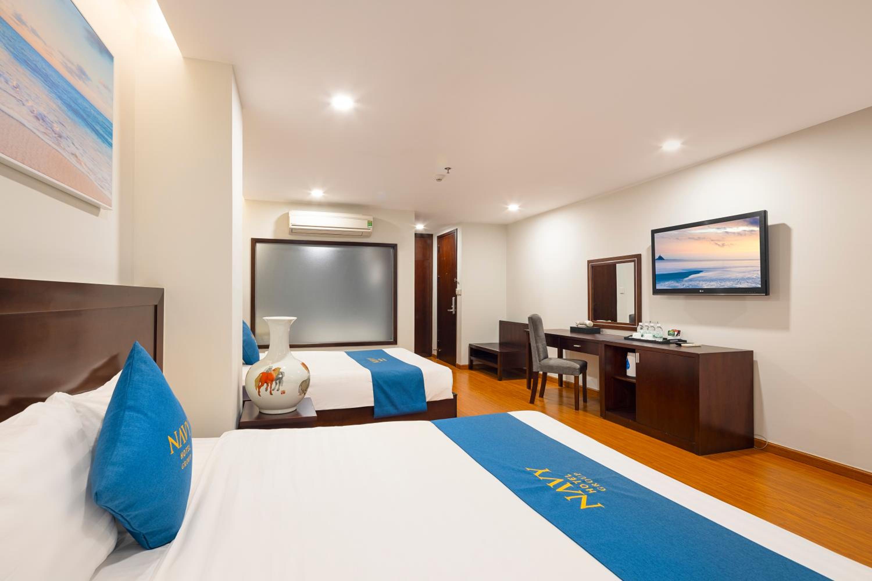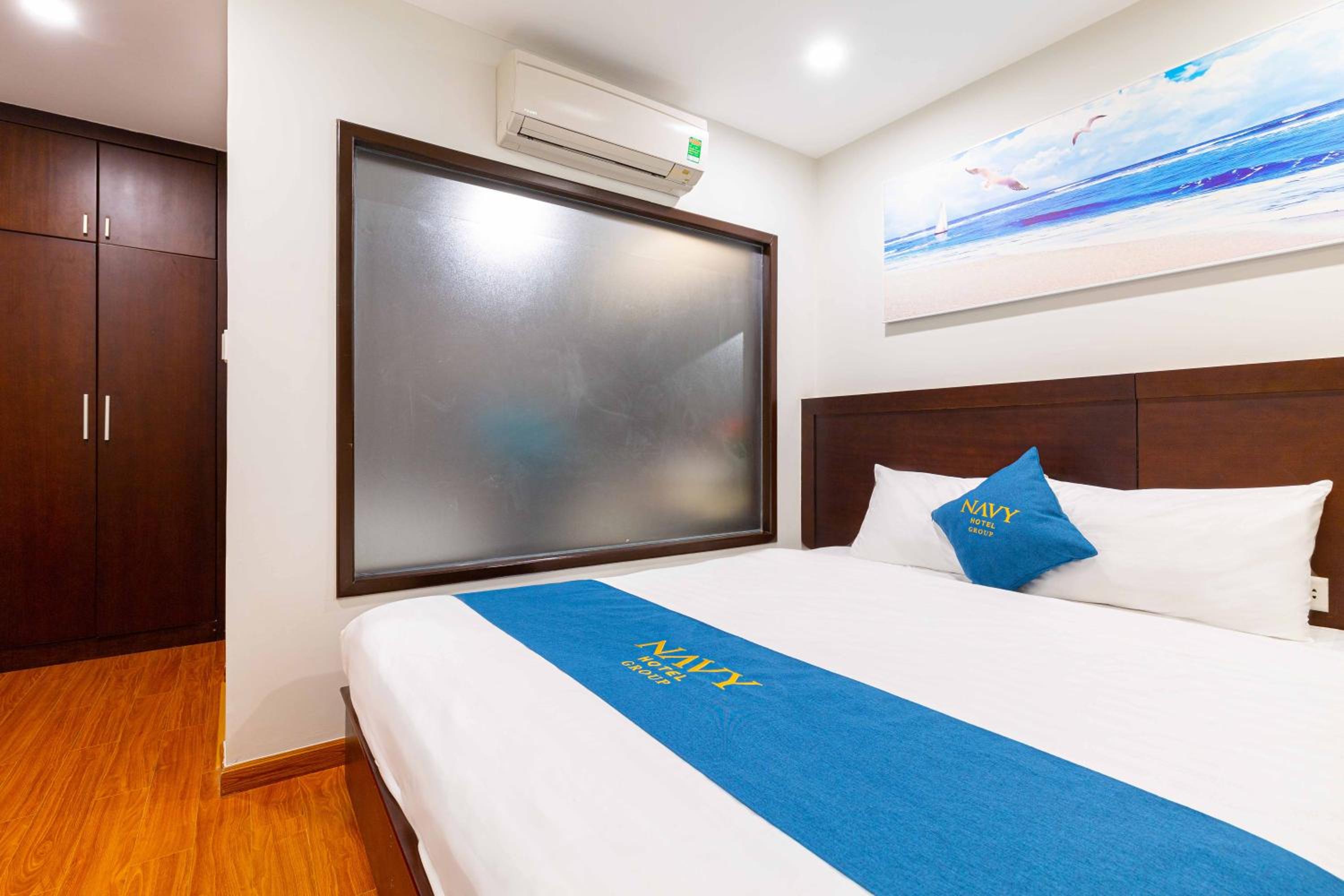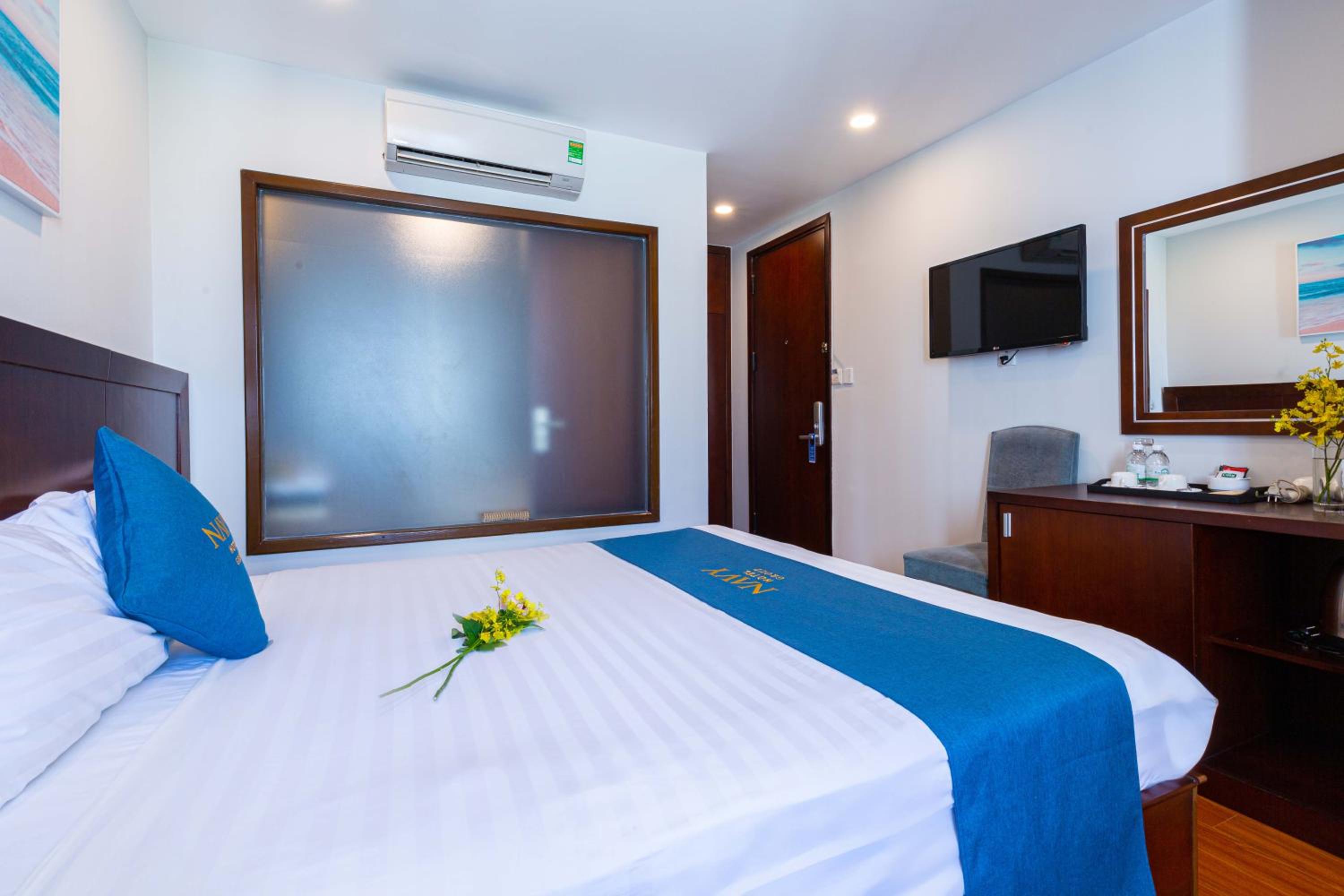 Navy Hotel Nha Trang offers air-conditioned rooms with modern amenities such as flat-screen TVs, minibars, and private bathrooms, ensuring a comfortable stay for guests.